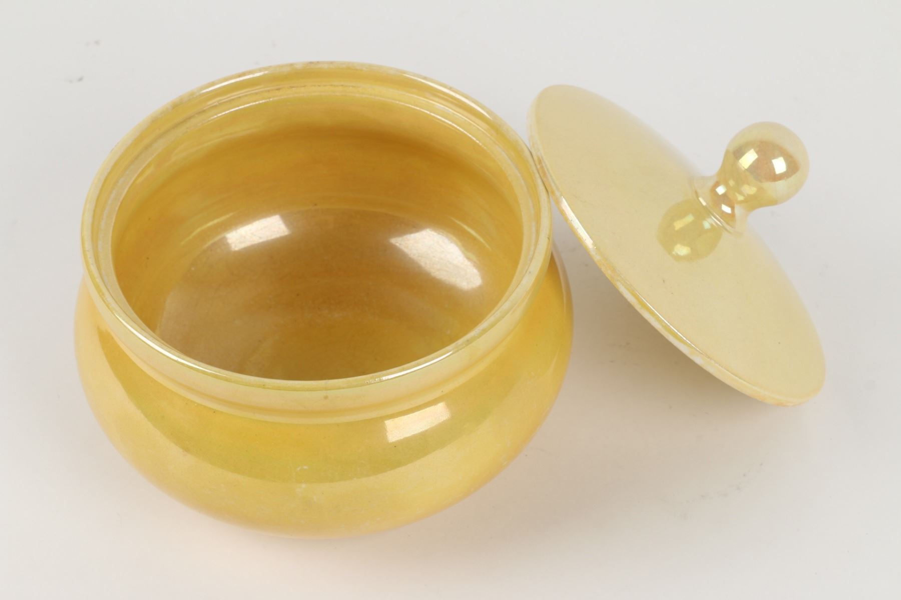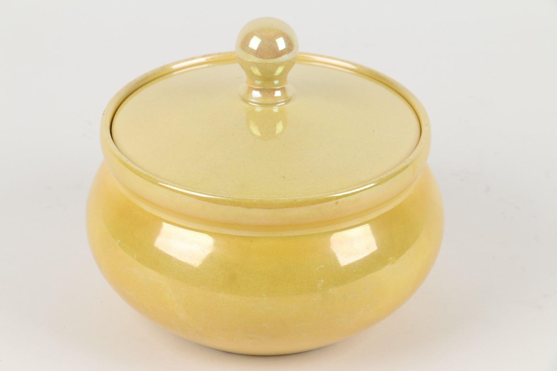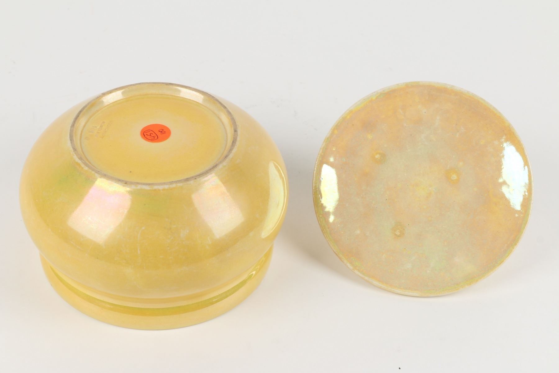 Lot 31 - Three (3) pieces. Circa 1916. English. Plain lustre glazes. All stamped "Moorcroft" on underside. 6.5" x 6.5" x 5", shakers 2.75" h. 6.5" x 6.5" x 5", shakers 2.75" h. One finial chipped at the top of one shaker. $100-200.