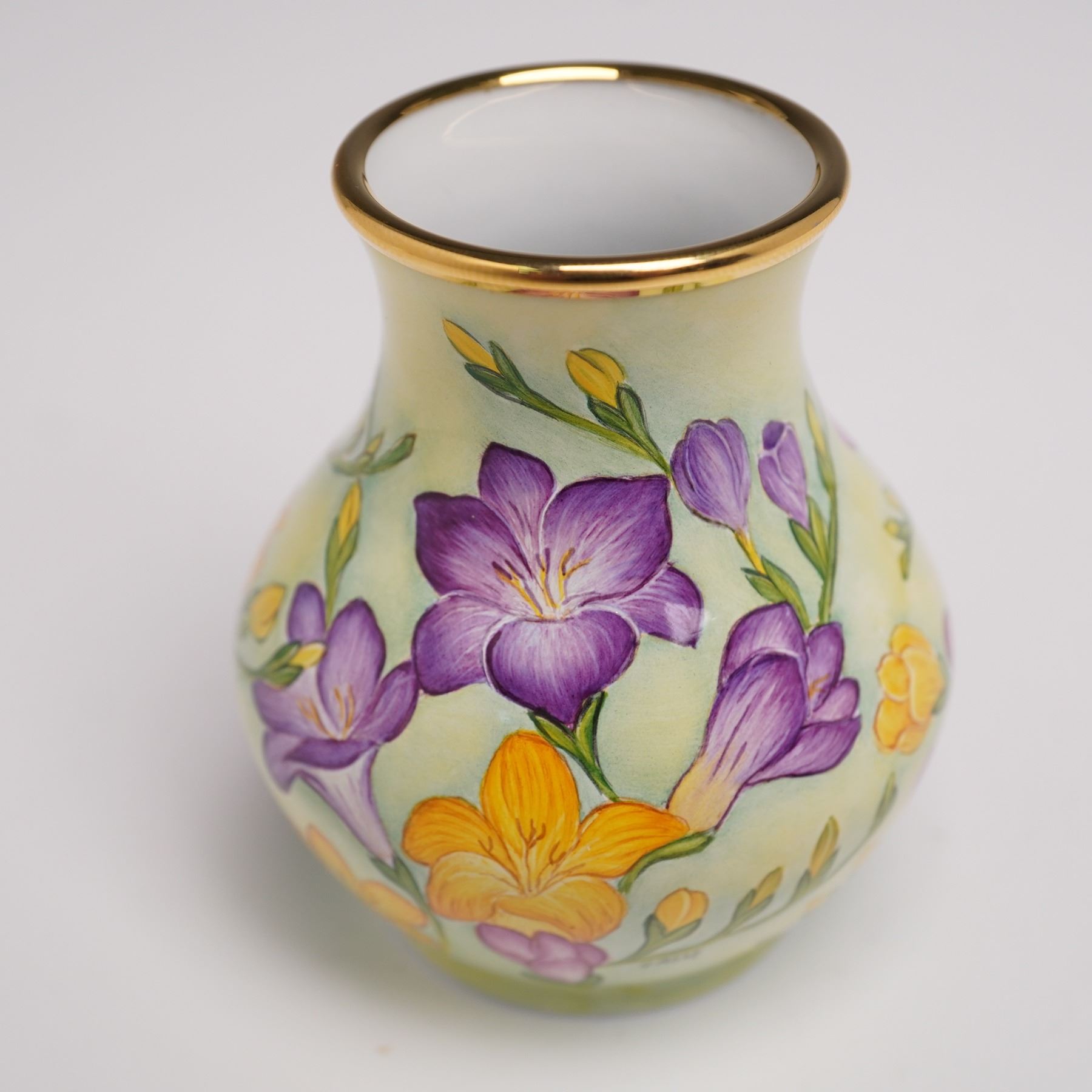 A delightful trial vase of baluster form with gilt-rimmed mouth, decorated in vibrant enamels with a profusion of freesias in purple, yellow, and orange upon a pale ground. Signed "Trial A. Rose". Marked "WM", "01" and monogram for the year. Moorcroft backstamp. This item has its original box.