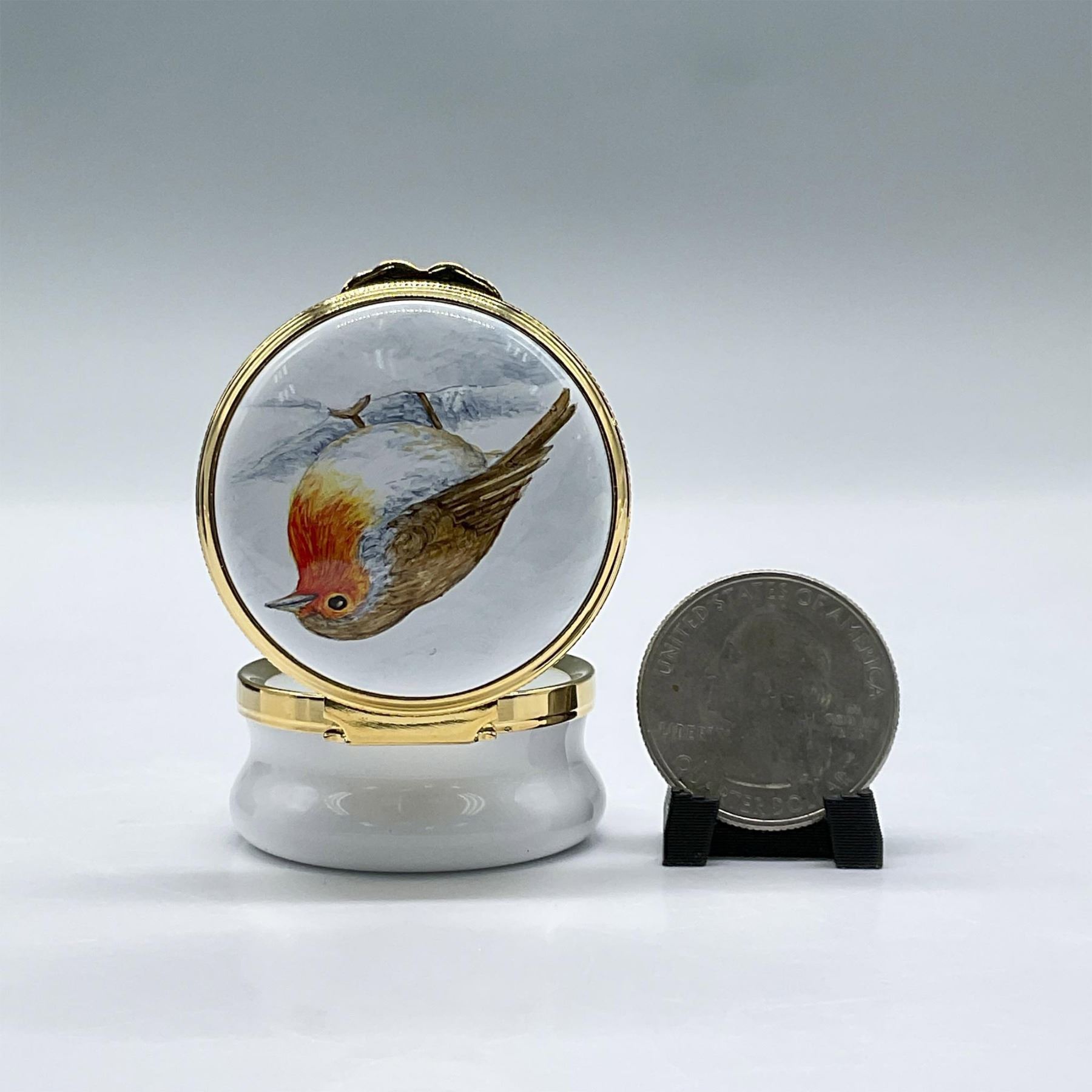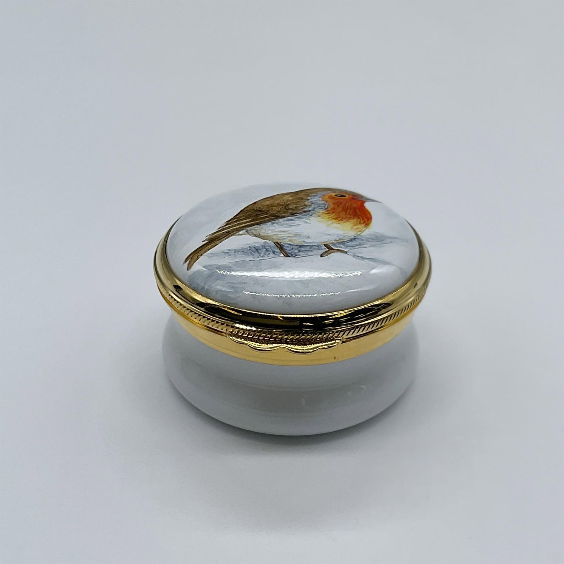 An adorable miniature white enamel box with a hand painted robin and golden accents. This item has its original box measuring 3.25"L x 2.75"W x 1.75"H. Moorcroft backstamp.