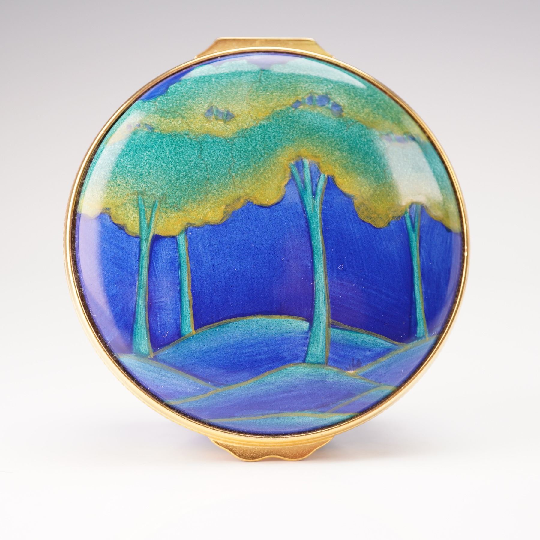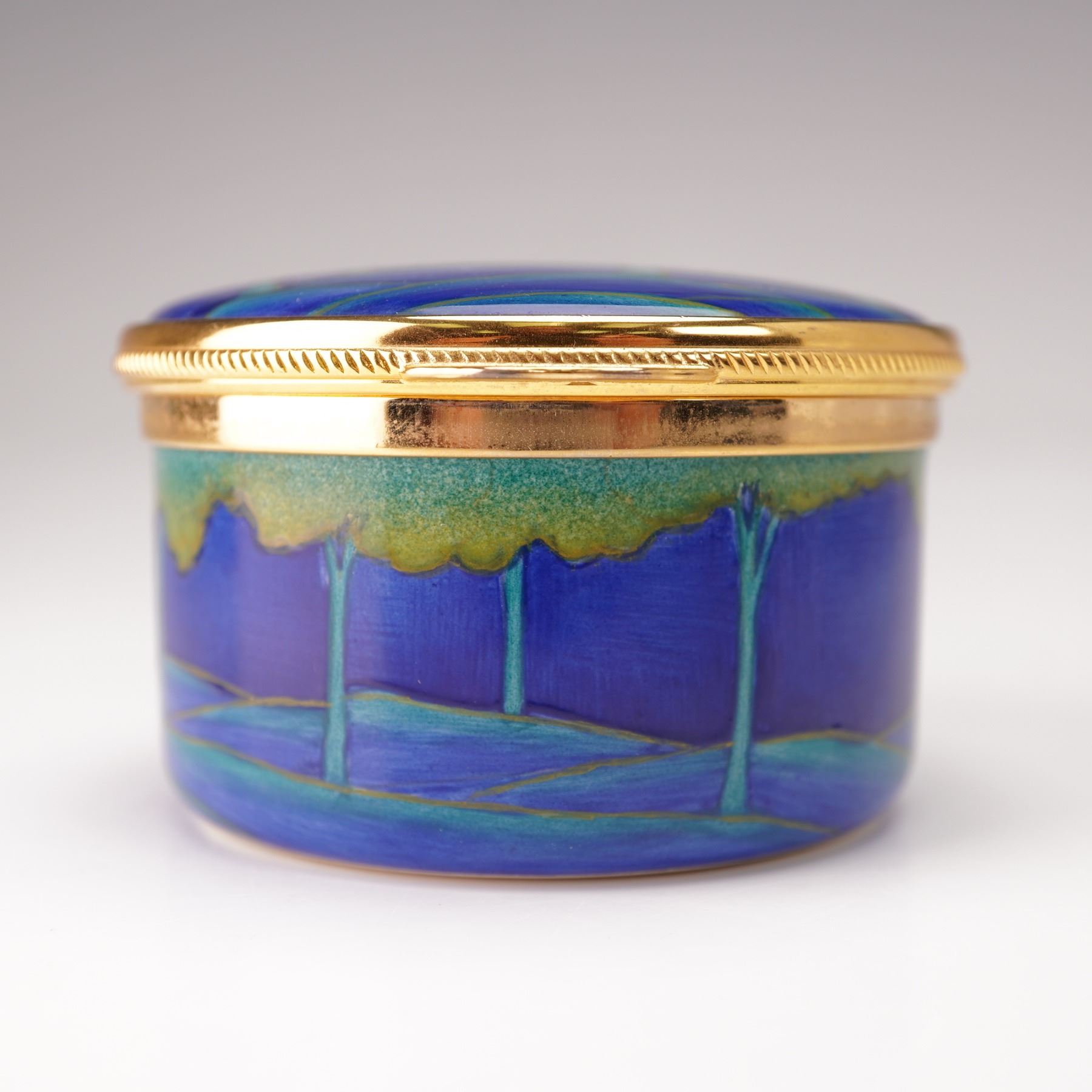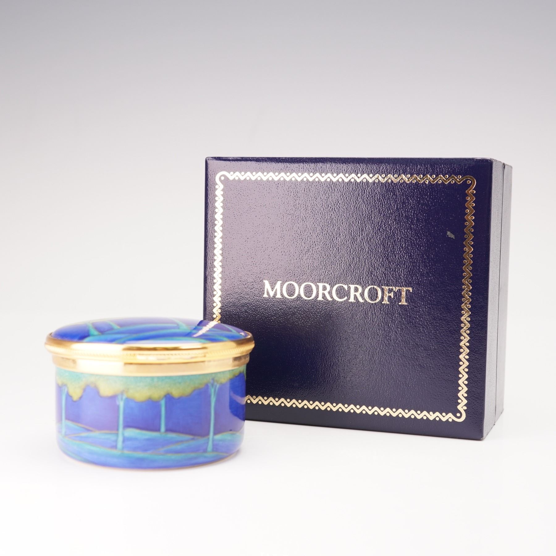Circular lidded enamel pot decorated in the "Moonlit Blue" pattern. The domed cover and body depicting stylized trees beneath a graduated cobalt sky, mounted with gilt metal rims. The interior of the lid painted with a matching motif. "Signed JHC" to underside. Moorcroft backstamp. This item has its original box.