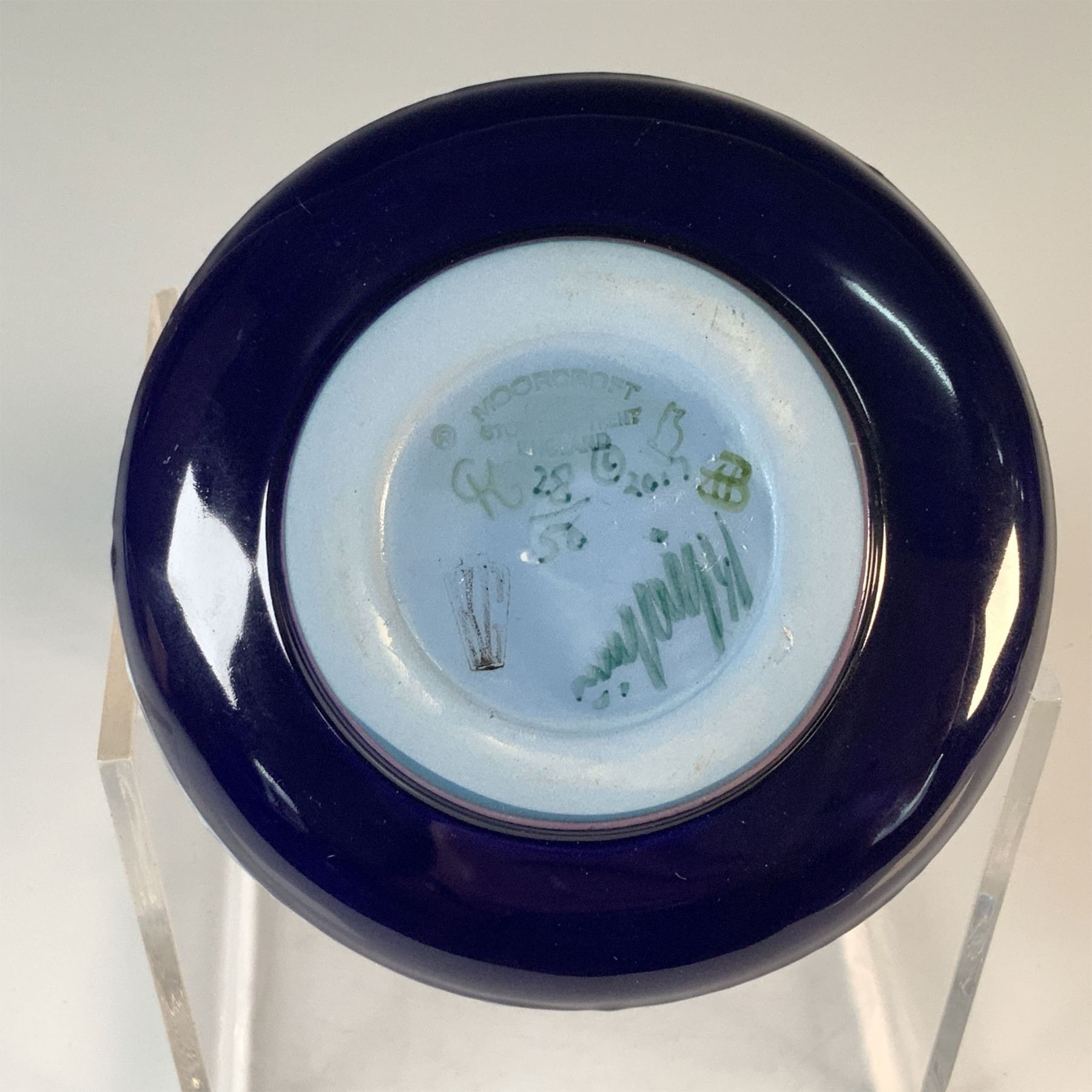 This Moorcroft Florian Ware vase showcases the iconic hand-painted floral motifs that define the Florian Ware series. Crafted from fine pottery, the vase features vibrant blue hues with intricate tube-lining details, characteristic of Moorcroft's distinctive style. This piece reflects the artistry of Moorcroft, a celebrated English ceramics manufacturer known for its exceptional craftsmanship and innovative designs. William Moorcroft introduced the Florian Ware line in 1898 during his tenure at James Macintyre & Co. The designs drew inspiration from the Art Nouveau movement, emphasizing organic forms and flowing lines. Pieces from this era are highly sought after by collectors for their artistry and historical significance. Signed by artist.