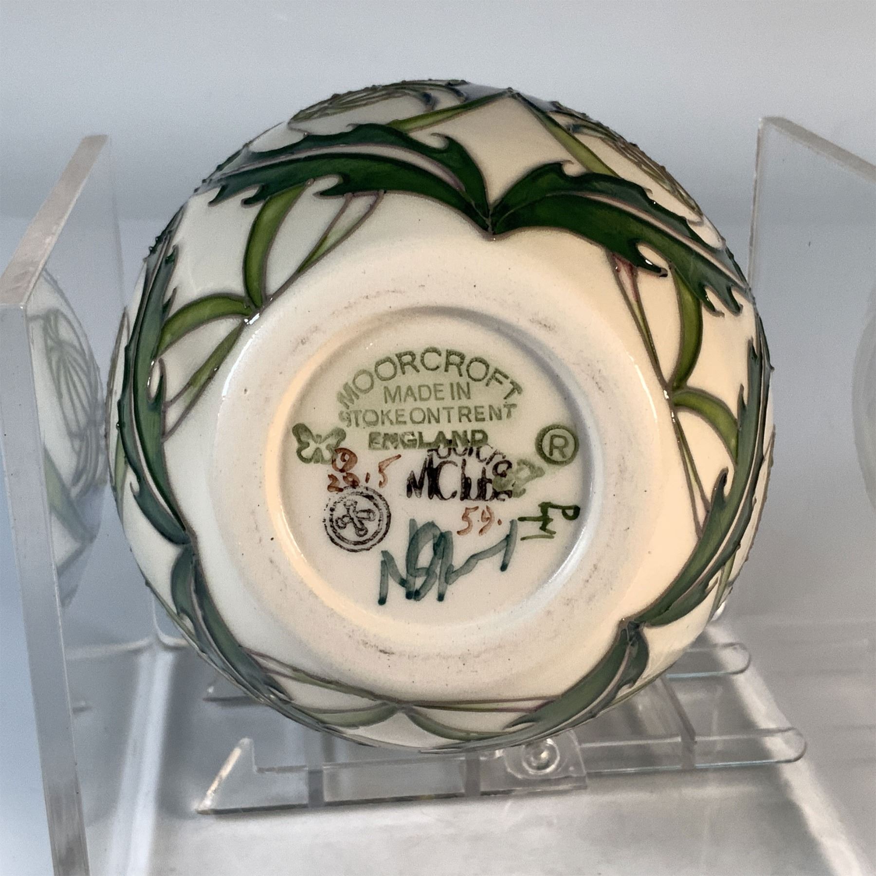 This Moorcroft Golden Ray vase features a radiant design of golden sunbursts complemented by warm tones of orange, yellow, and brown, all hand-painted with Moorcrofts signature tube-lining technique. The bold design is beautifully contrasted against a deep green background. Signed by the artist, this vase is a testament to Moorcrofts enduring legacy of craftsmanship and design excellence. The Golden Ray design reflects Moorcrofts commitment to blending natural inspiration with artistic expression, a hallmark of their work since the late 19th century. Signed pieces like this are particularly prized by collectors for their individuality and authenticity.