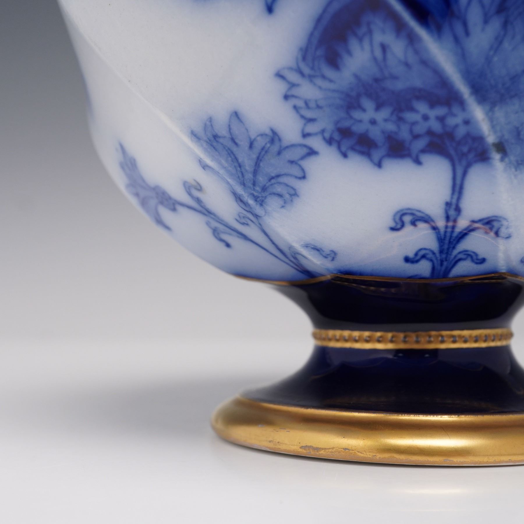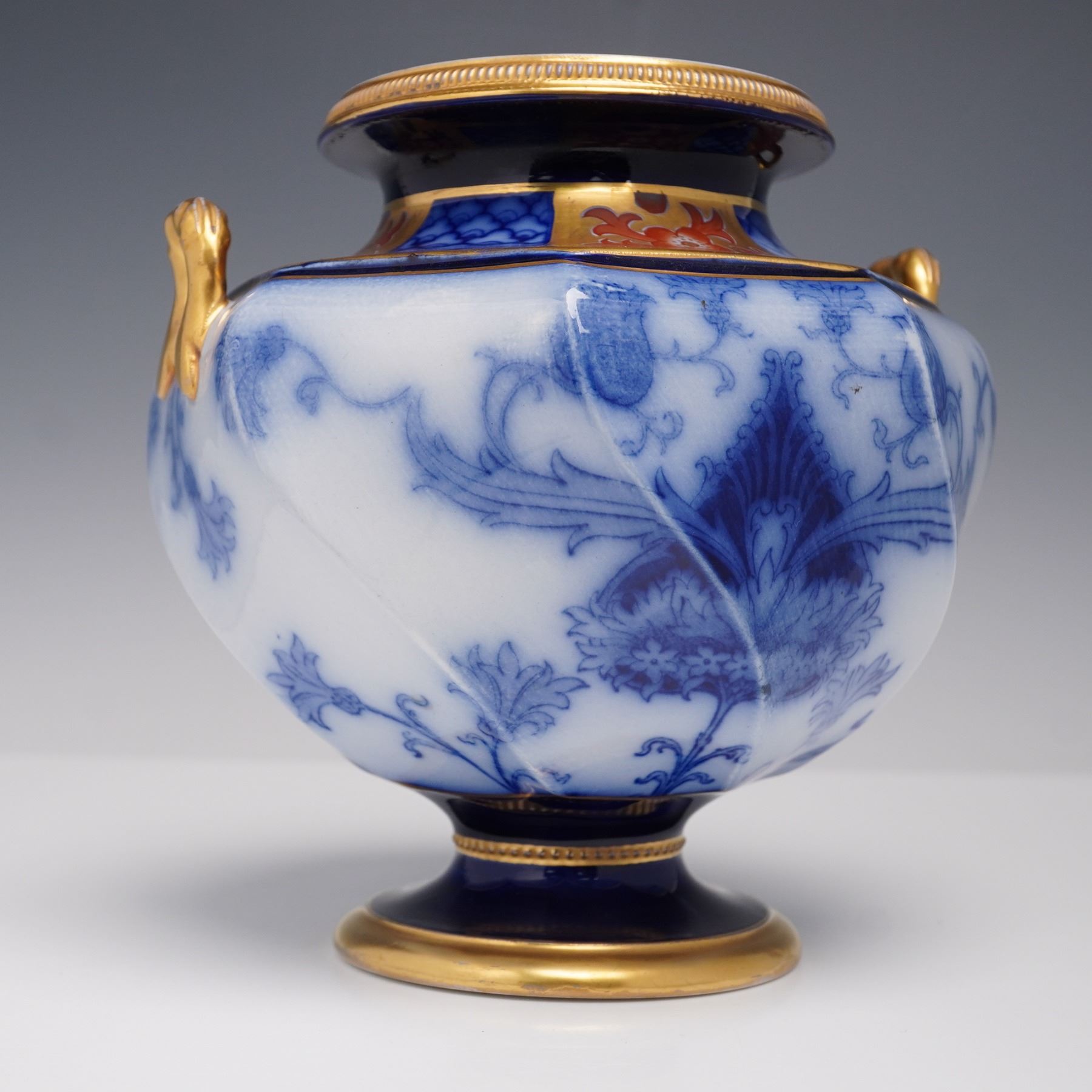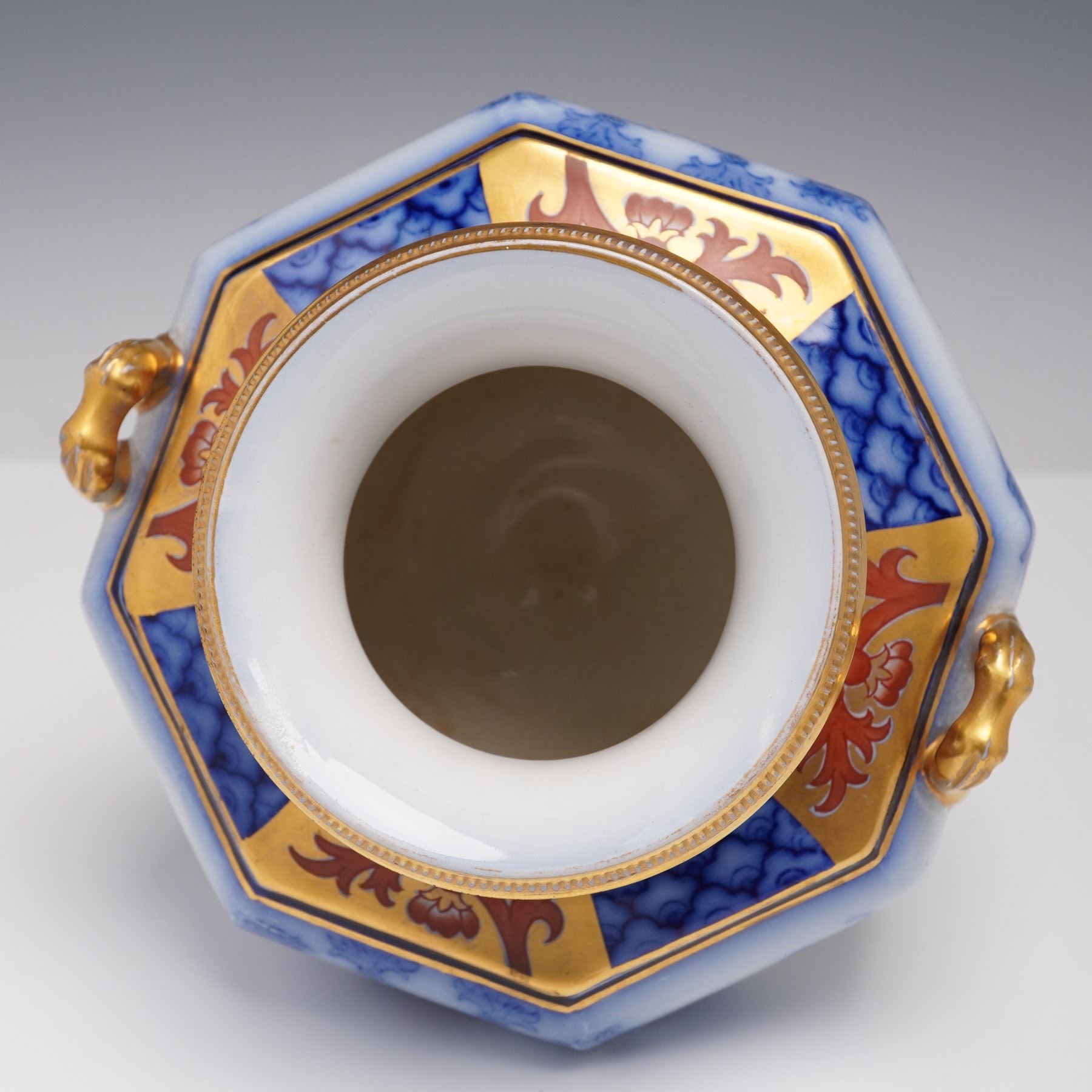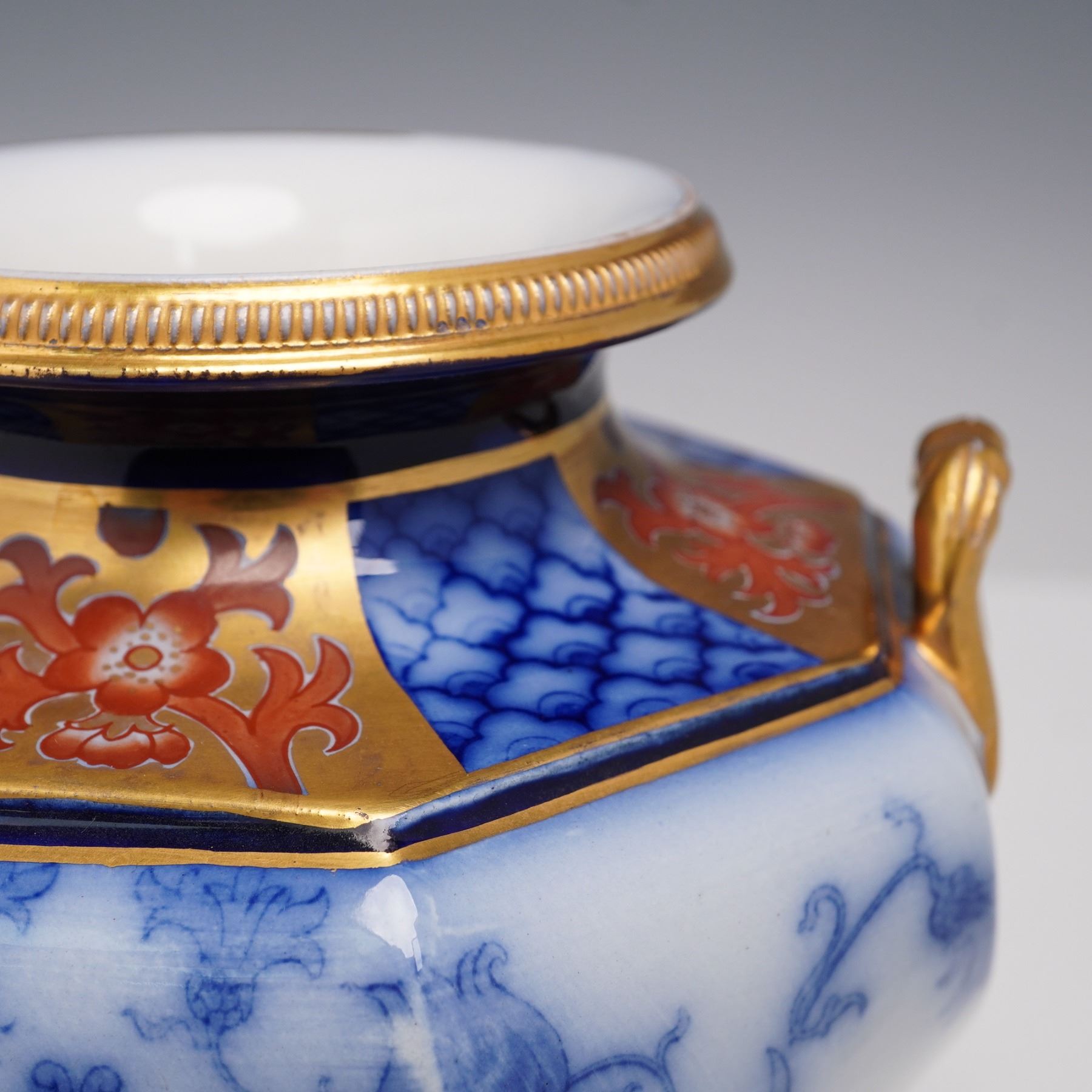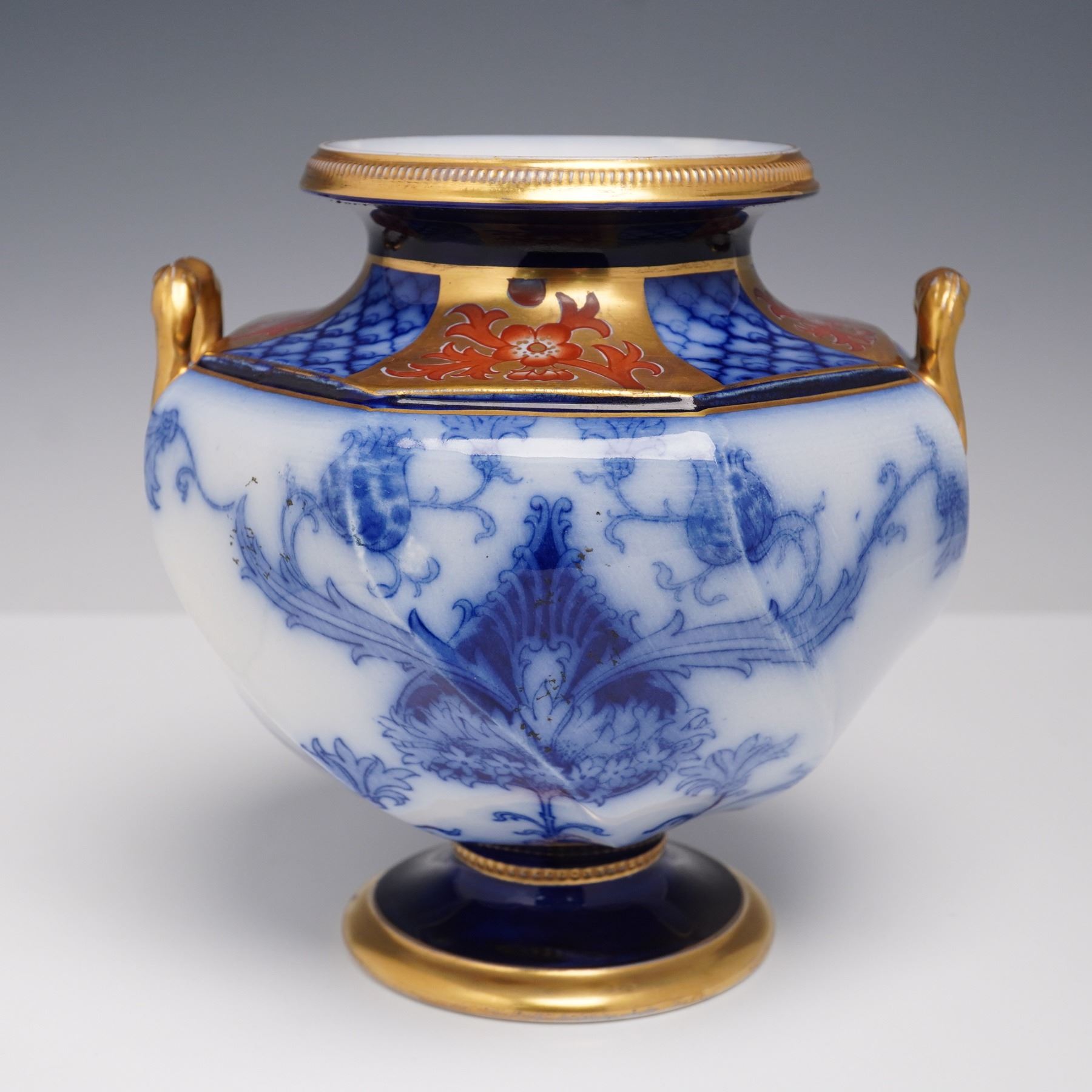 An exceptional Moorcroft Macintyre Aurelian vase, richly decorated in cobalt blue with intricate gilt and red Imari-style embellishments. The baluster form is enhanced with handles and a bold octagonal shape, with the surface featuring a combination of transfer-printed foliate motifs in underglaze blue and hand-applied gilding. The Aurelian line, produced by James Macintyre & Co. under the artistic direction of William Moorcroft in the late 19th century, is celebrated for its lavish use of gilding and dramatic designs inspired by Oriental influences. The underside bears the Macintyre backstamp,. A fine example of early Moorcroft artistry, this vase captures both the technical skill and aesthetic flair that define the Aurelian series.