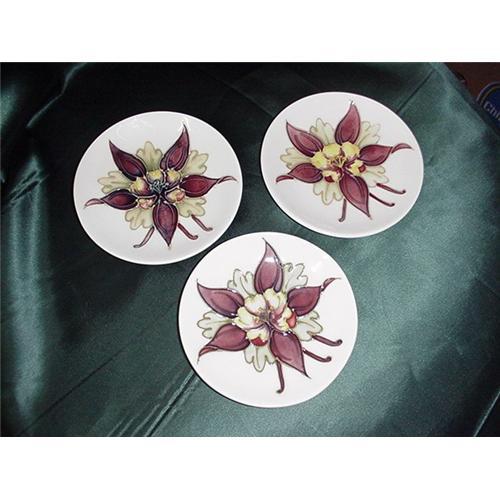 </font></strong>Three Moorcroft plates. Marked, " Moorcroft made in England." 4 1/2" in diameter" </font>