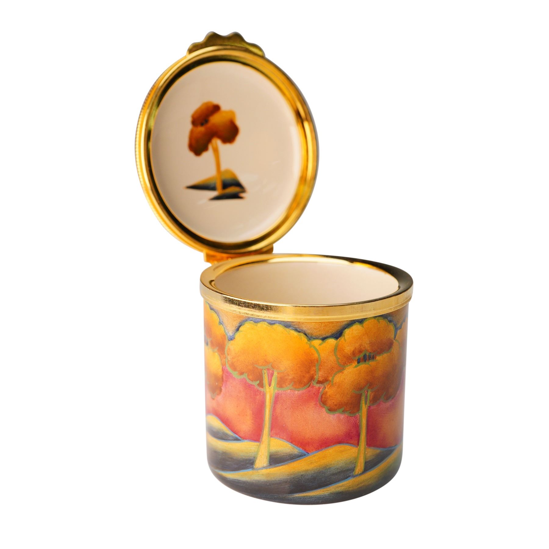 A charming Moorcroft enamel jewelry box decorated with the vivid Golden Trees design. The box features glowing sunset shades of orange, gold, and deep blue, accented with gleaming gilded metal mounts. Inside the lid, a single stylized tree adds an artistic touch. Moorcroft backstamp. This item has its original box. Box measures: 3.5"L x 3.25"W x 2"H.