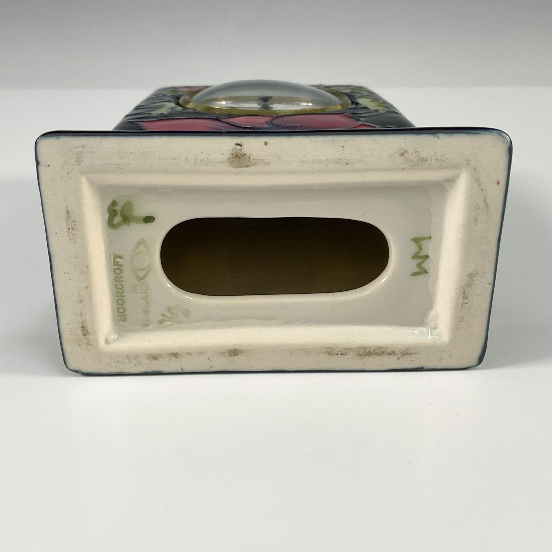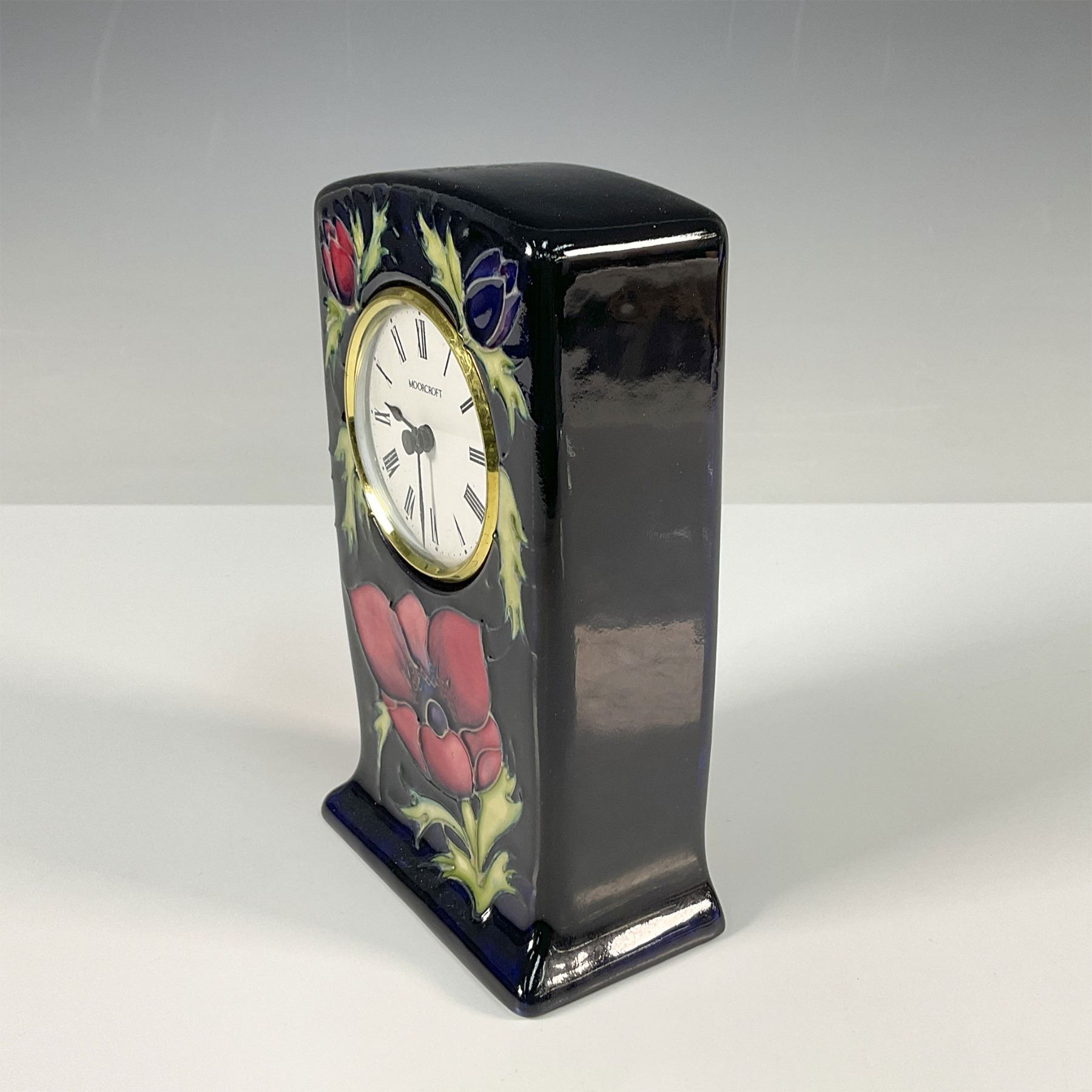 A stunning Moorcroft desk clock featuring the iconic Anemone pattern. The vibrant red and purple flowers with lush green foliage are hand-painted and outlined in Moorcroft's signature tubelining, set against a rich cobalt blue background. The clock face includes Roman numerals with a gold-tone bezel, adding elegance to its functional design. Moorcroft marked.