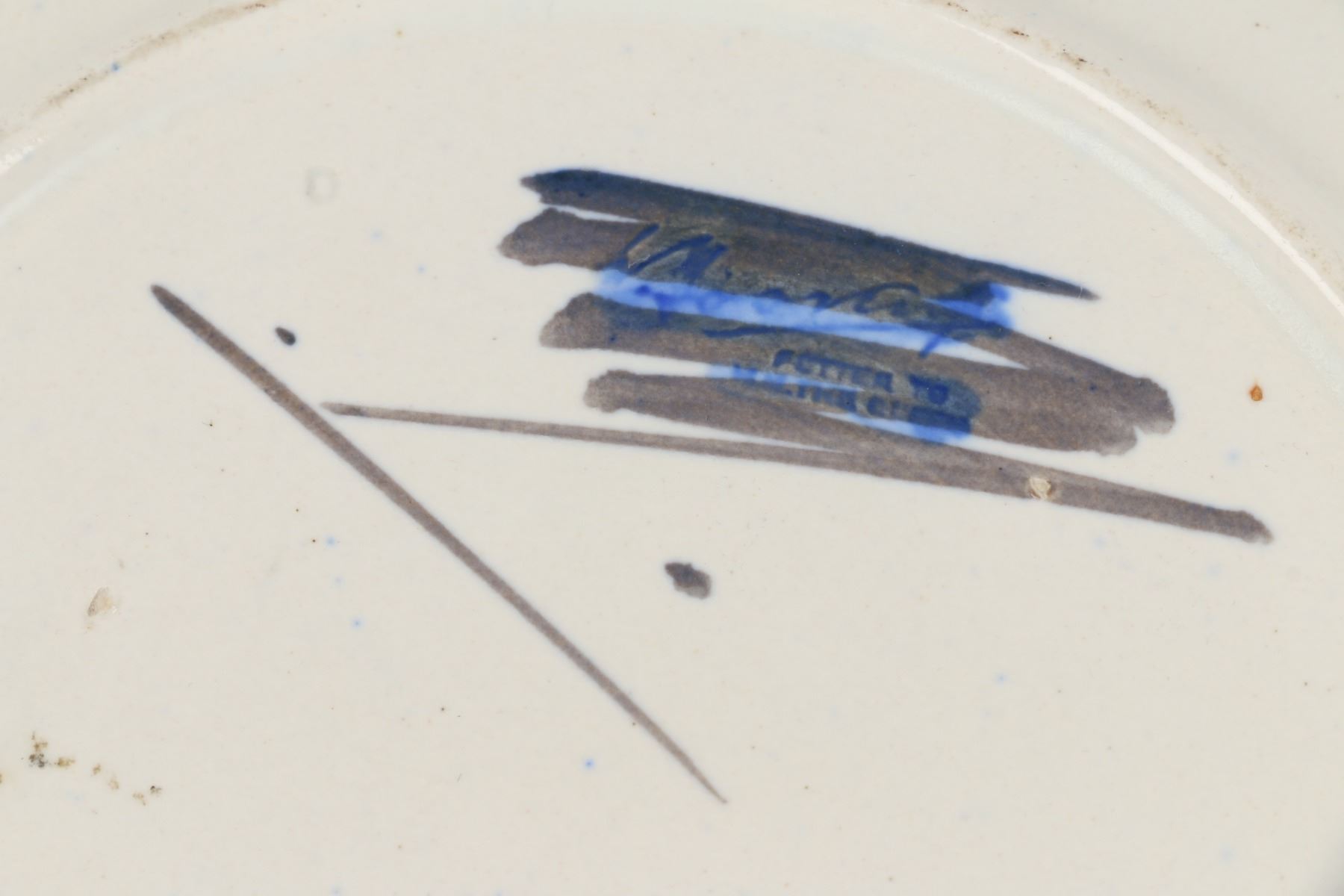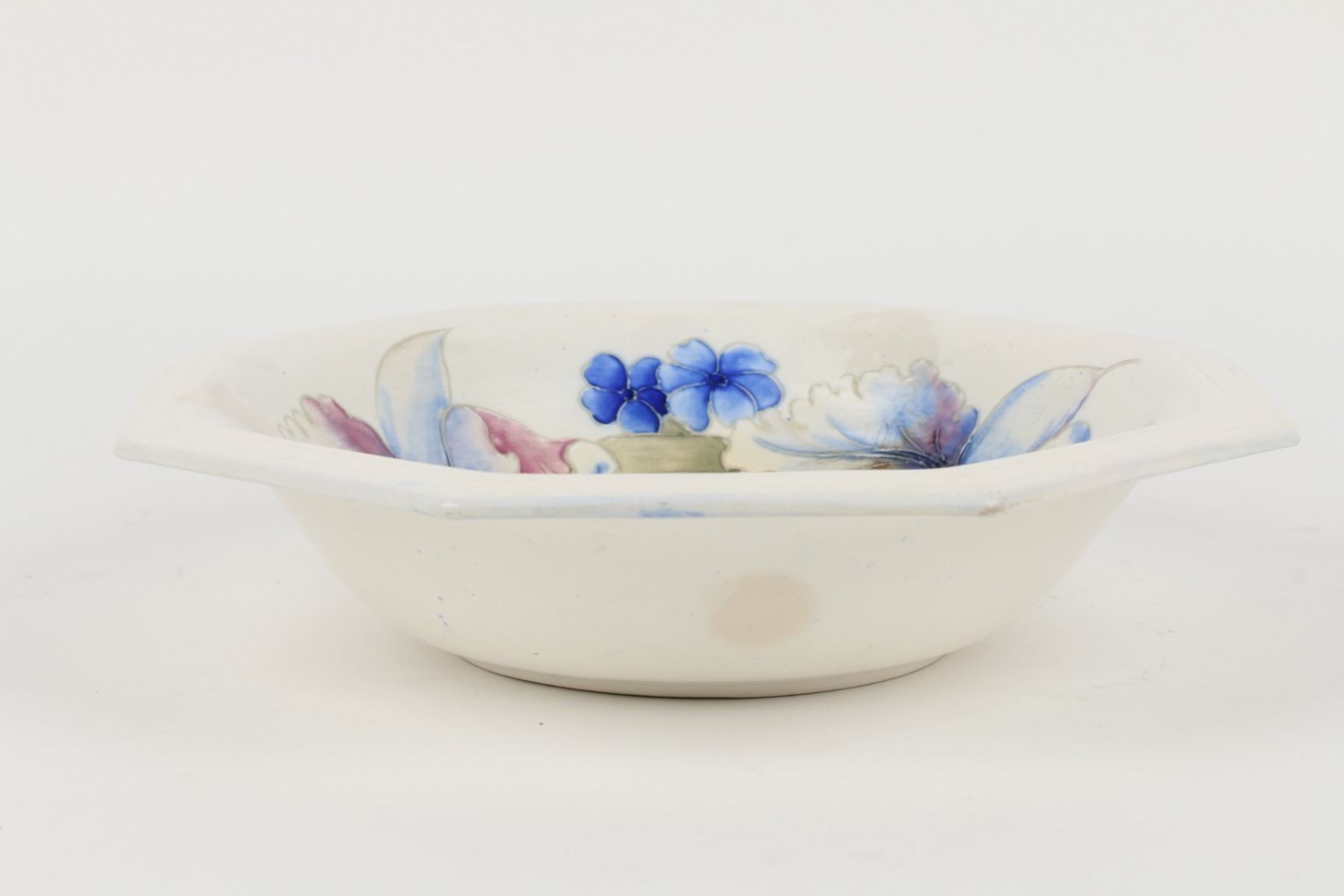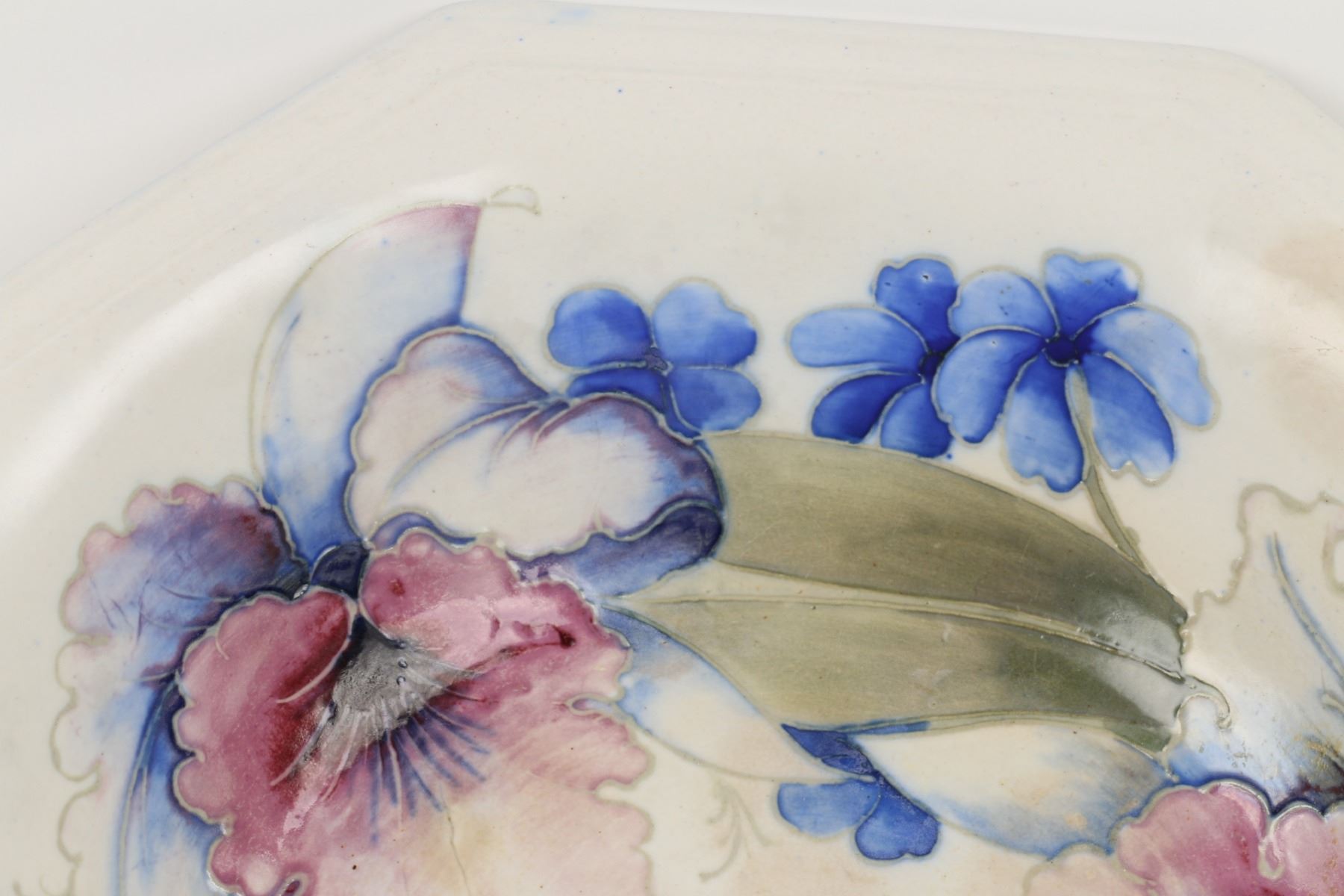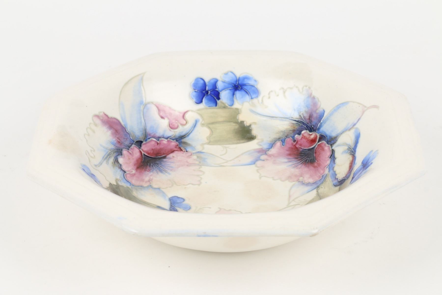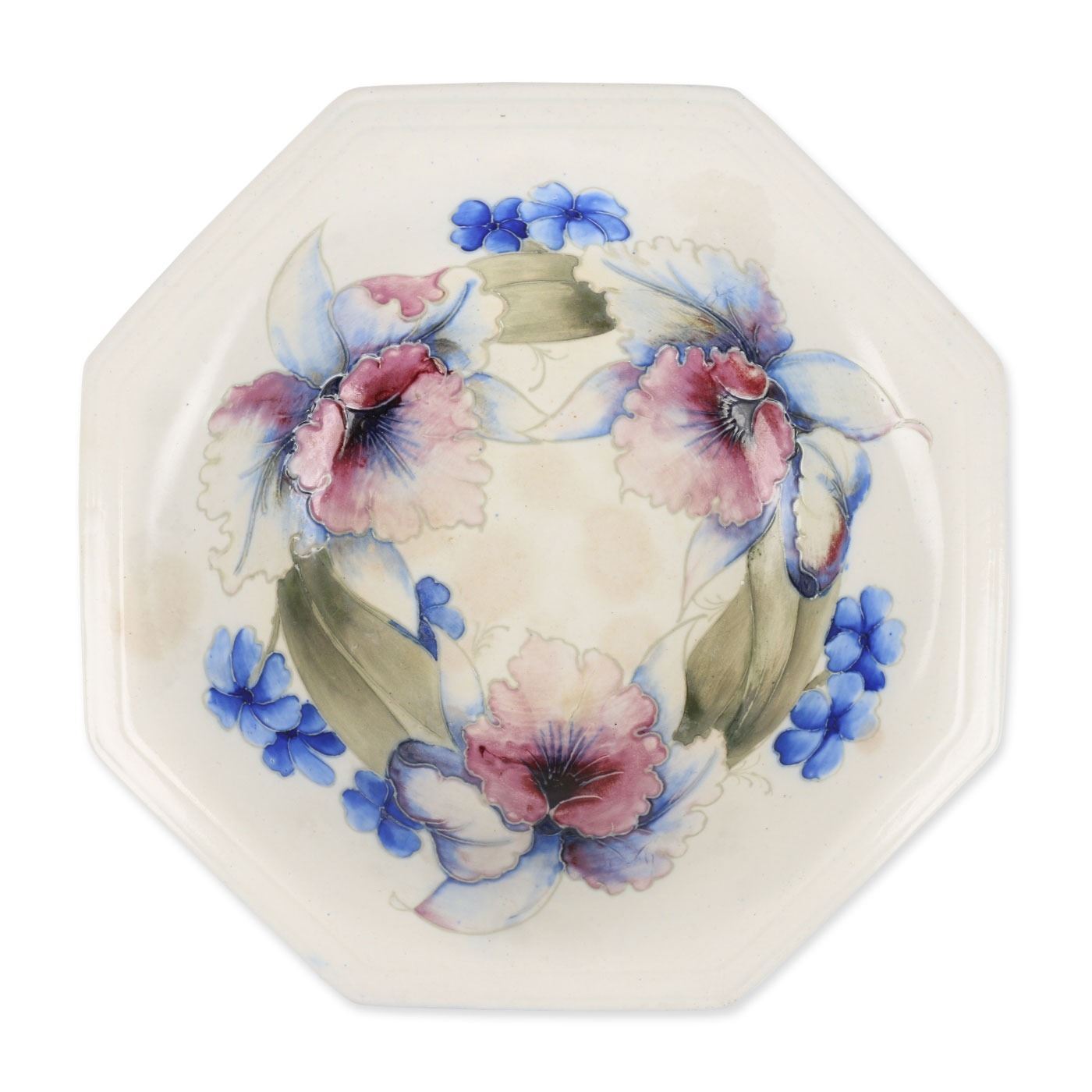 Lot 30 - English. "Orchid and Spring Flowers" pattern. Hand signed, stamped "Moorcroft - Potter to HM The Queen - Made in England" underside. Minor surface soiling penetrates the glaze. 10" x 10" x 2". $100-200.