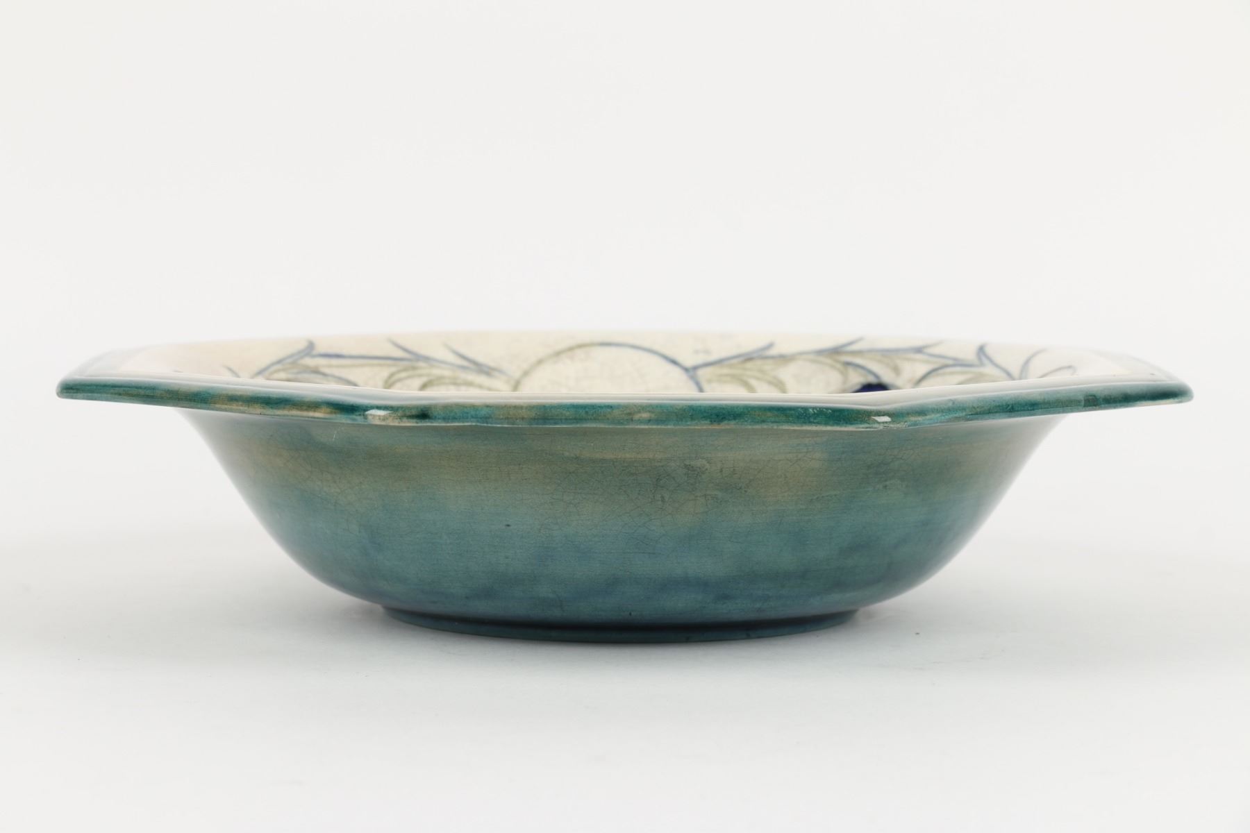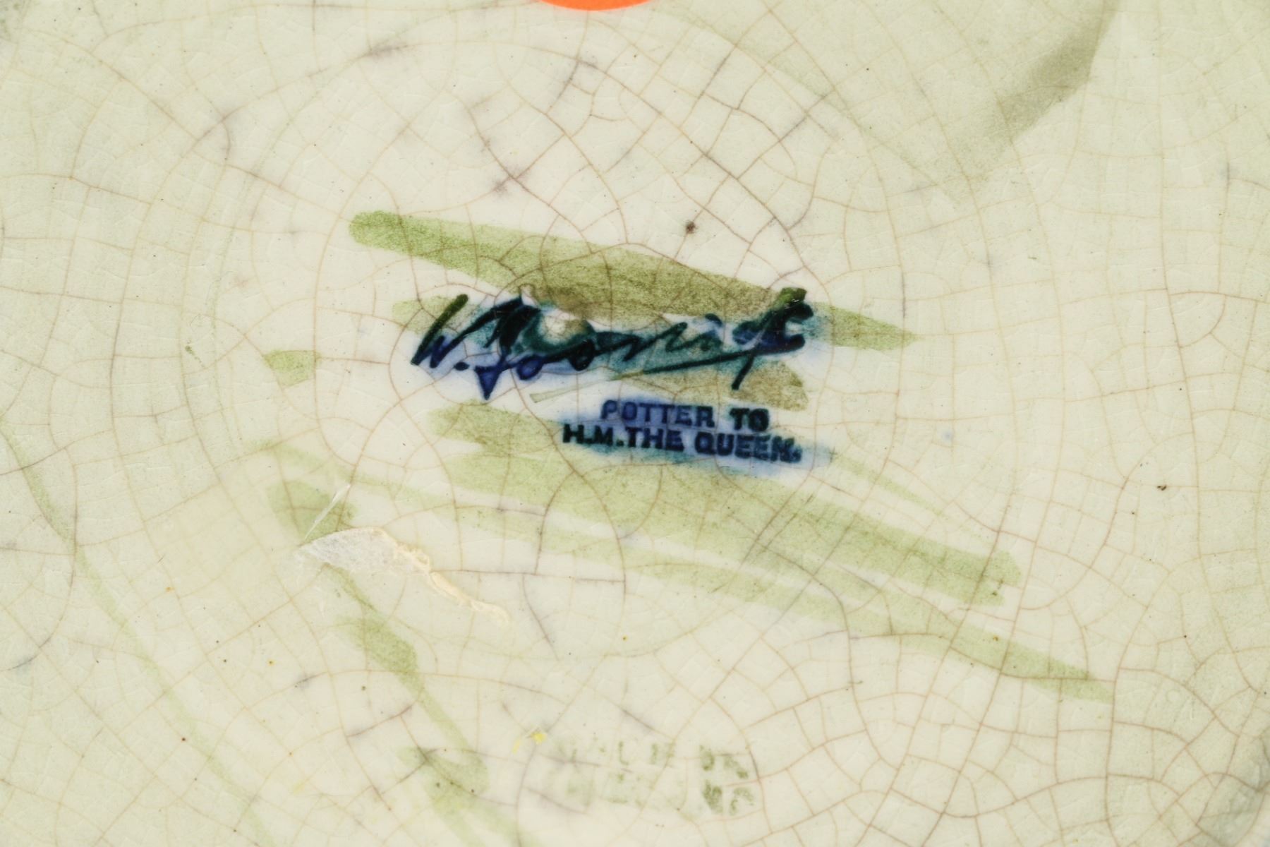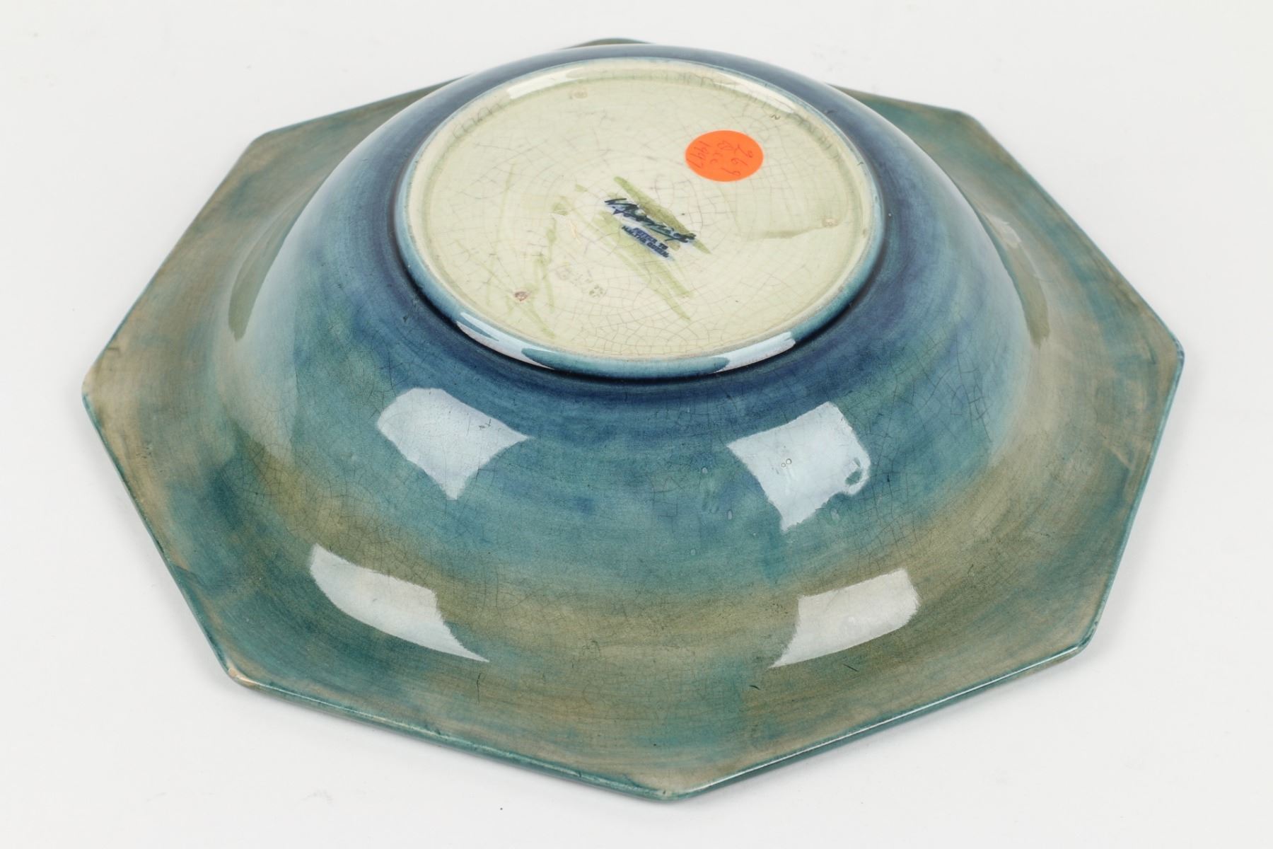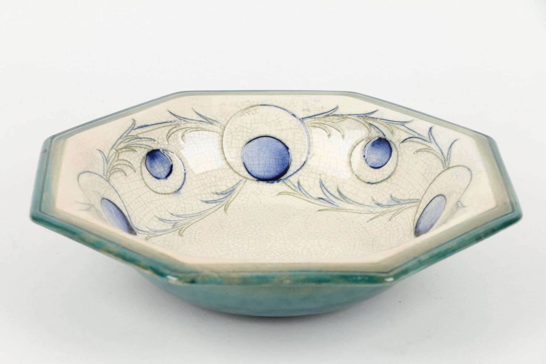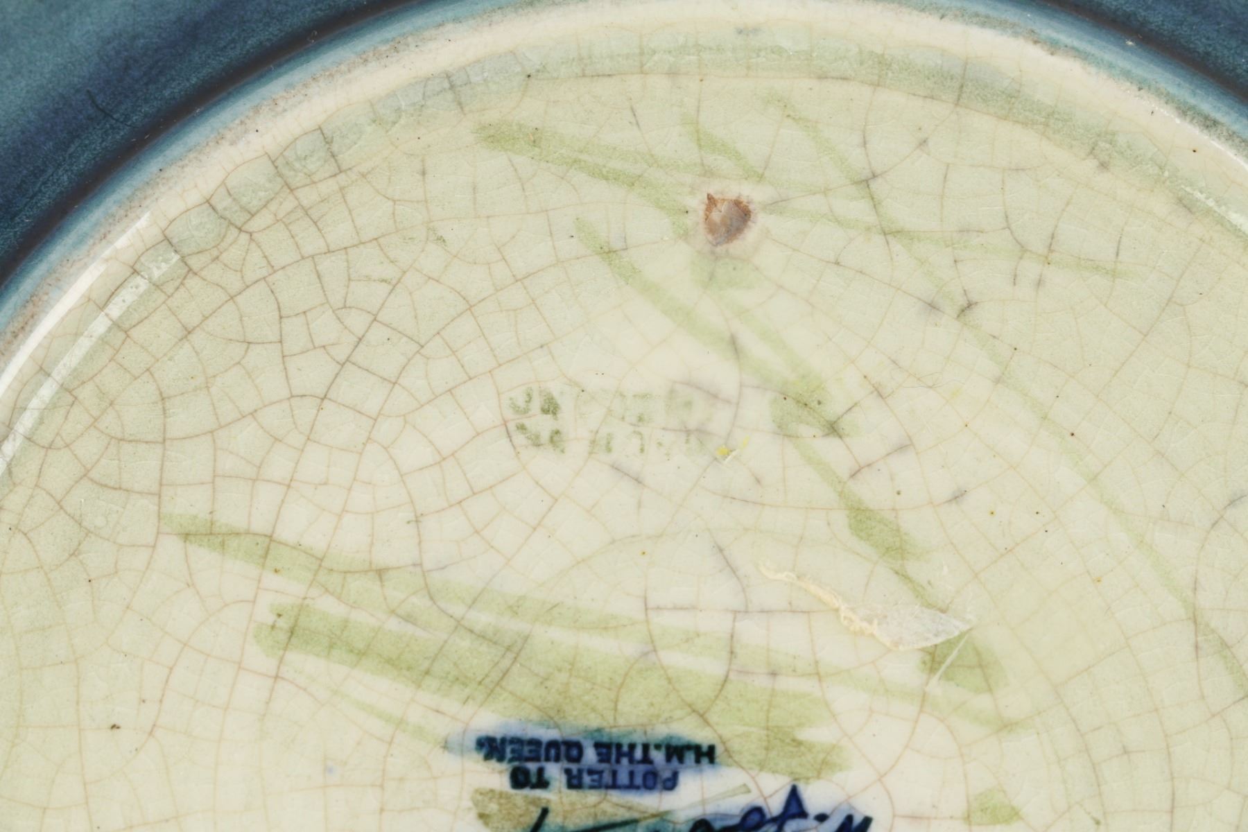 Lot 391 - Circa 1935. English. "Art Deco Peacock Feathers" design. Hand signed, stamped "Moorcroft - Potter to HM The Queen - Made in England" underside. 10" x 10" x 2". Heavily crazed glaze. $100-200.