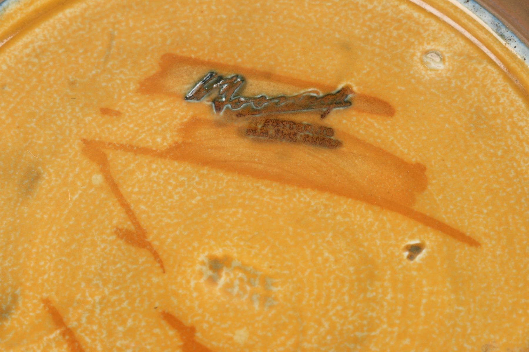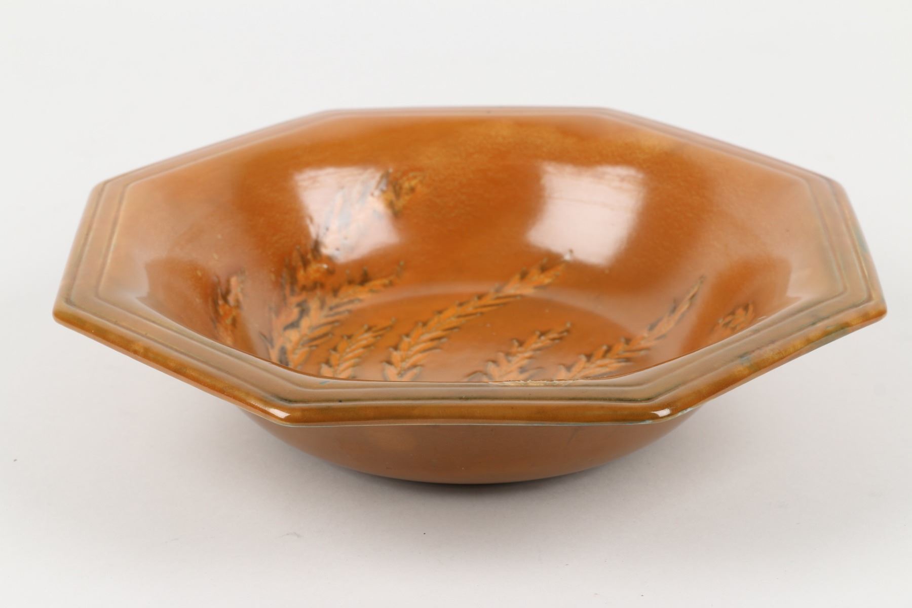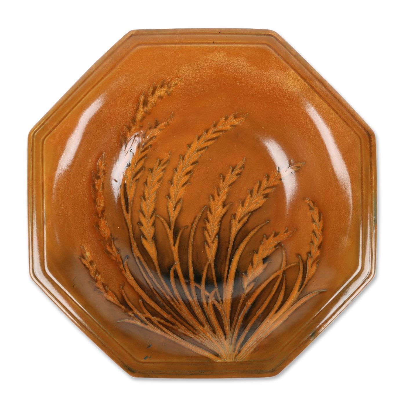 Lot 392 - Circa 1940. English. "Waving Corn" design. Hand signed Moorcroft, stamped "Moorcroft - Potter to HM The Queen - Made in England", underside. 10" x 10" x 2". $100-200.