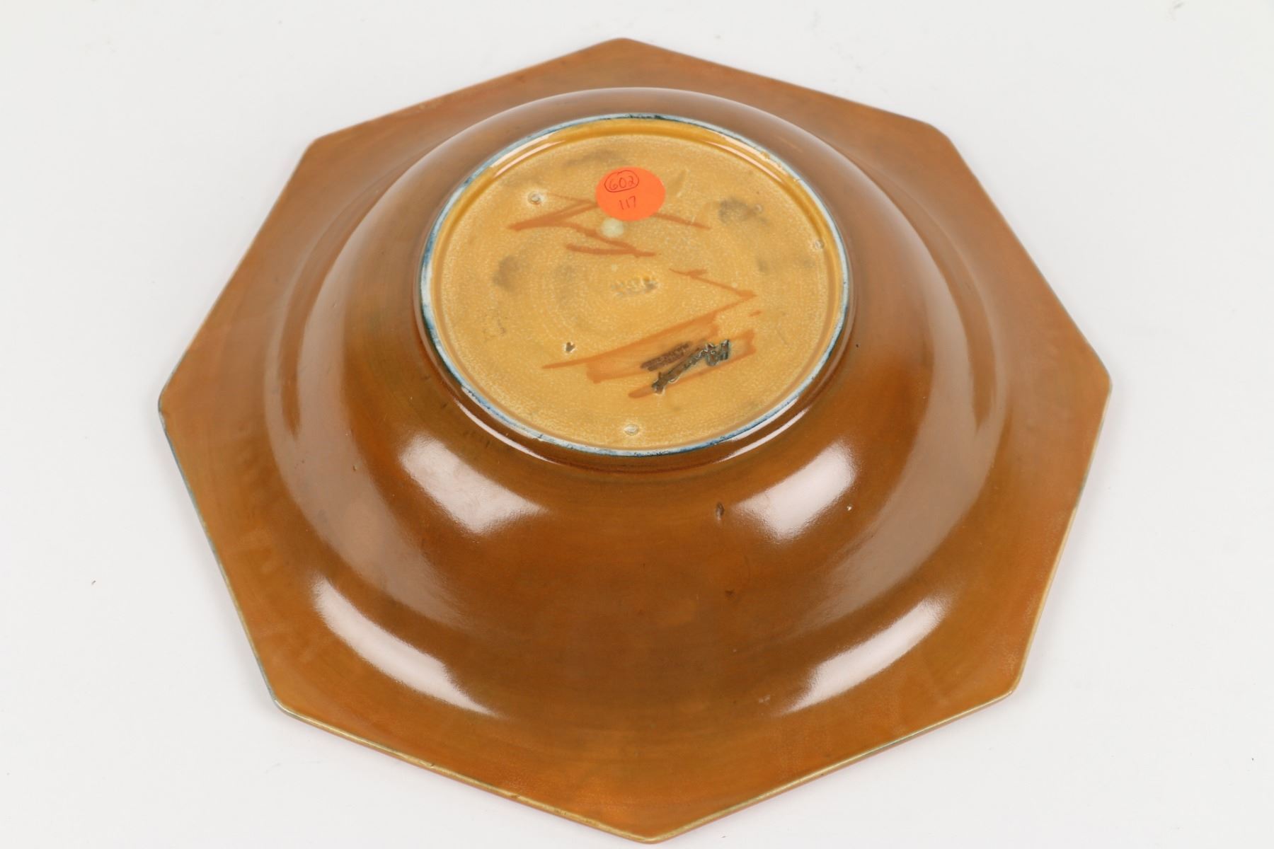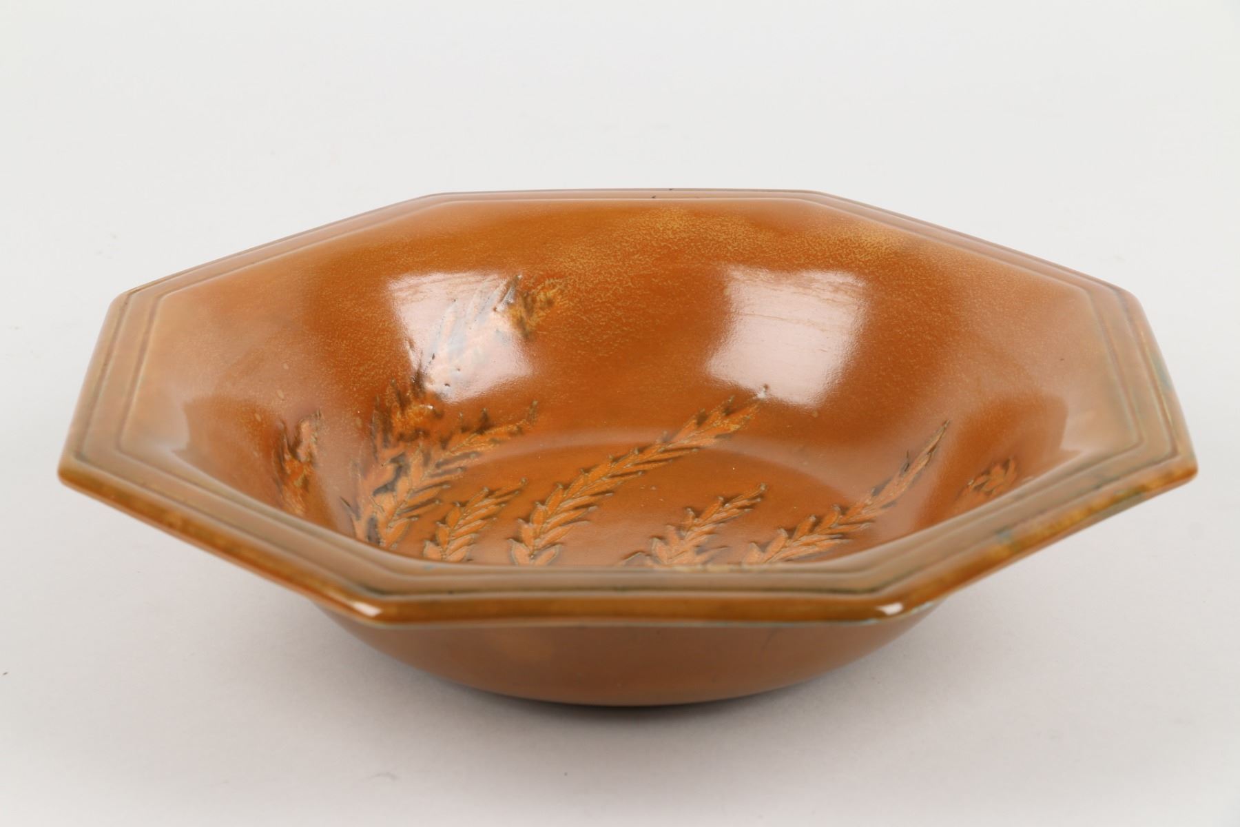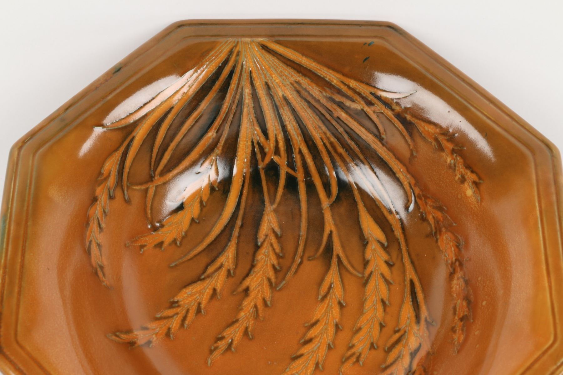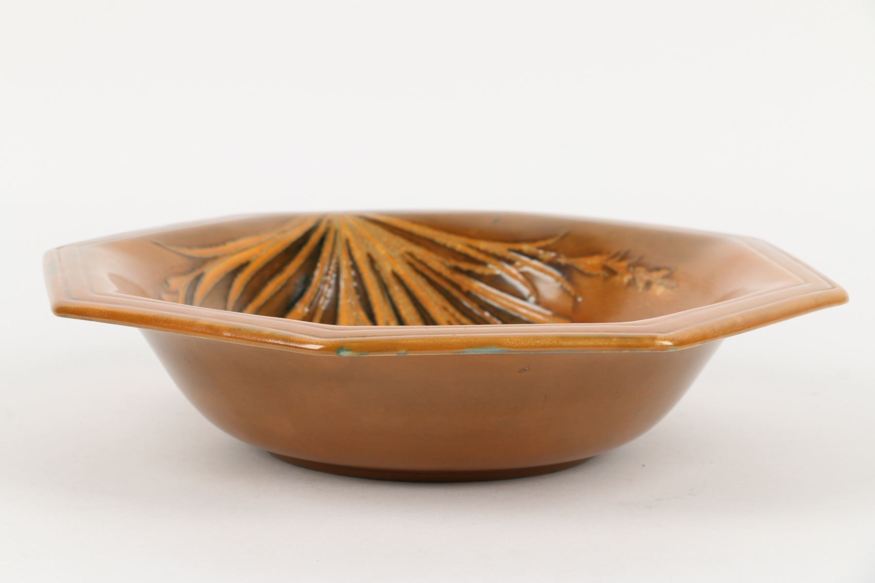 Lot 392 - Circa 1940. English. "Waving Corn" design. Hand signed Moorcroft, stamped "Moorcroft - Potter to HM The Queen - Made in England", underside. 10" x 10" x 2". $100-200.