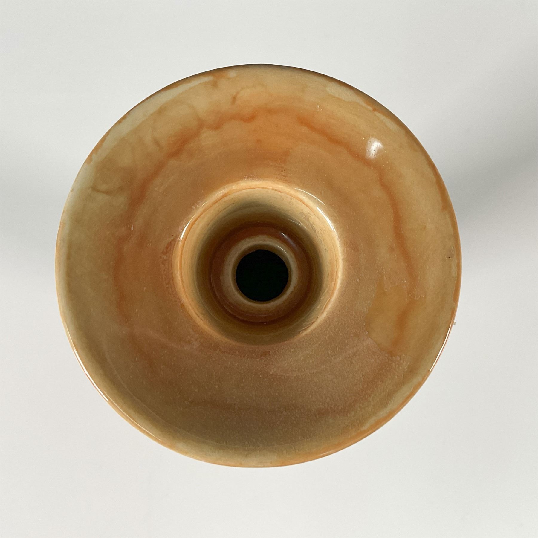 This vintage Moorcroft pottery candlestick, standing at 8.25"H, is part of the Juneberry pattern, which features vibrant hand-painted berries, leaves, and branches in rich, earthy tones of orange, green, and yellow. The cylindrical base showcases the signature artistry of Moorcroft, with intricate detailing that highlights the natural beauty of the design. The piece is signed and marked with the Moorcroft stamp and "Made in England," exemplifying the craftsmanship the brand is renowned for. A beautiful addition to any collection of fine pottery.