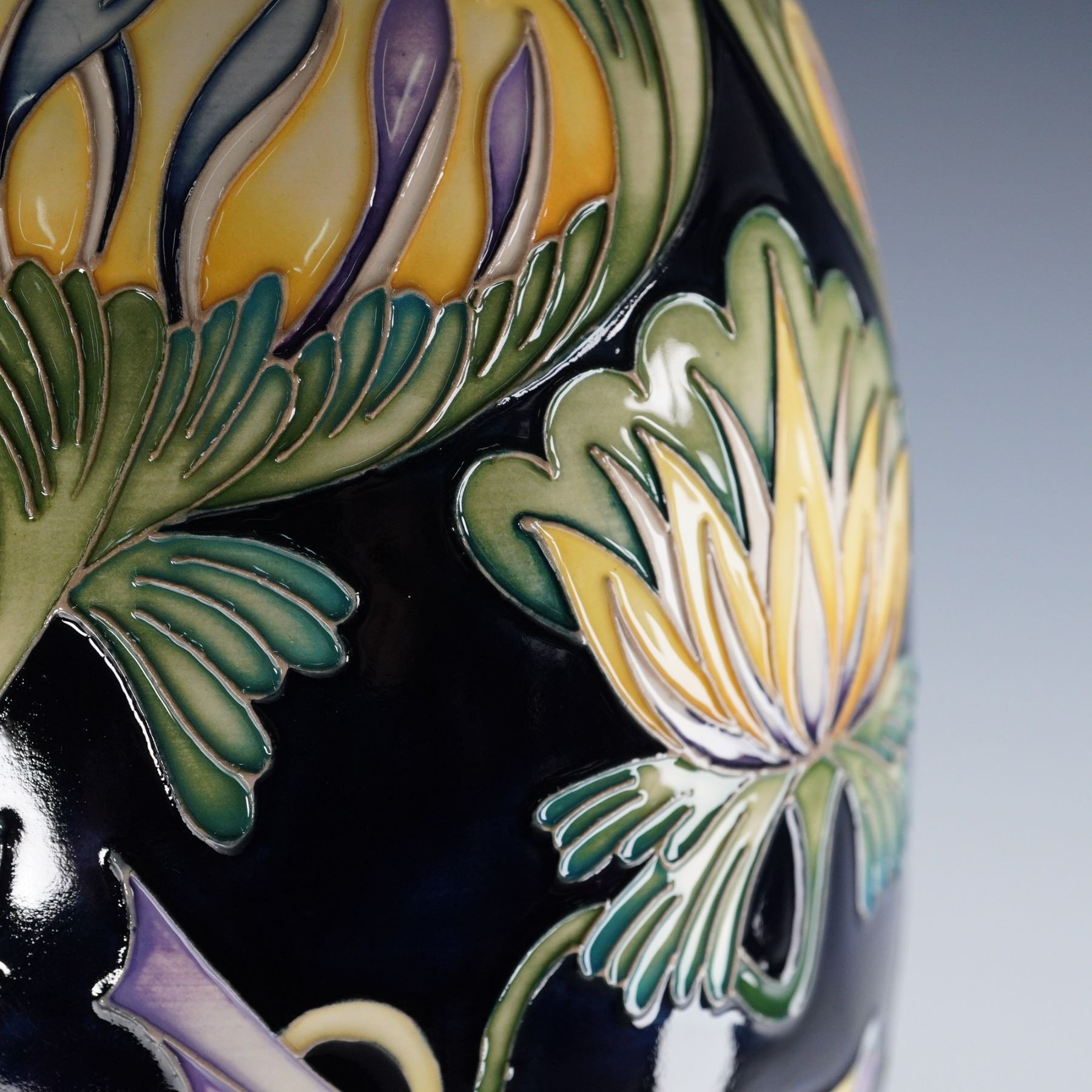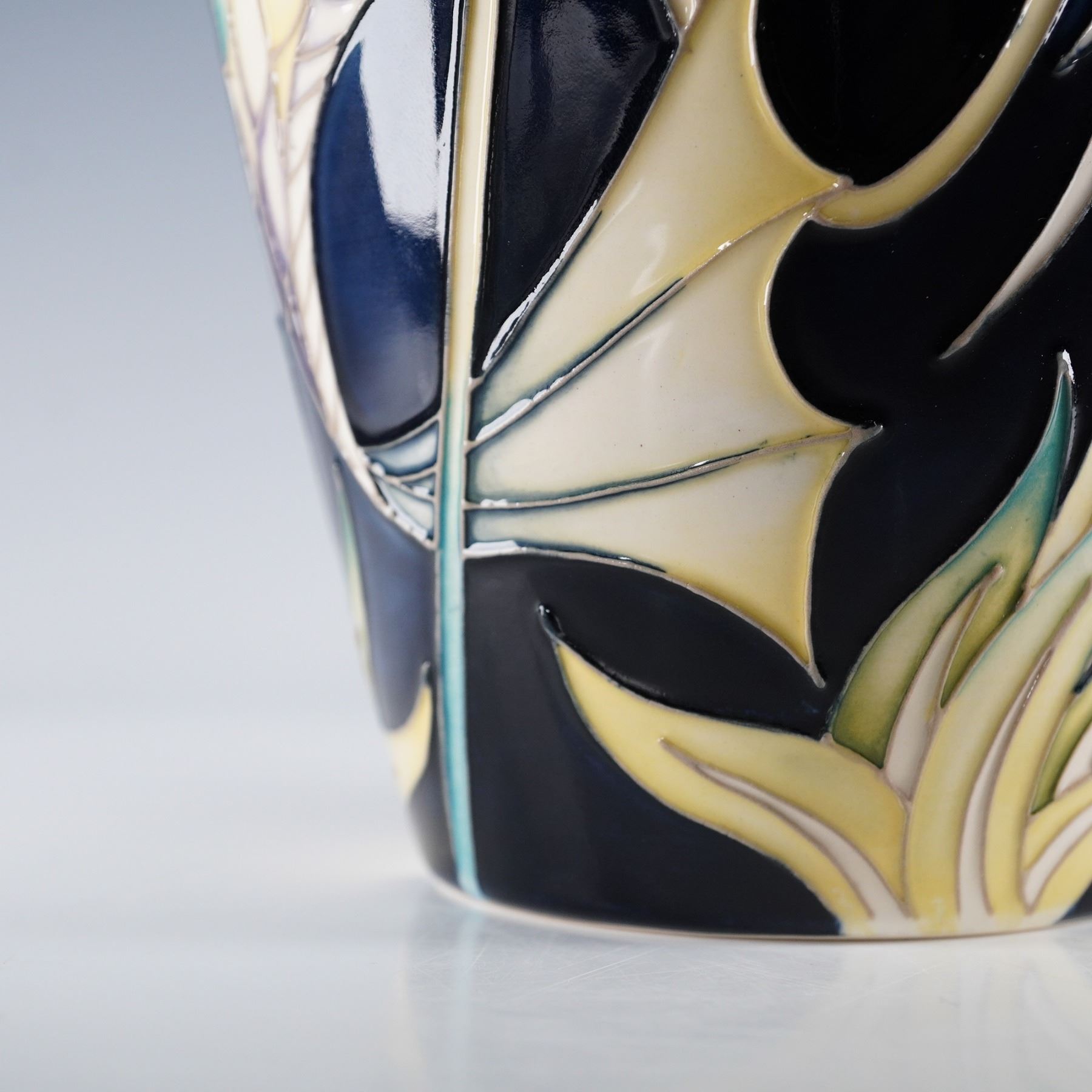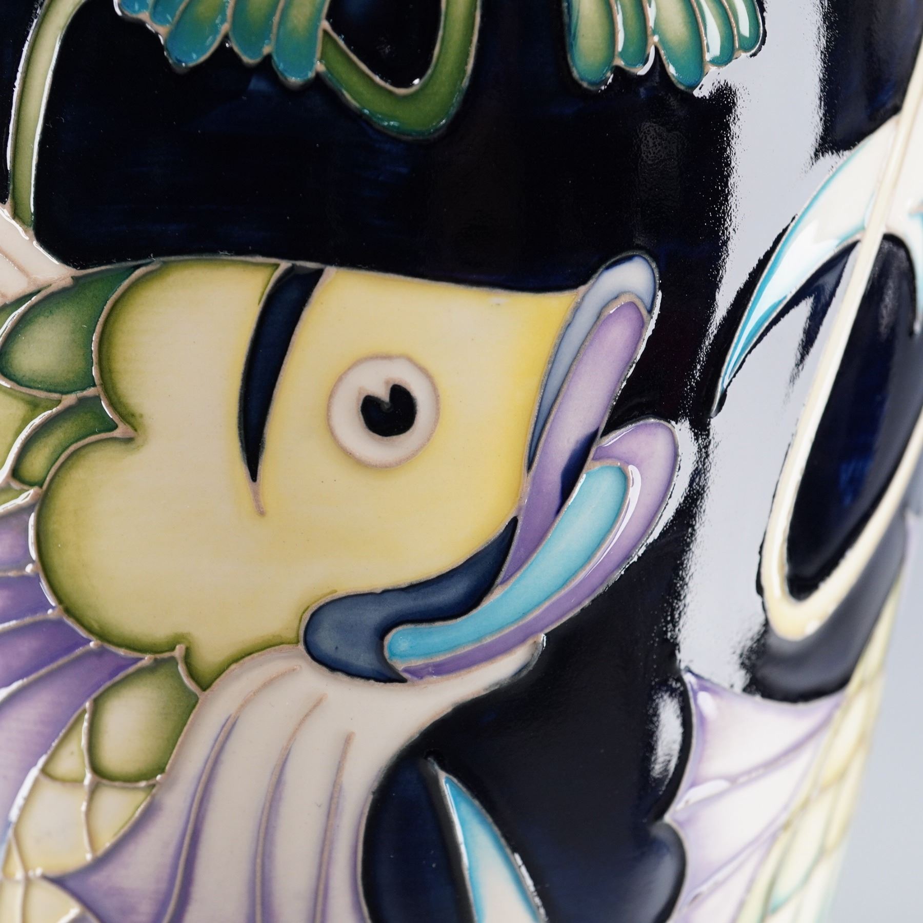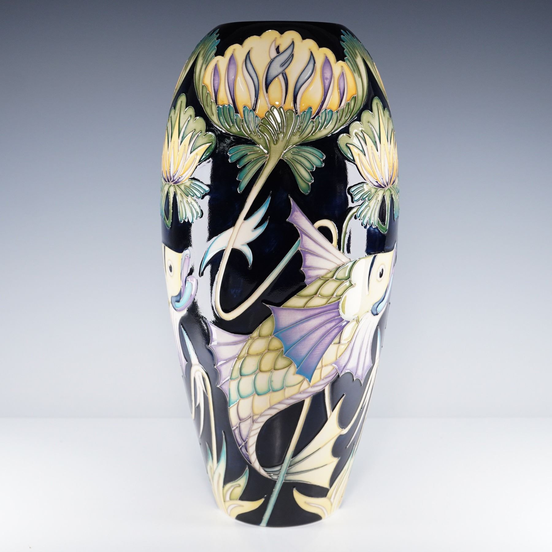 A striking pottery vase showcasing a vibrant and stylized fish and lotus blossom motif, marked by the elegance and flowing artistry. This vessel features undulating, stylized aquatic forms rendered in crips tube lining. The fish are painted in soft tones of lavender, green, and creamed tones surrounded by florals, all set on a navy blue ground exterior and to the interior. Marked Design Trial and dated. Signed HM for Hayley Moore and GJ for Gillian Johnson. Moorcroft impressed backstamp.