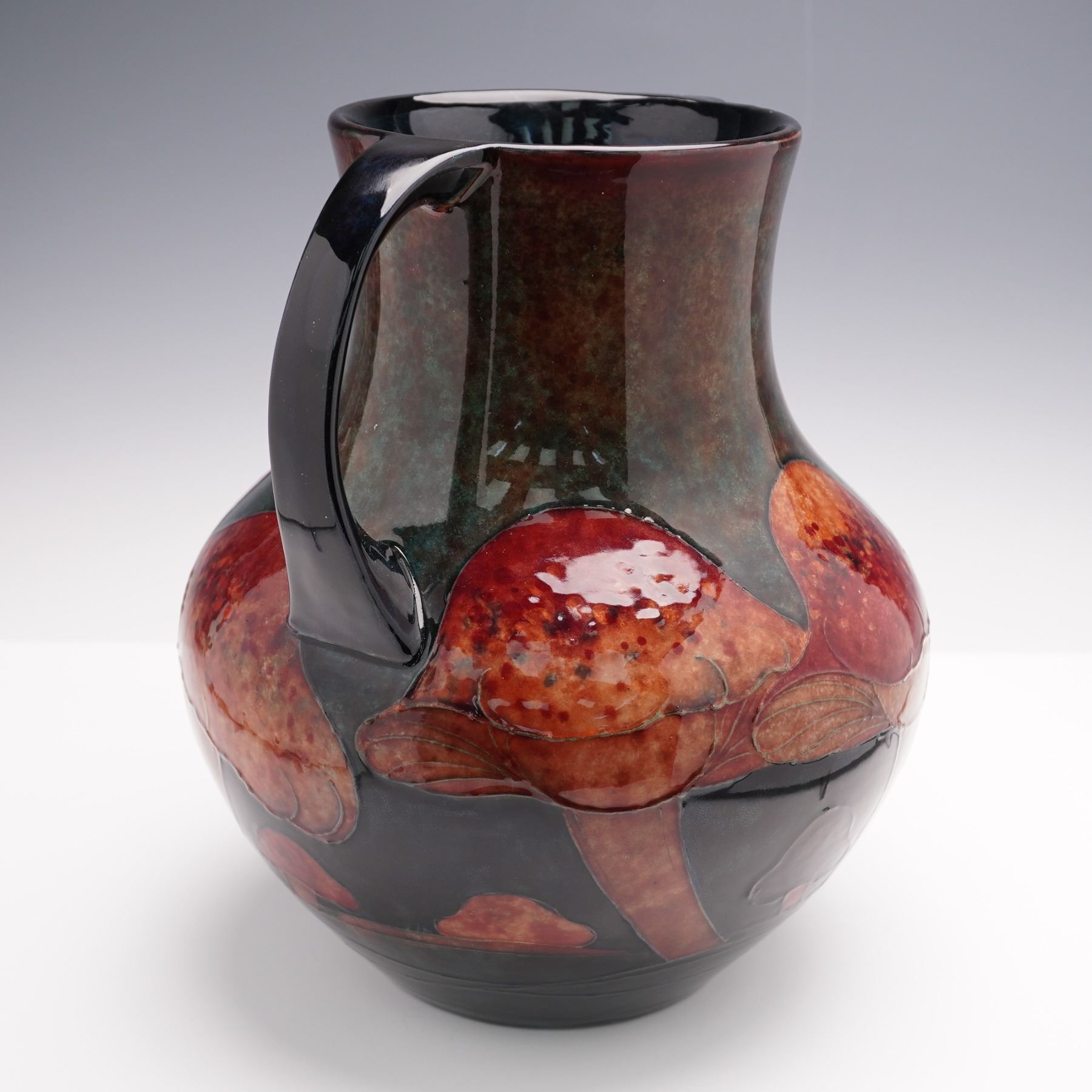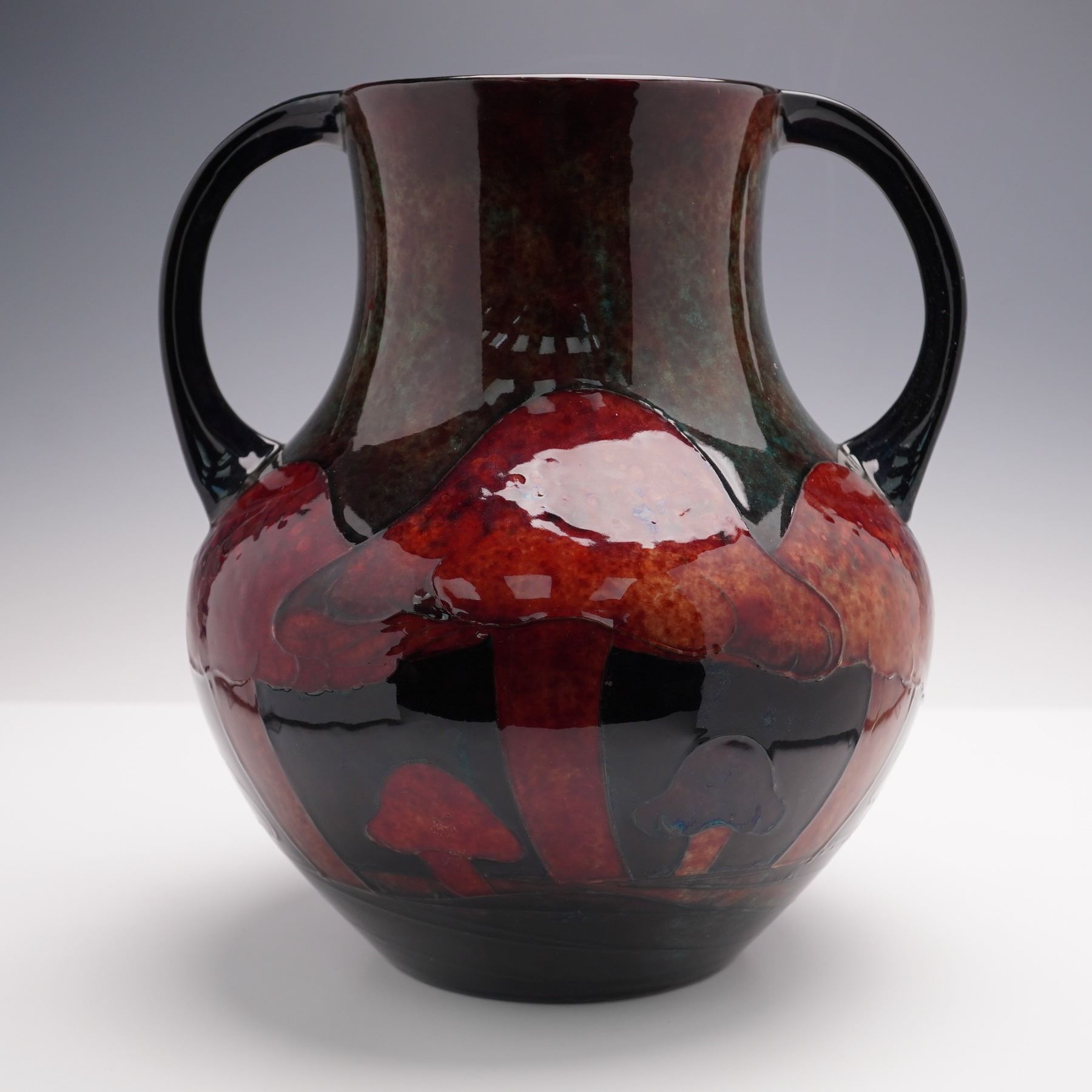 Moorcroft Pottery double-handle vase in the Claremont pattern, finished in flambe glaze. The vase is decorated with a continuous design of mushrooms in tones of red, orange, and brown against a dark ground. The body features two opposing handles and a flaring neck. The underside bears the impressed Moorcroft mark along with a paper label reading "By Appointment, Potter to HM The Queen."