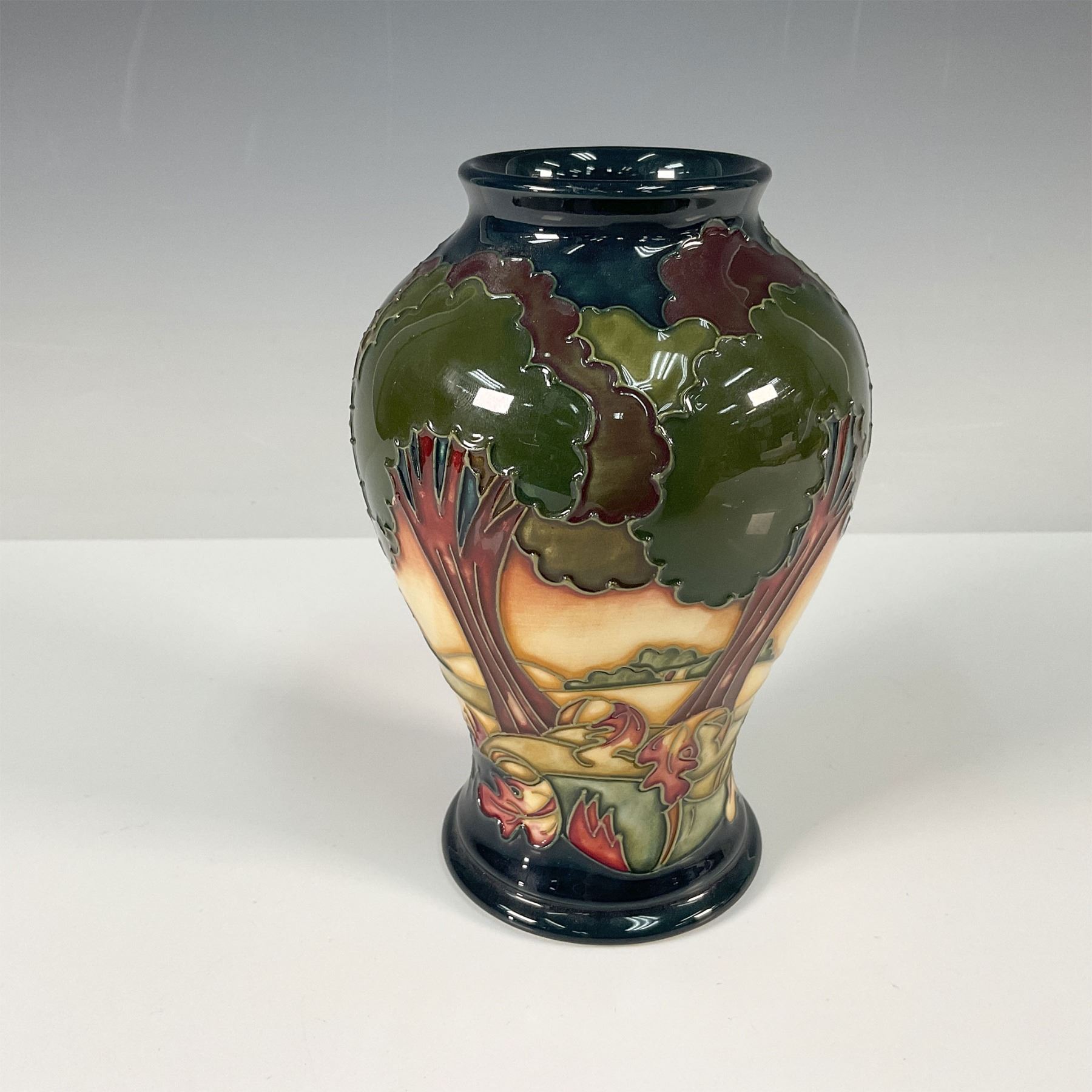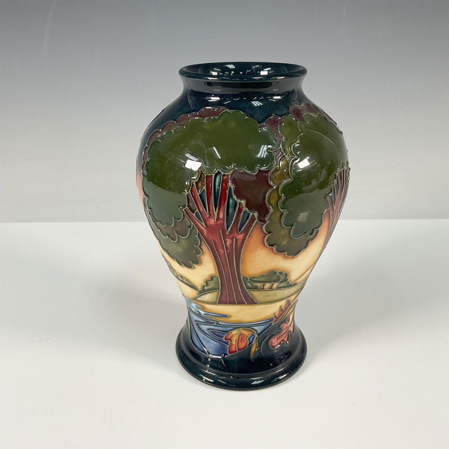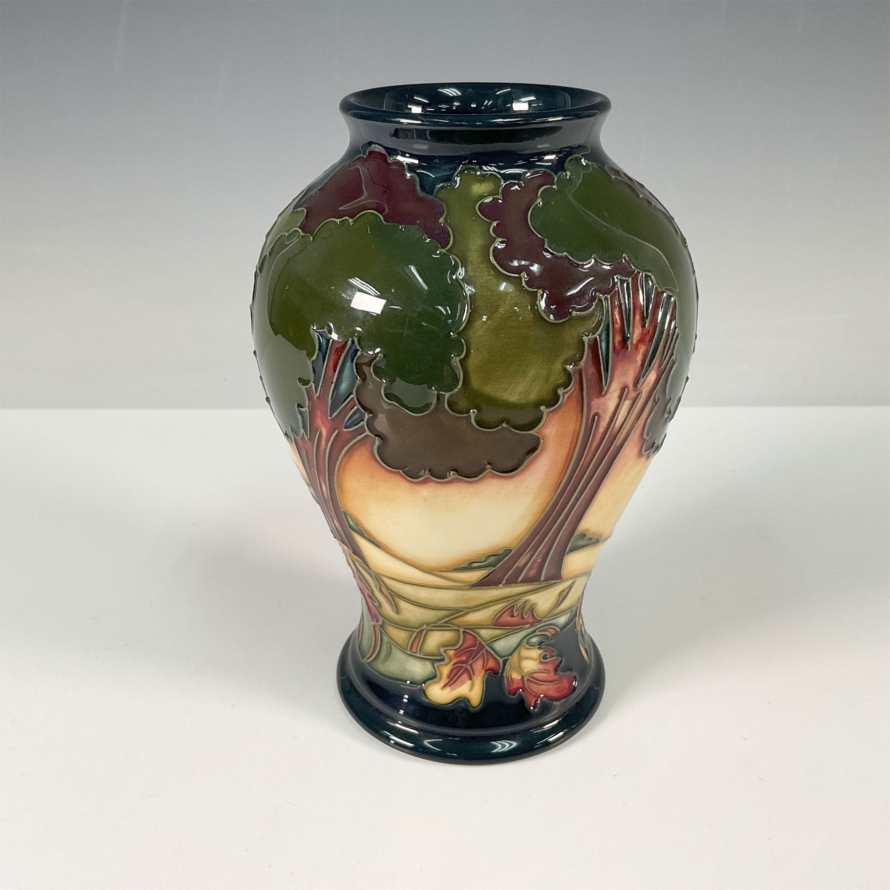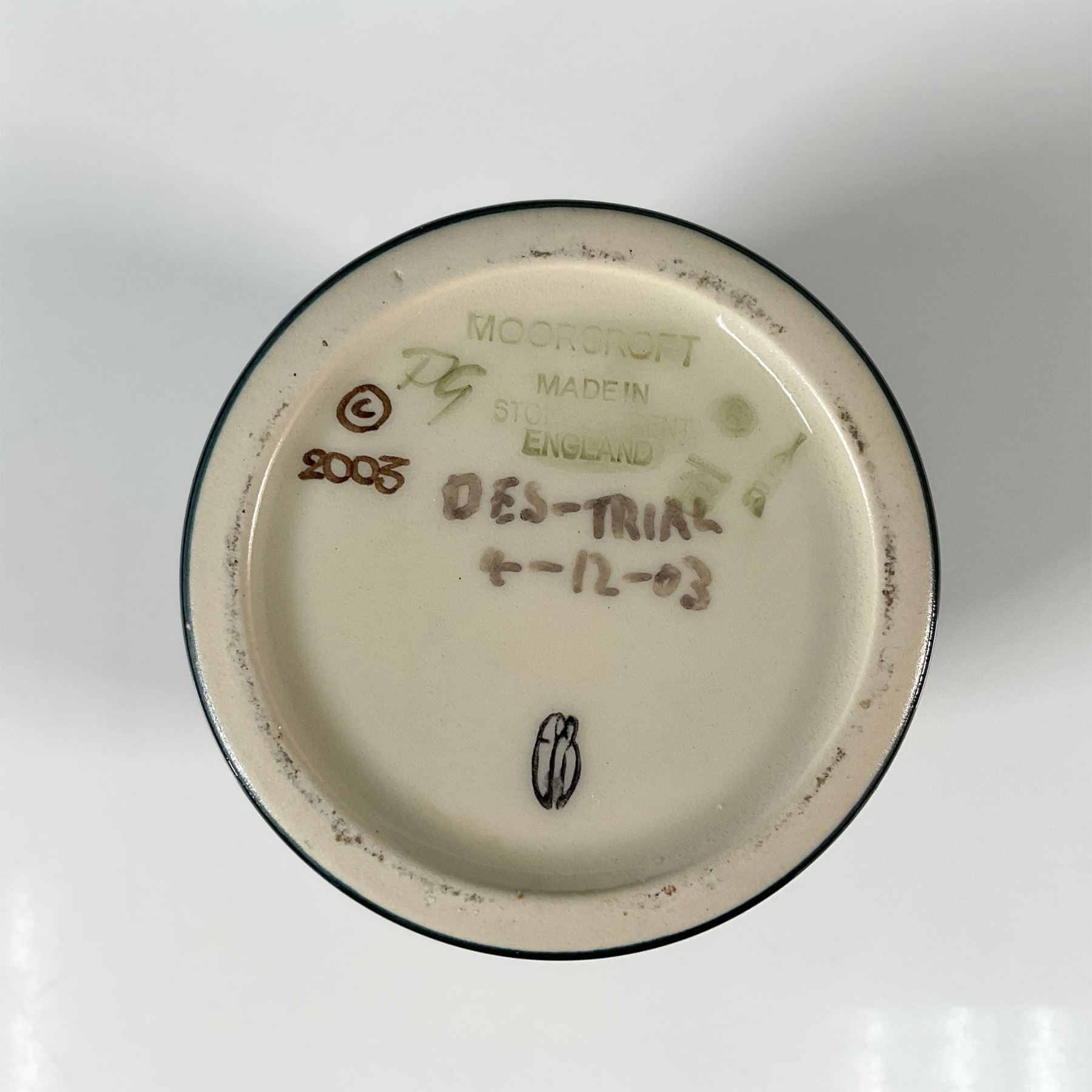 This stunning trial vase from Moorcroft Pottery is part of the limited-edition Evening Sky series, designed by Philip Gibson. Featuring a rich, intricate color palette, the vase showcases Gibson's distinctive interpretation of nature's beauty, with stylized trees, sky, and landscape in warm hues. The underside bears the Moorcroft backstamp, alongside a hand-written marking DES-TRIAL 12-12-03, indicating its trial production status. This unique piece measures 6.25"H and was created around 2003. It represents an exclusive example of Moorcroft's renowned craftsmanship and commitment to artistic innovation.