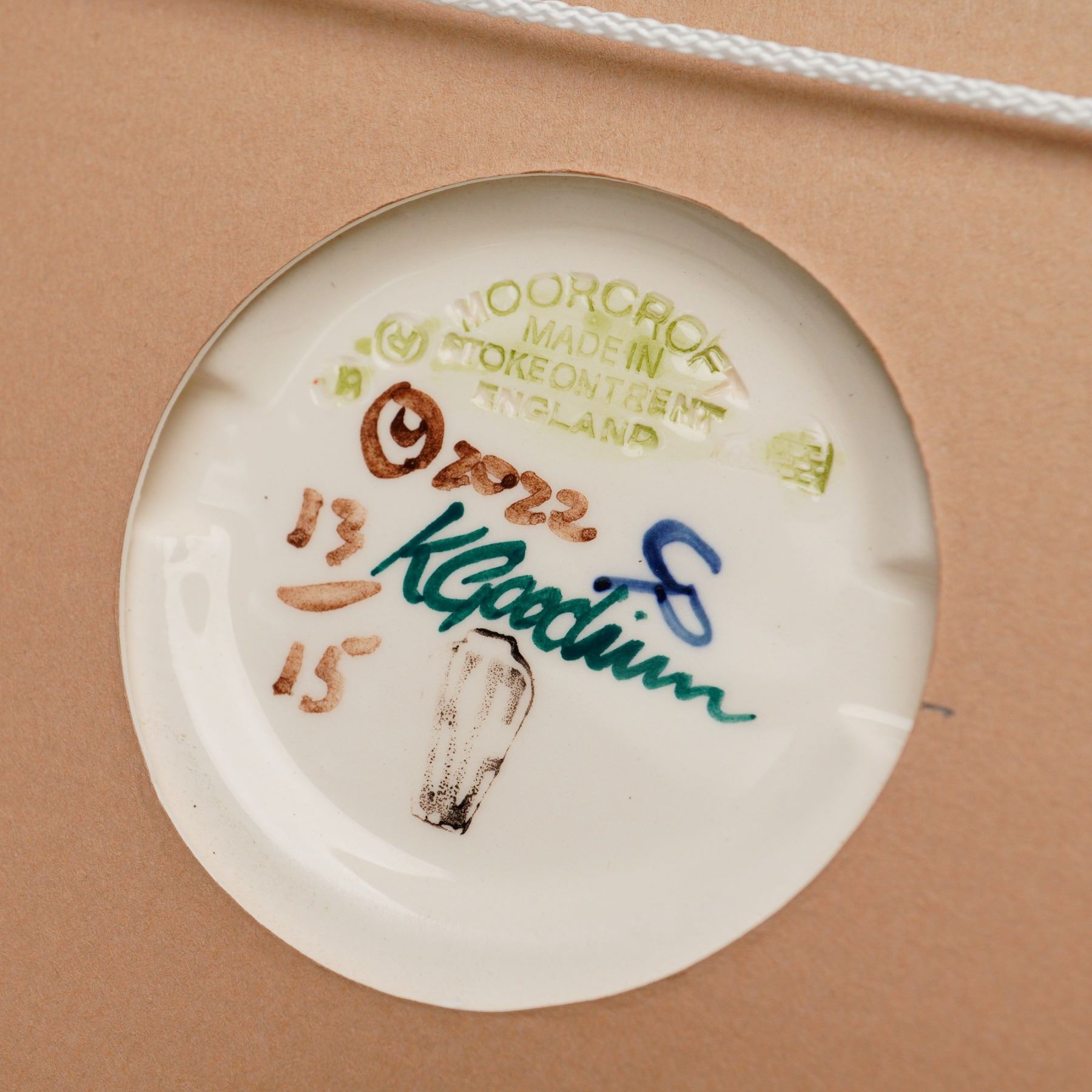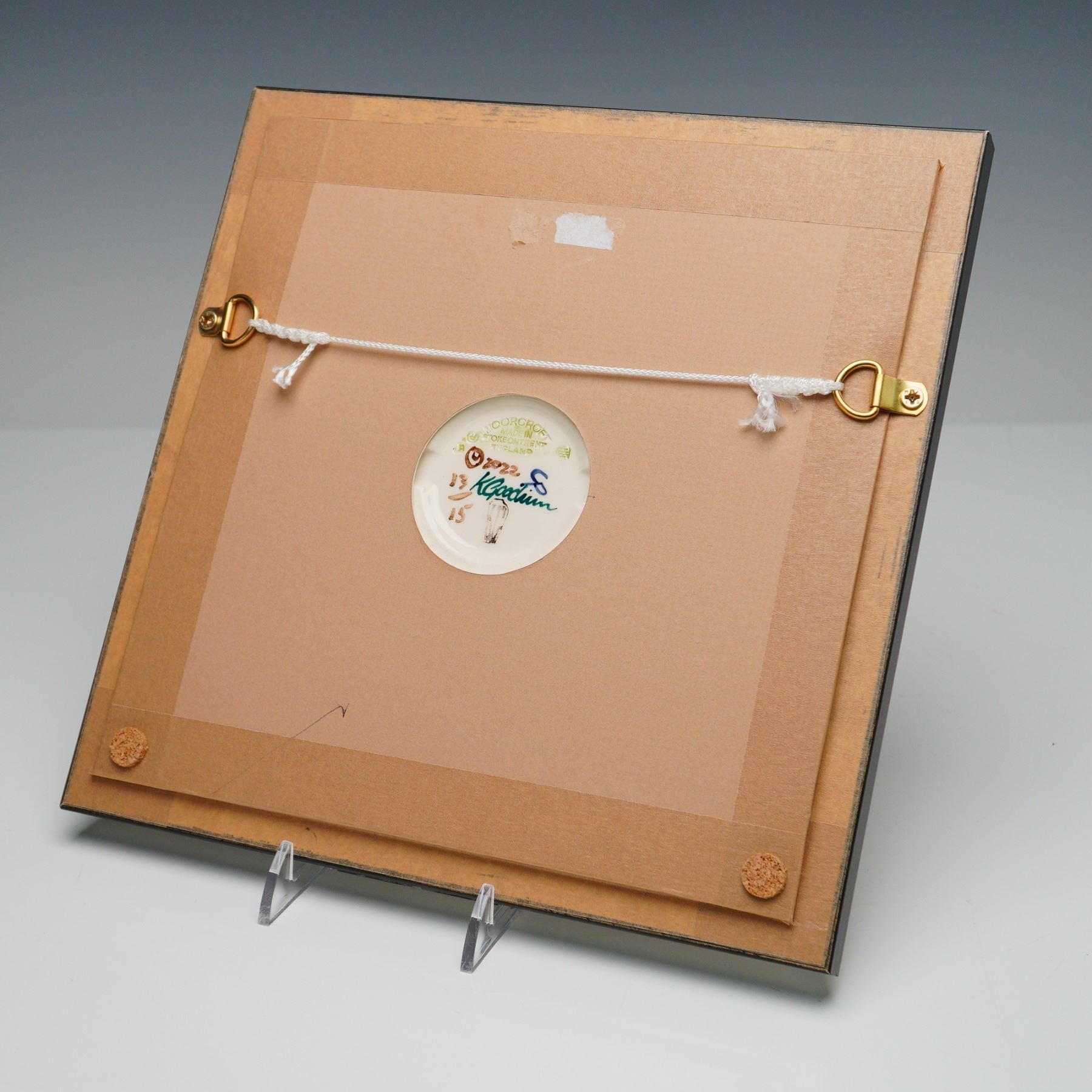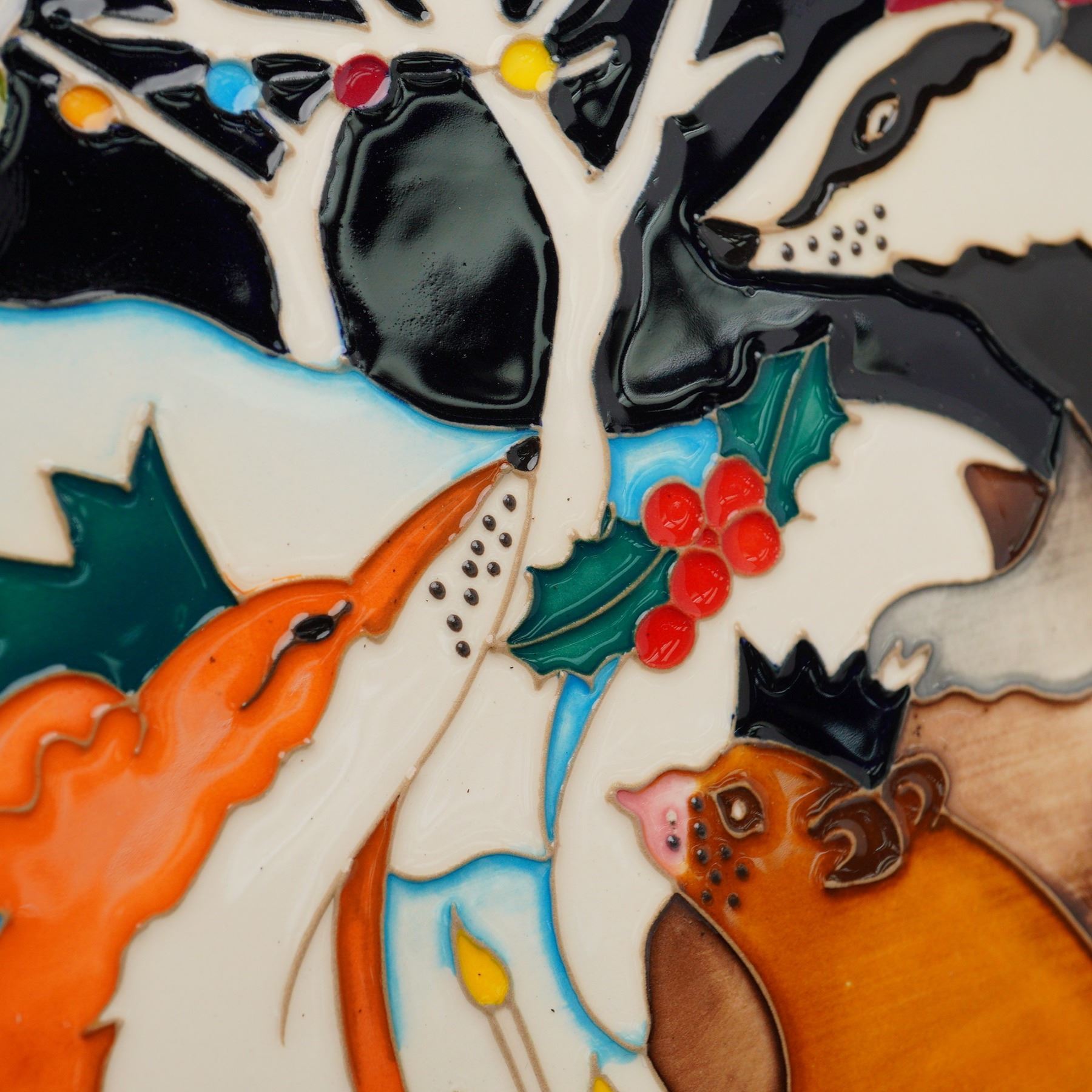 A delightful and rare limited edition plaque by Moorcroft Pottery, titled "Festive Forest Party", designed by renowned Moorcroft artist Kerry Goodwin. Numbered 13 out of only 15 pieces produced in 2022, this ceramic plaque is both a collector's treasure and a joyful celebration of seasonal whimsy. Rendered in the classic Moorcroft slip-trailing technique, the scene depicts a lively woodland gathering, featuring a crowned badger, a fox with a festive paper crown, a wine-sipping bear, and a mole in a yellow bowtie, all engaged in yuletide merriment under a snow-laden tree adorned with lights and holly. The deep colors and raised glazes bring the playful composition to life, with exceptional hand-painting and carving detail throughout. Signed and dated on the reverse and set in a custom wood frame, ready for wall display. Back panel includes Moorcroft impressed marks and full artist signature.