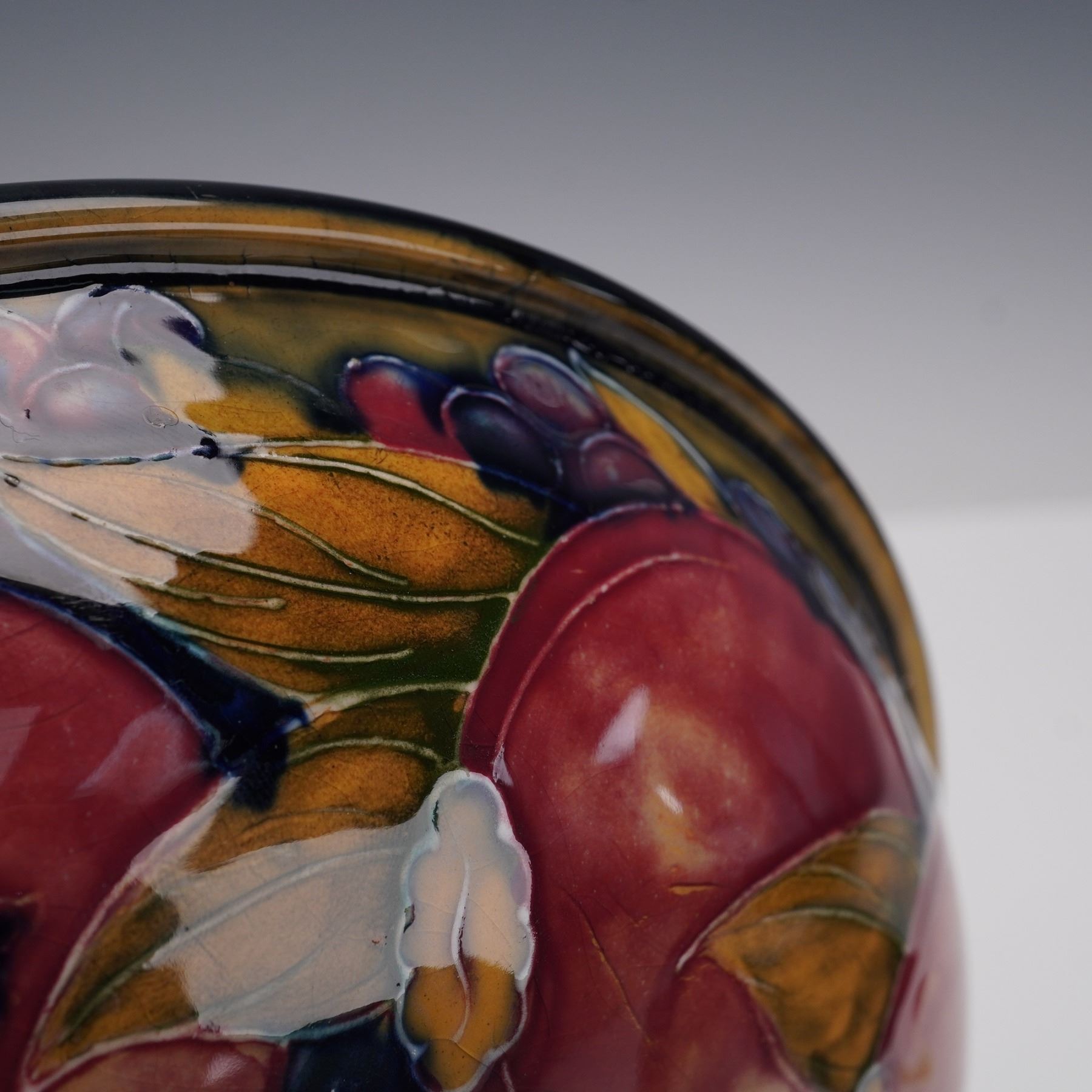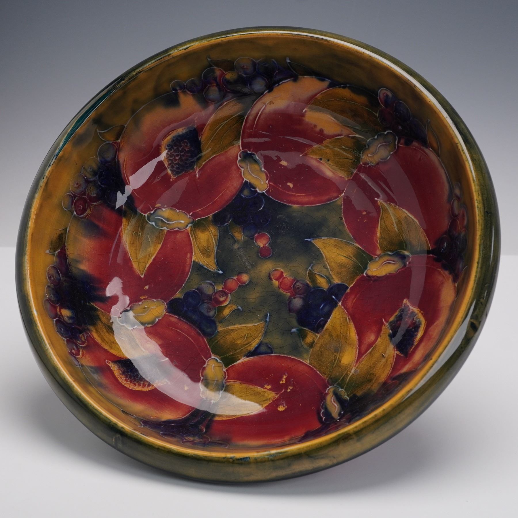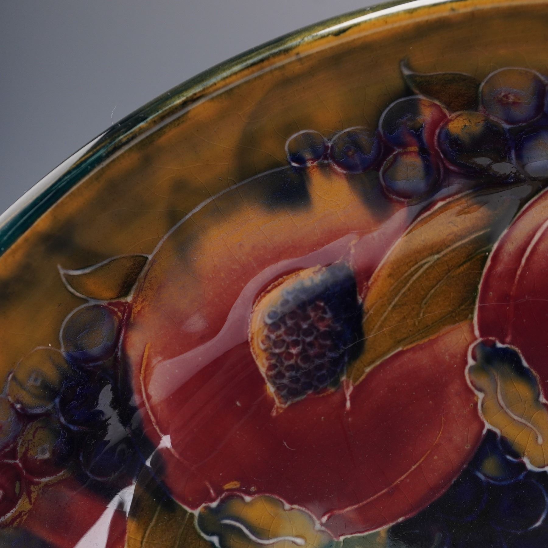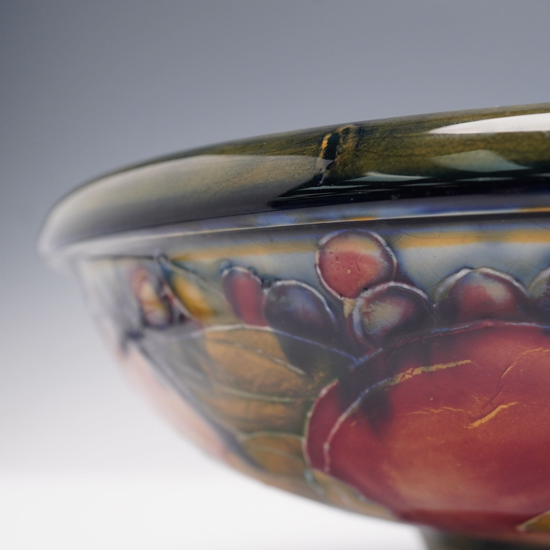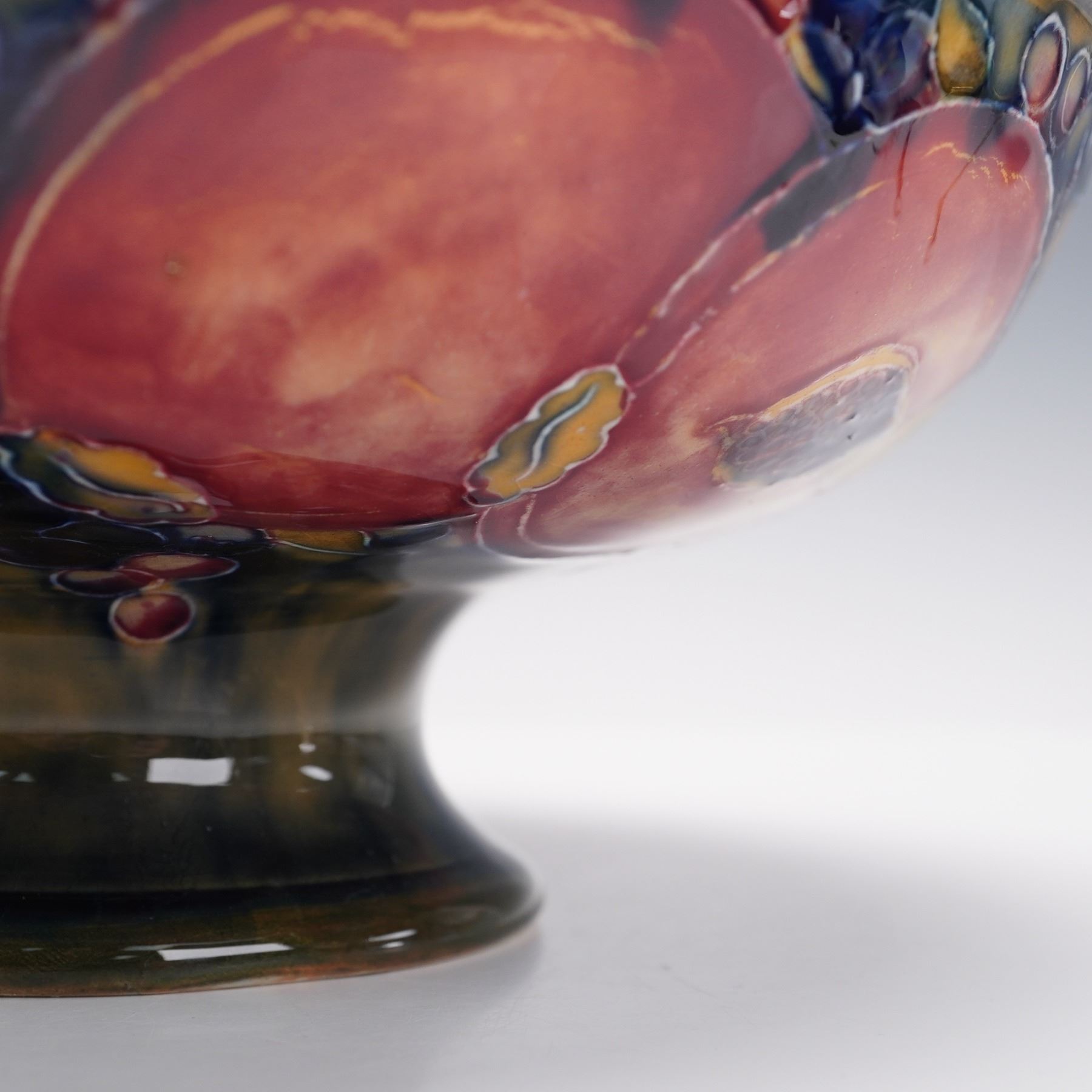 Featuring a circular form on a pedestal base. The bowl is decorated with hand-painted and tubelined designs of pomegranates, grapes, and foliage in deep red, green, and blue glazes, set against a mottled ground. Moorcroft impressed on the underside.