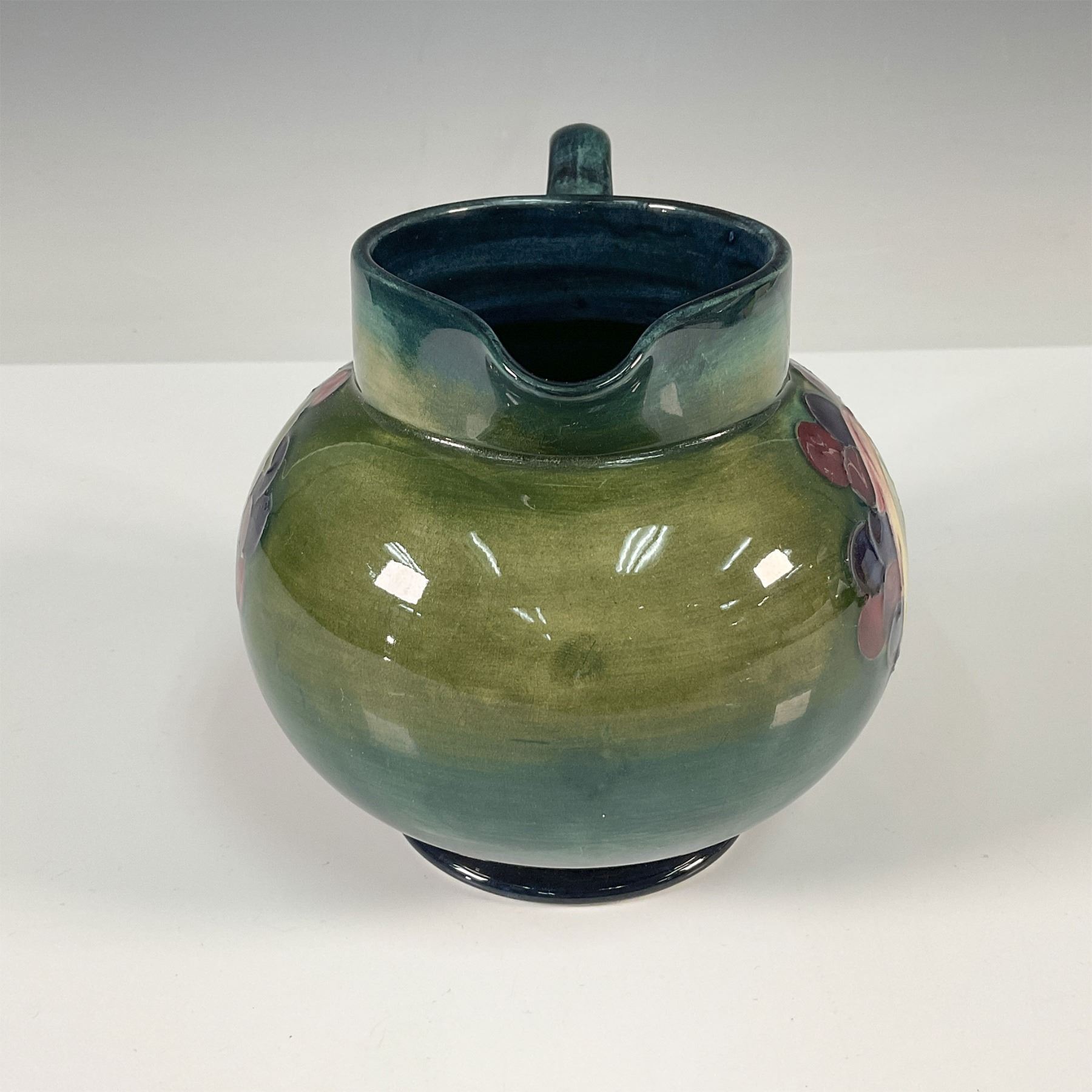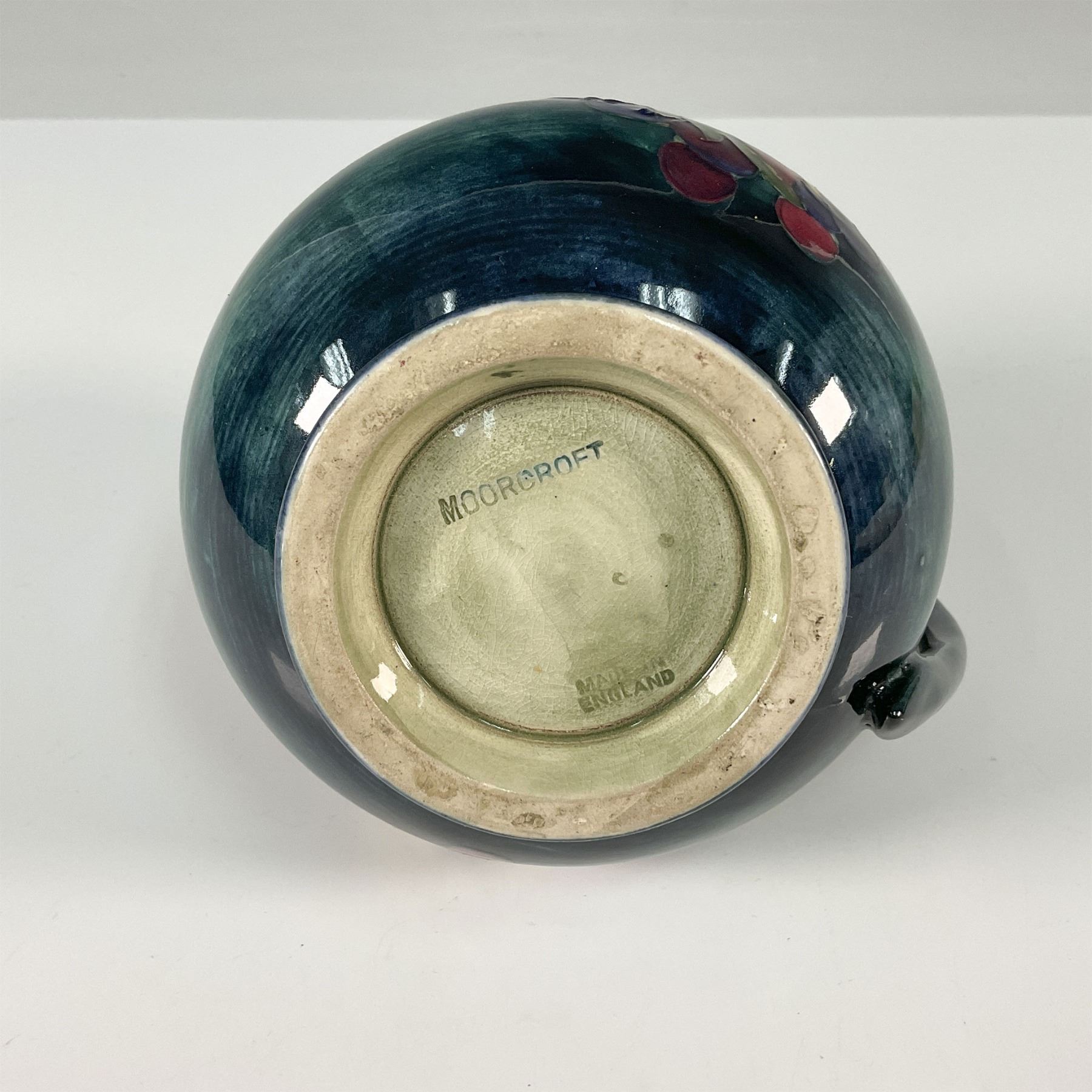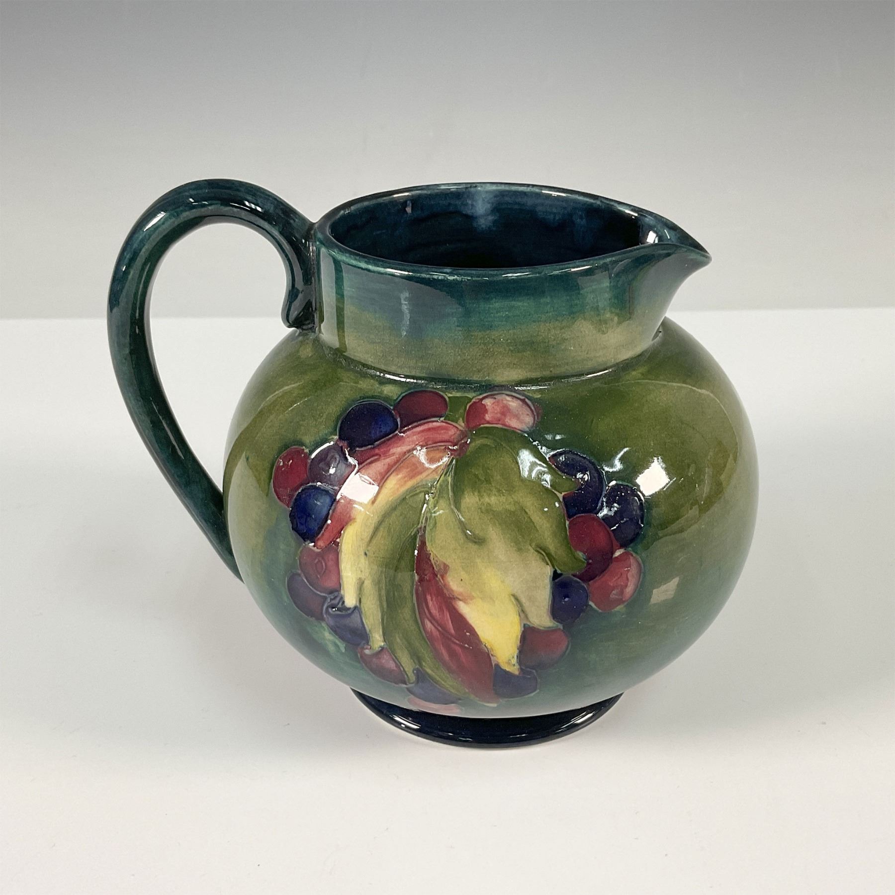 A stunning Moorcroft pottery pitcher featuring a vibrant hand-painted fruit motif with rich hues of green, red, and yellow on a glossy blue-green gradient background. This piece showcases Moorcroft's signature intricate craftsmanship and iconic Art Nouveau influences. The underside is marked "Moorcroft Made in England," authenticating its origin and quality. Measuring 4.75"H, this petite pitcher is perfect for collectors of fine English ceramics or as a charming decorative piece.
