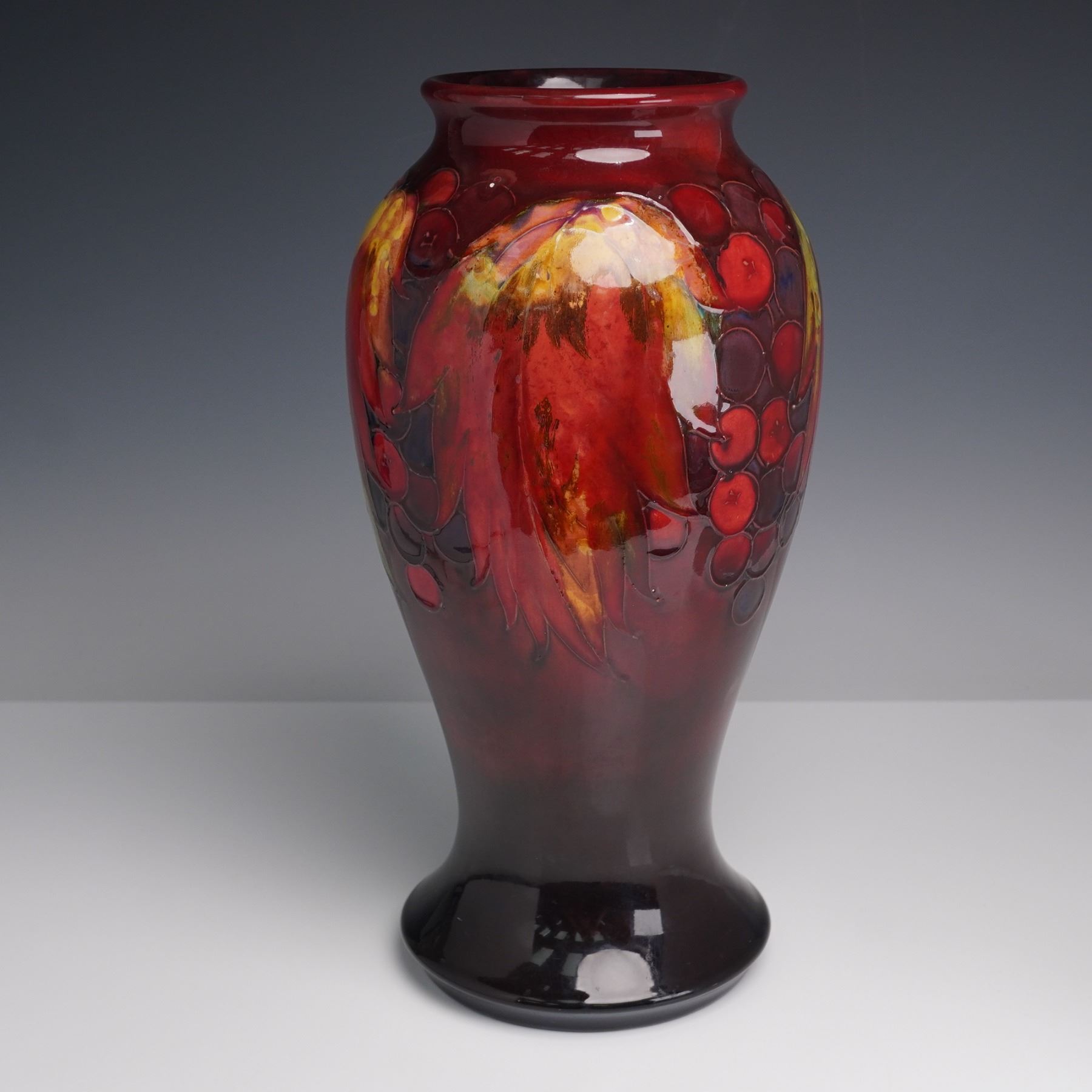 Featuring stylized foliage in shades of red, orange, and yellow with clusters of red berries against a deep crimson ground. The vase has a baluster form with a slightly everted rim and raised foot, the decoration executed in typical tubelined technique under a rich flambe glaze. The underside bears Moorcroft marks.