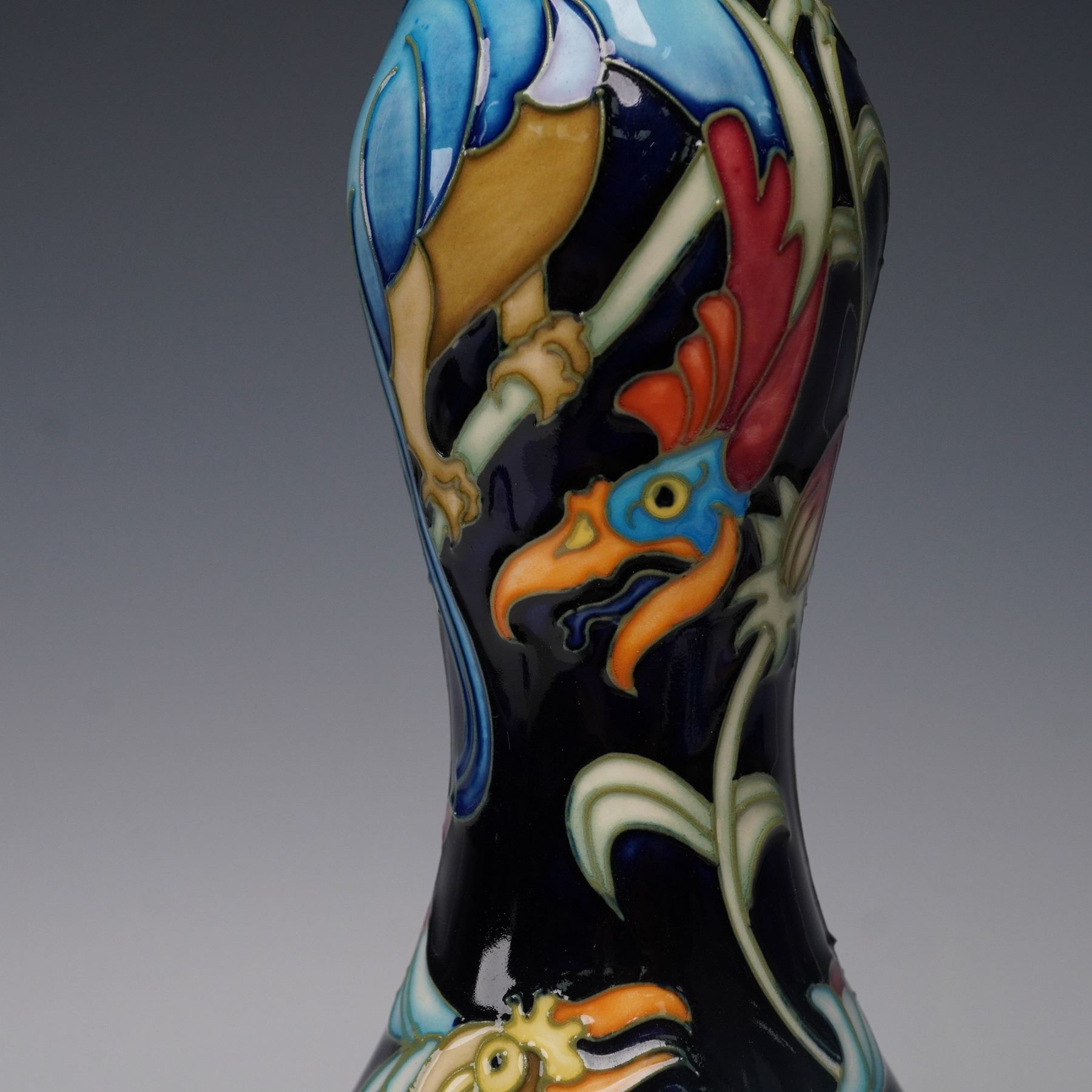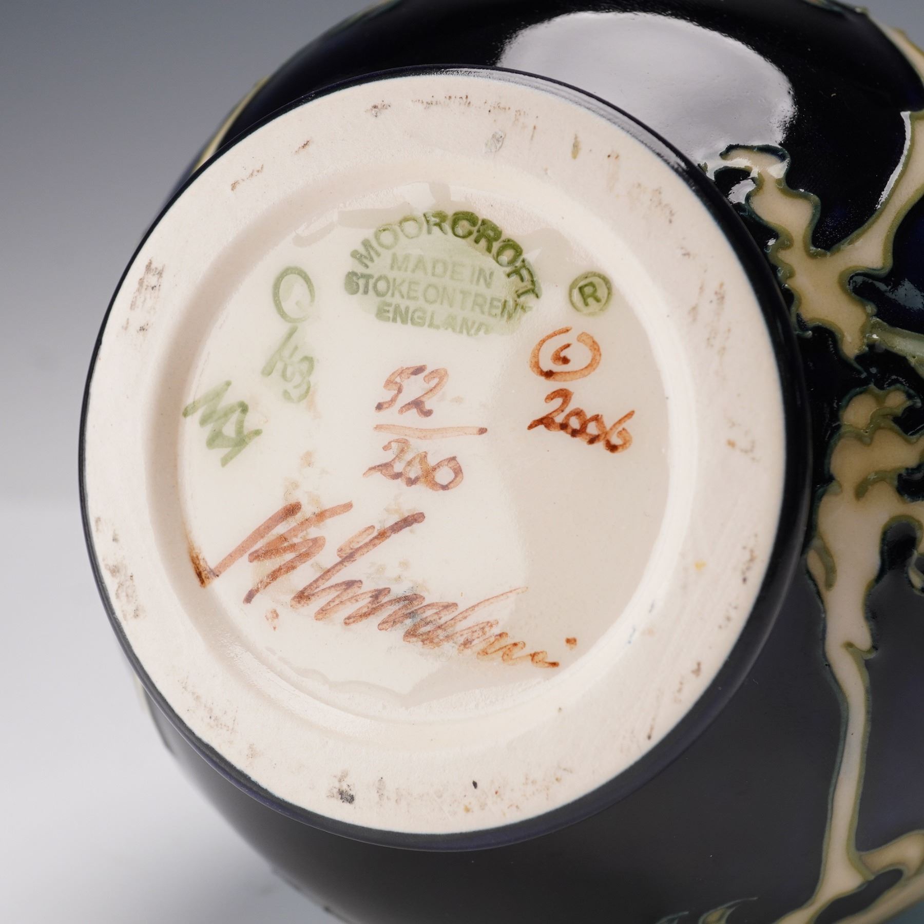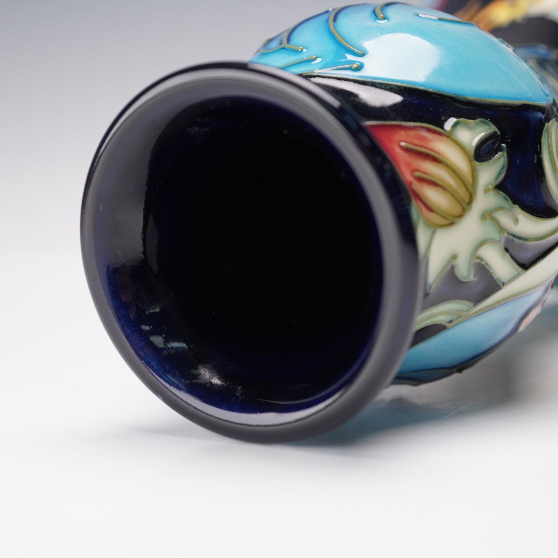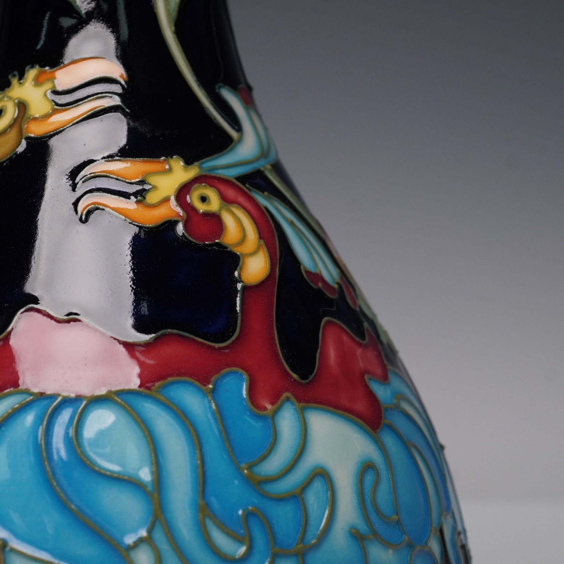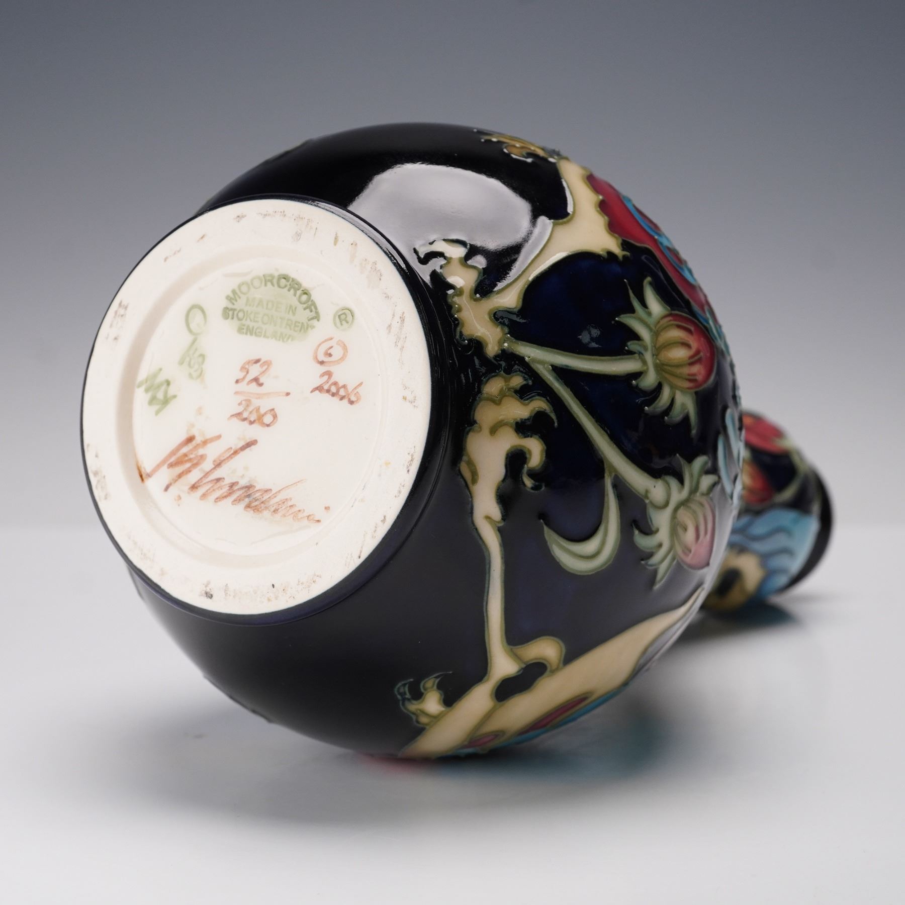 A striking Moorcroft Pottery vase designed by Nicole Slaney, produced in a limited edition of only 200 pieces. The design features brilliantly colored Chinese lantern motifs in vibrant turquoise, red, and gold against a rich dark ground, with Moorcroft's signature slip-trailed outlines adding depth and texture. Slaney's bold use of color and stylized forms reflect both traditional Moorcroft artistry and contemporary flair. The base is signed by the artist and bears full Moorcroft impressed and painted marks, including date ciphers for 2006.