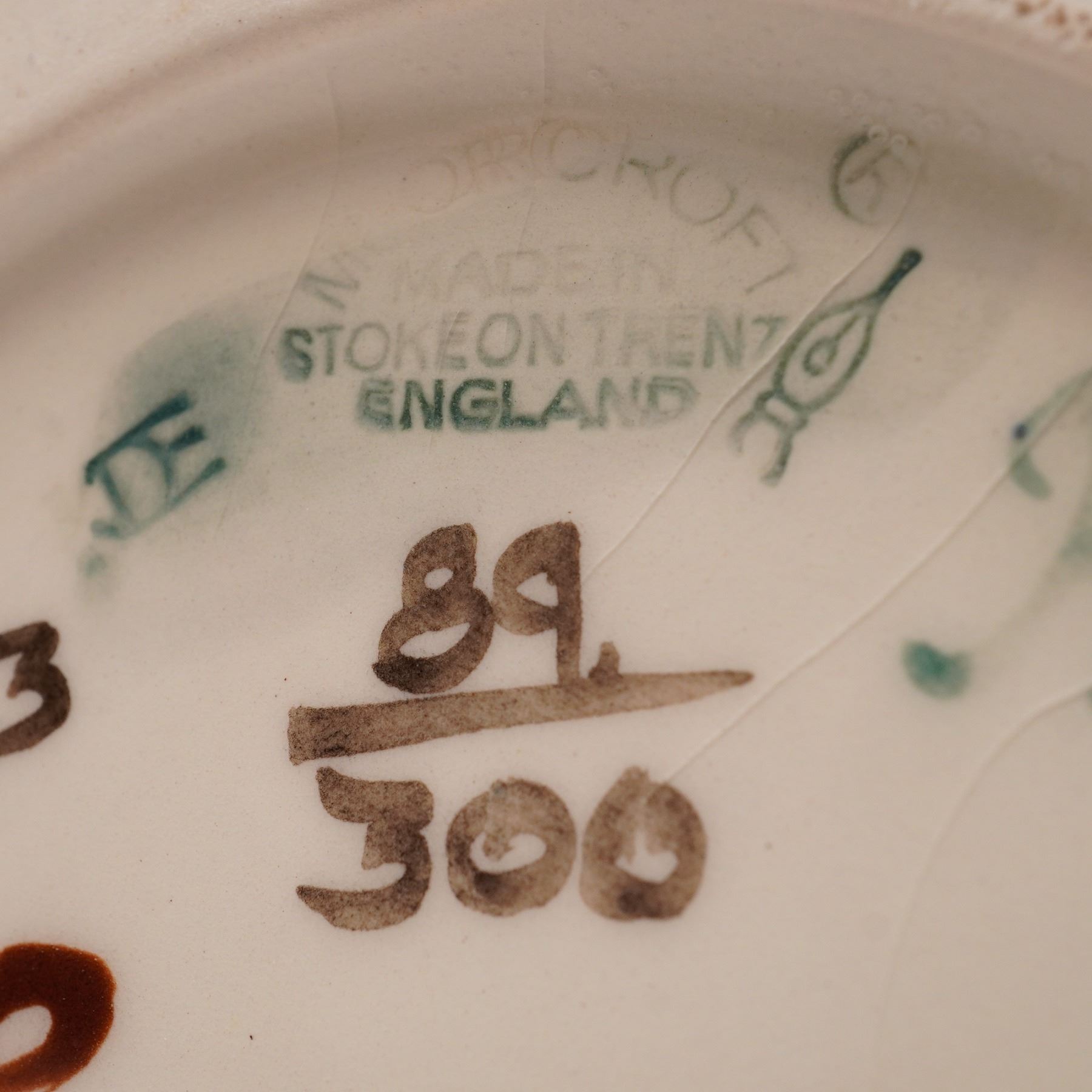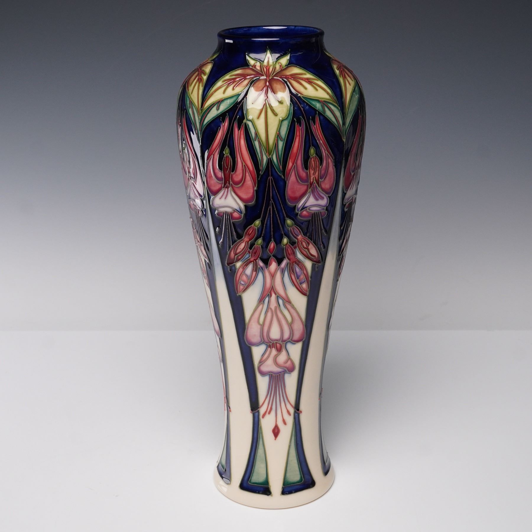 A Moorcroft Pottery limited edition vase titled Marinka, designed by Rachel Bishop. This tall vase features vibrant fuchsia flowers cascading in rich shades of crimson, pink, and lavender against a cobalt blue and cream ground. The elegant Art Nouveau-inspired pattern is characteristic of Bishop's celebrated style, with sinuous floral forms and bold color contrasts. Limited edition, hand-signed and numbered on the base, with impressed and painted factory marks. Includes original Moorcroft presentation box.