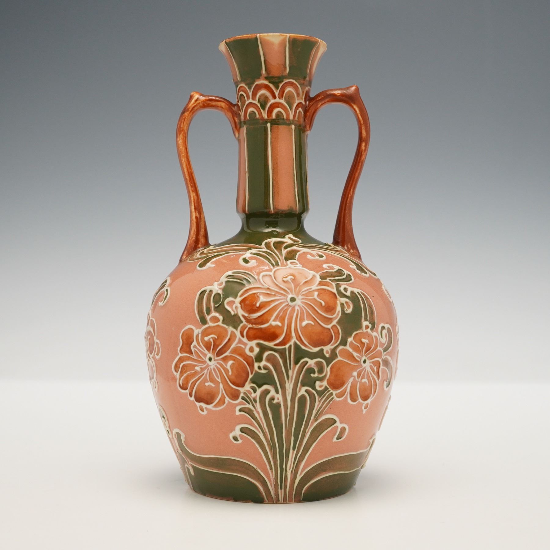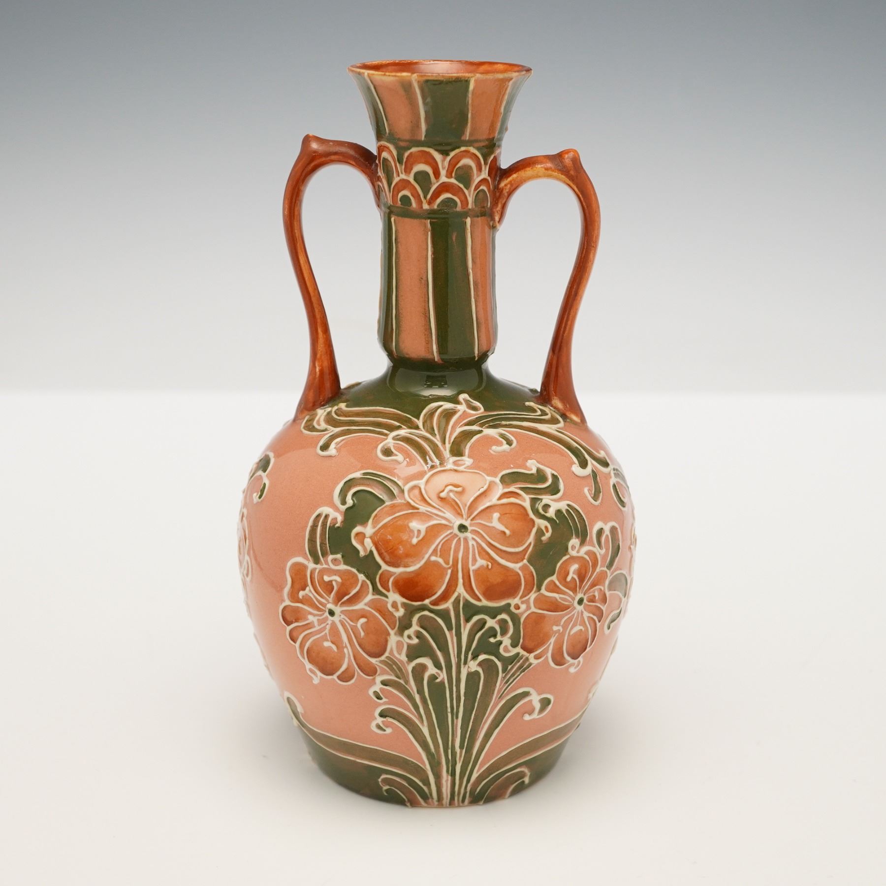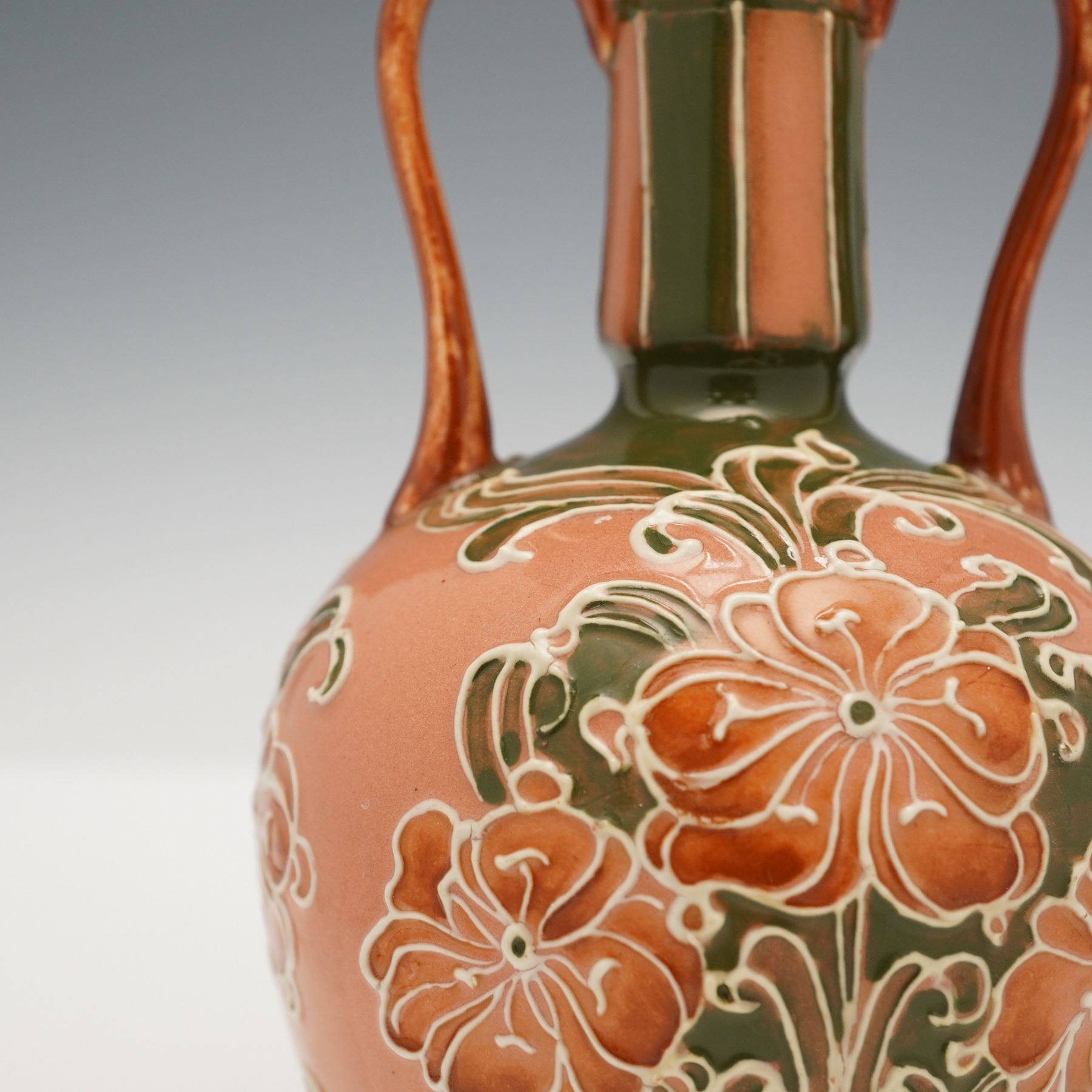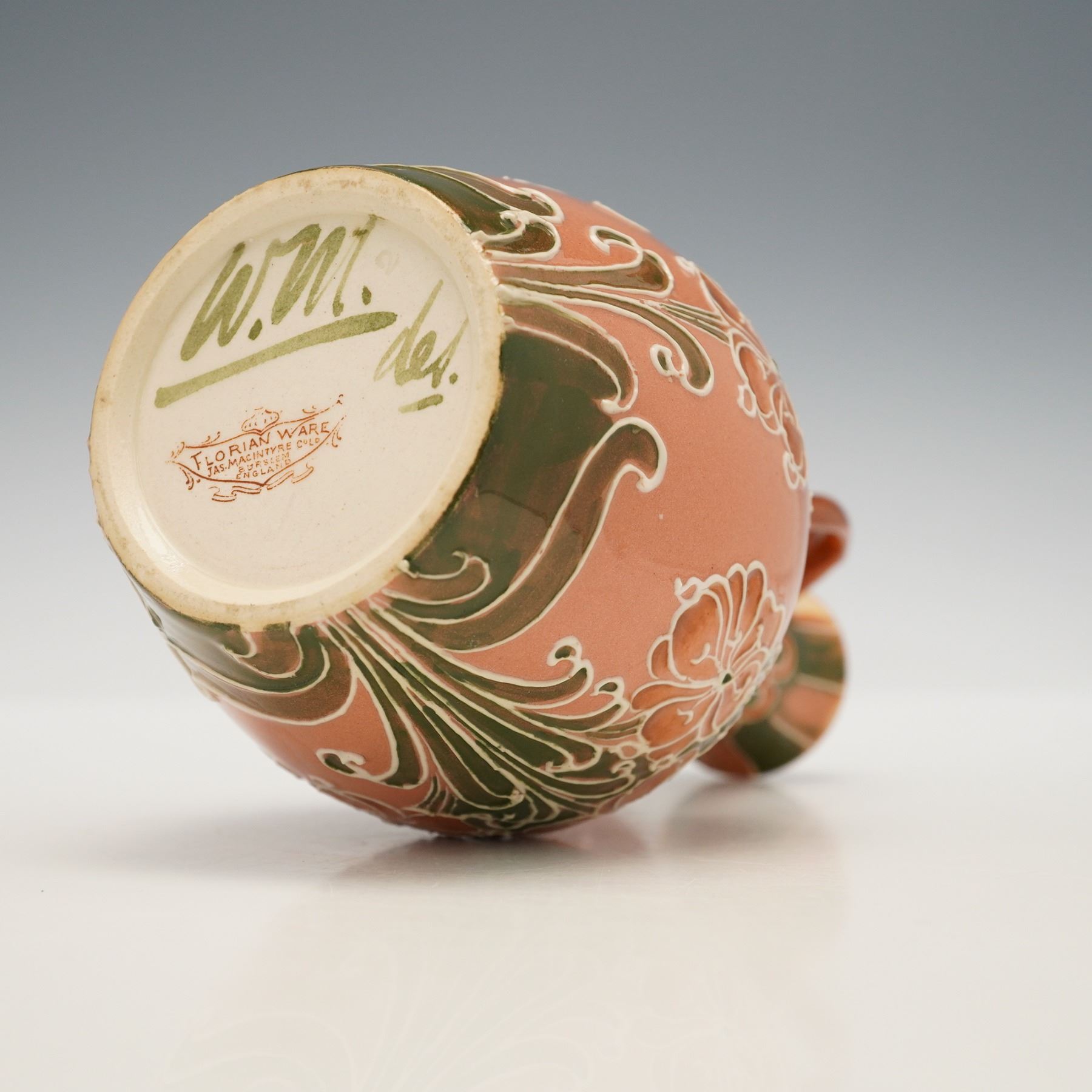 An early Florian Ware vase of baluster form with tall flared neck and sinuous twin handles. It is decorated in pale salmon and olive-green glazes with incised and tube lined stylized floral motifs in the Art Nouveau manner. Signed "WM" and "des" to underside. Florian Ware Macintyre backstamp.