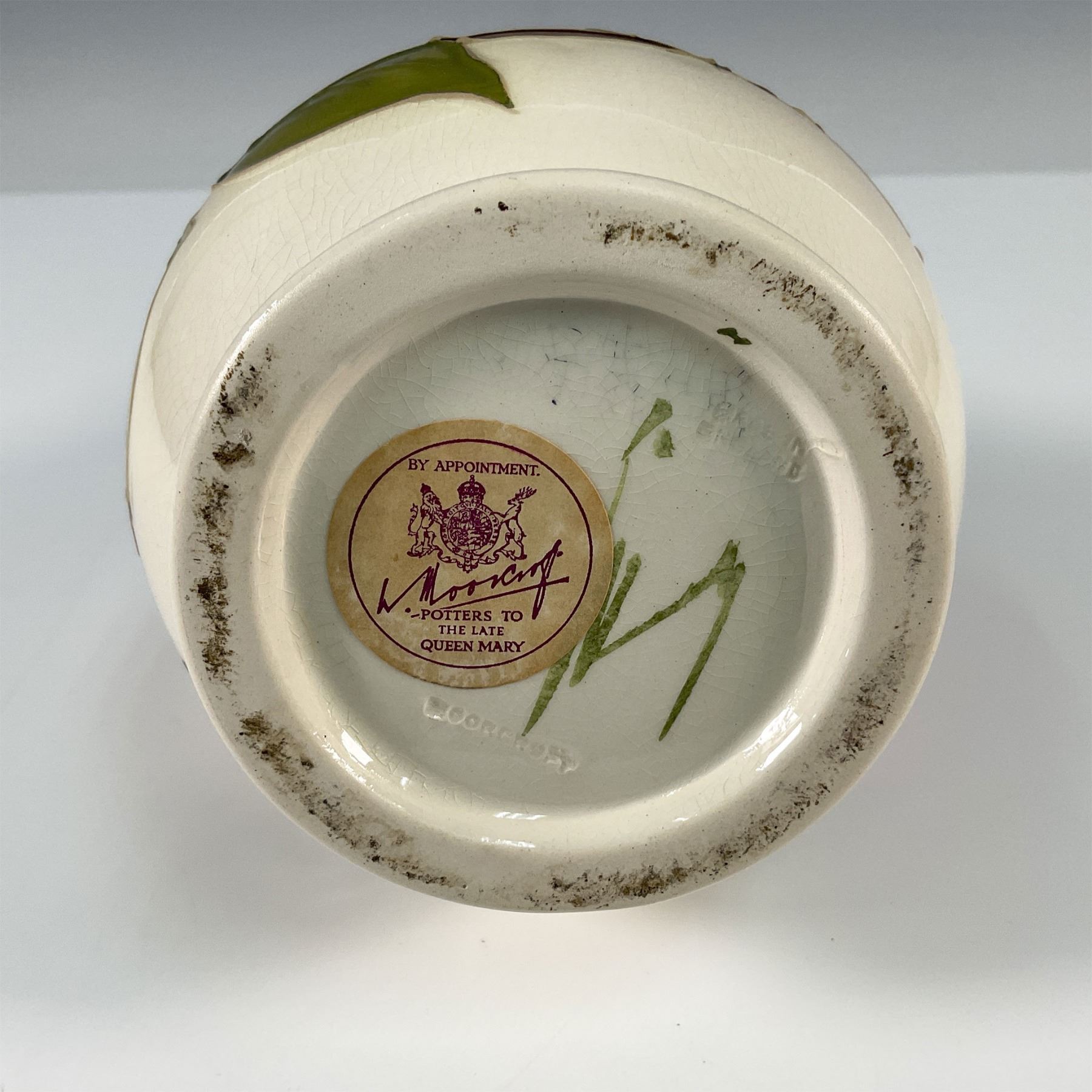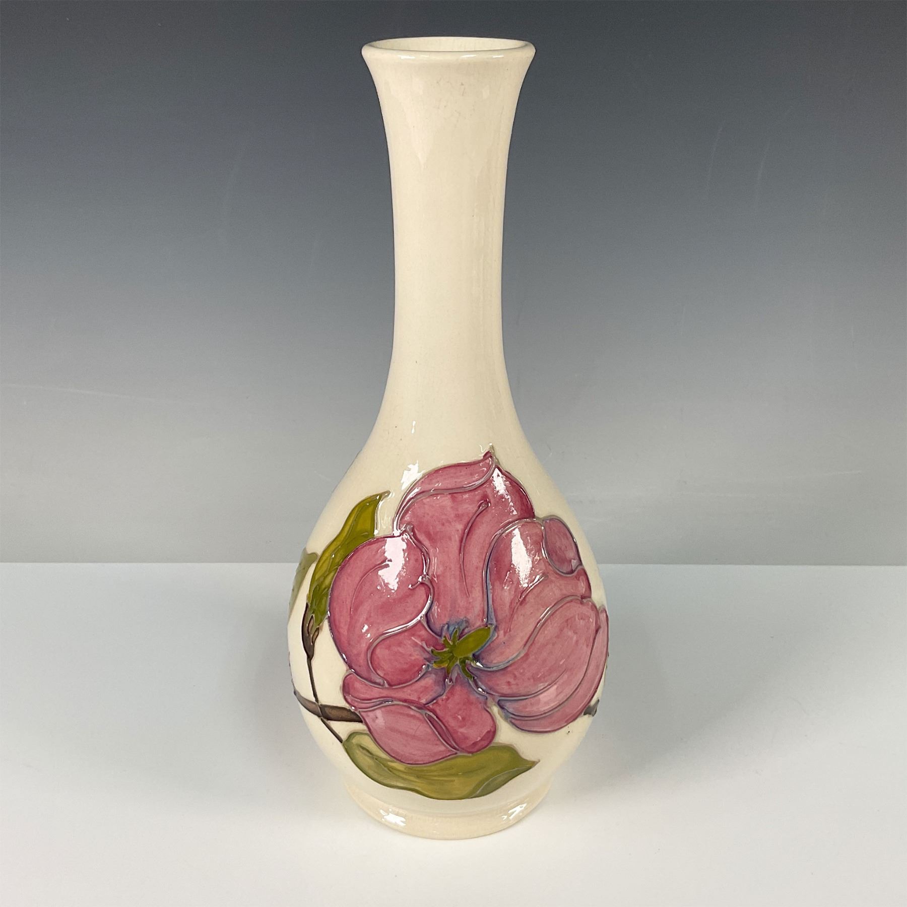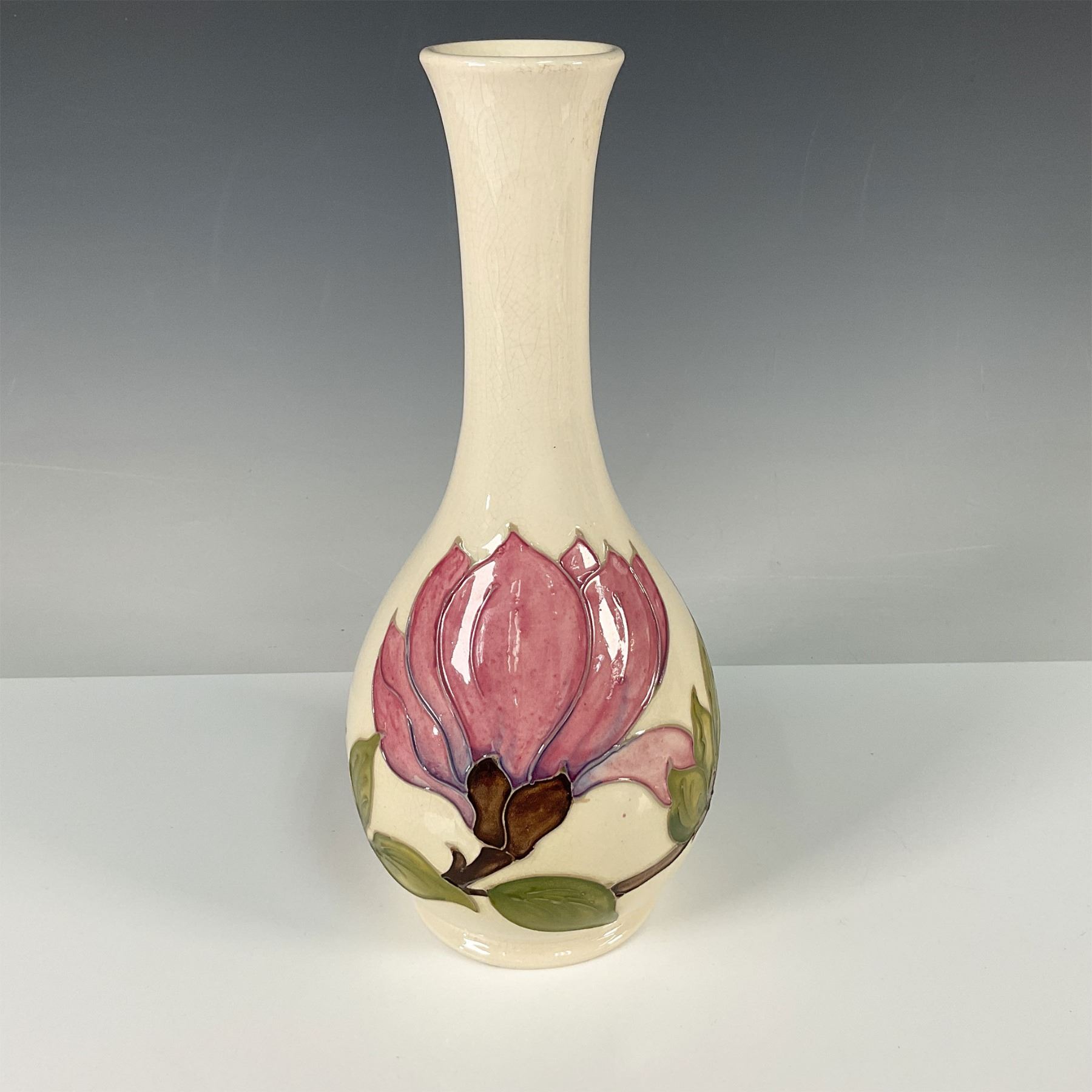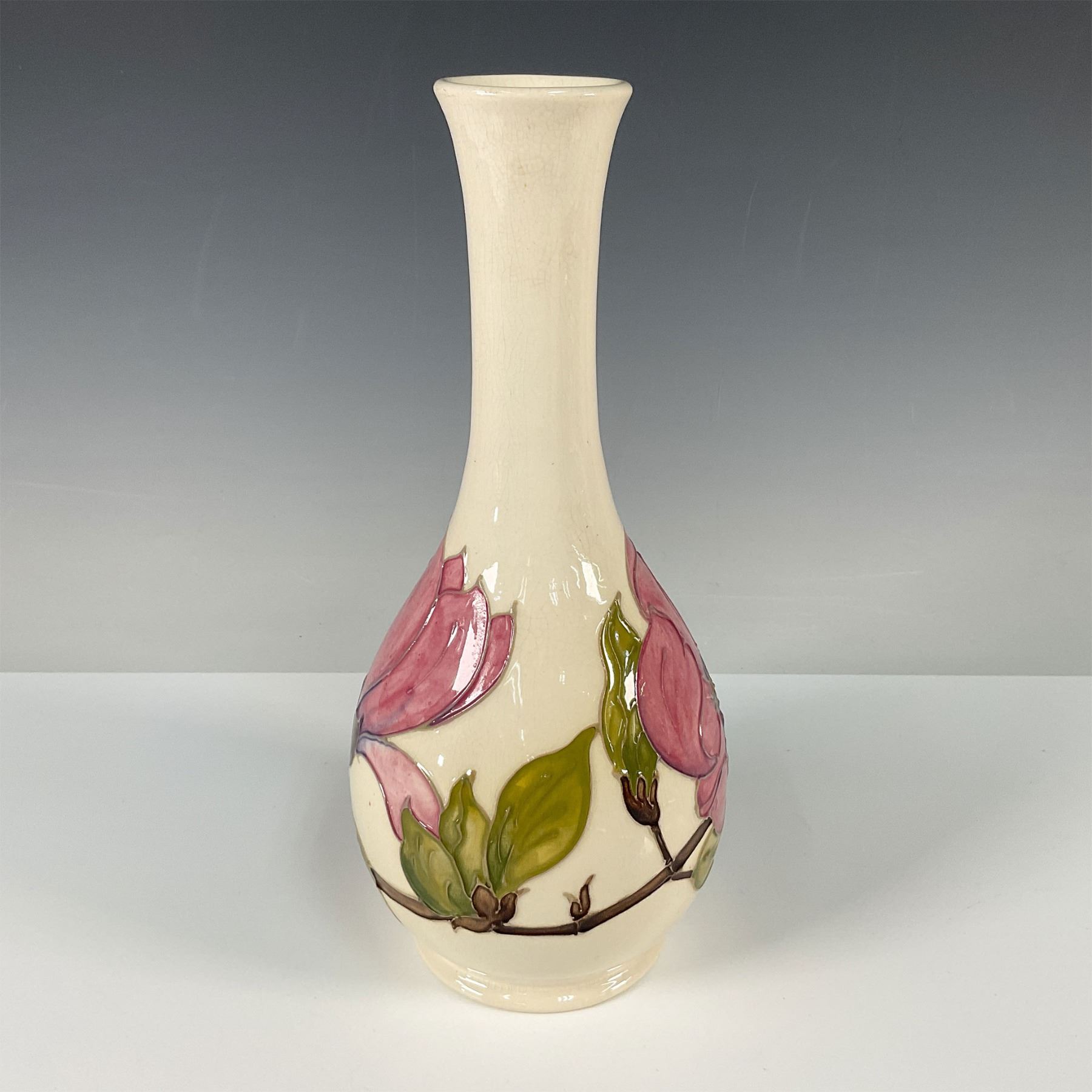This elegant vase features a stunning hand-painted design of a pink magnolia flower, set against a soft cream background. The detailed floral motif is brought to life with Moorcroft's signature raised tubelining technique, showcasing vibrant pink petals and rich green foliage. Moorcroft marked. Labeled, Potters to the Late Queen Mary.