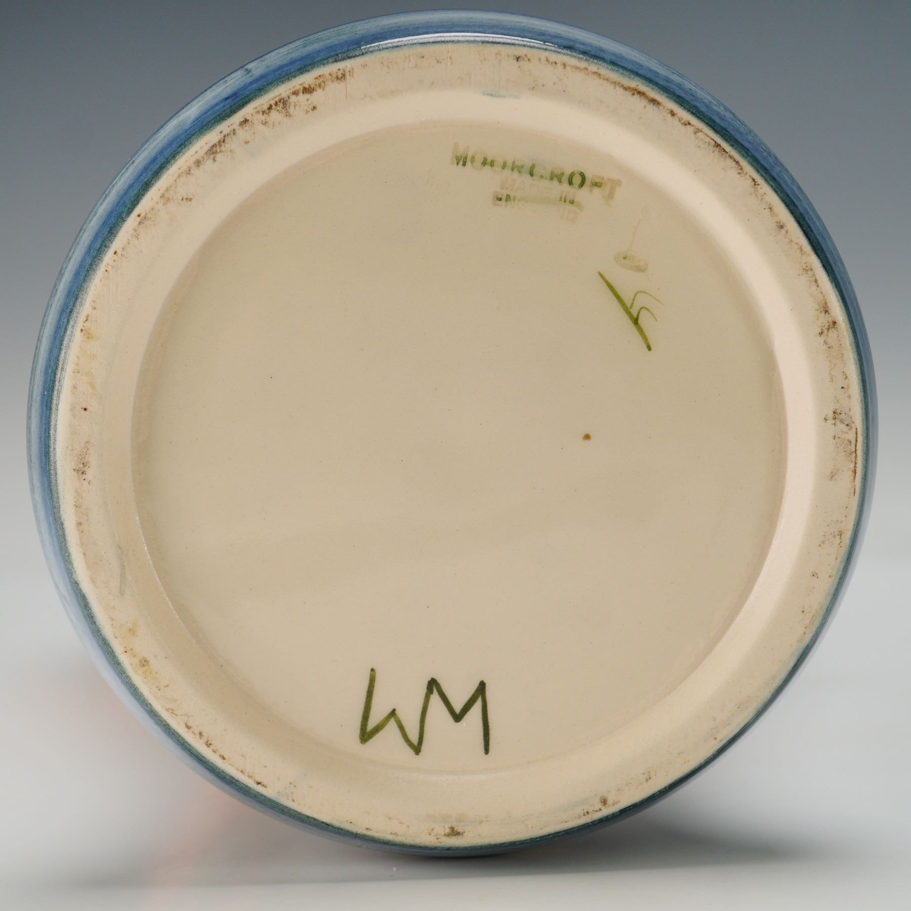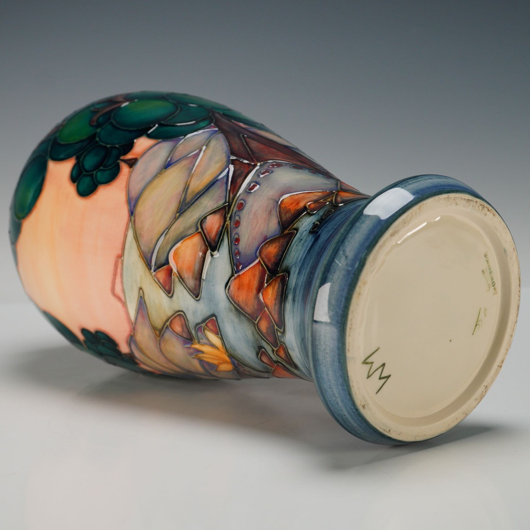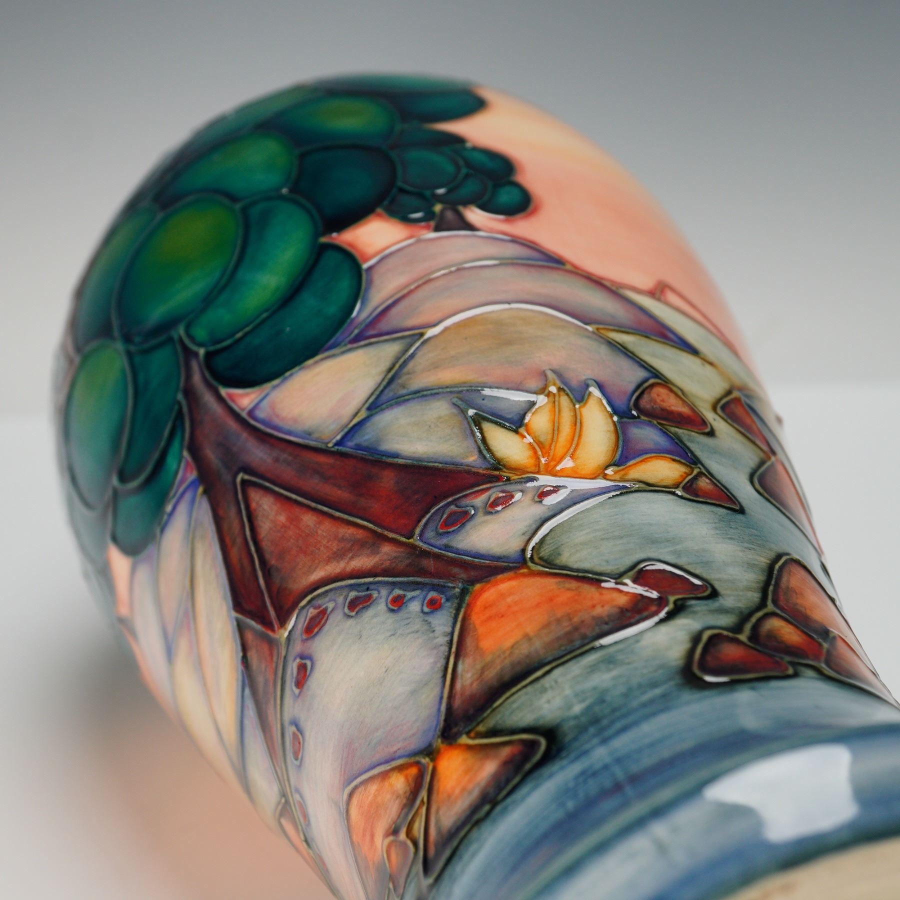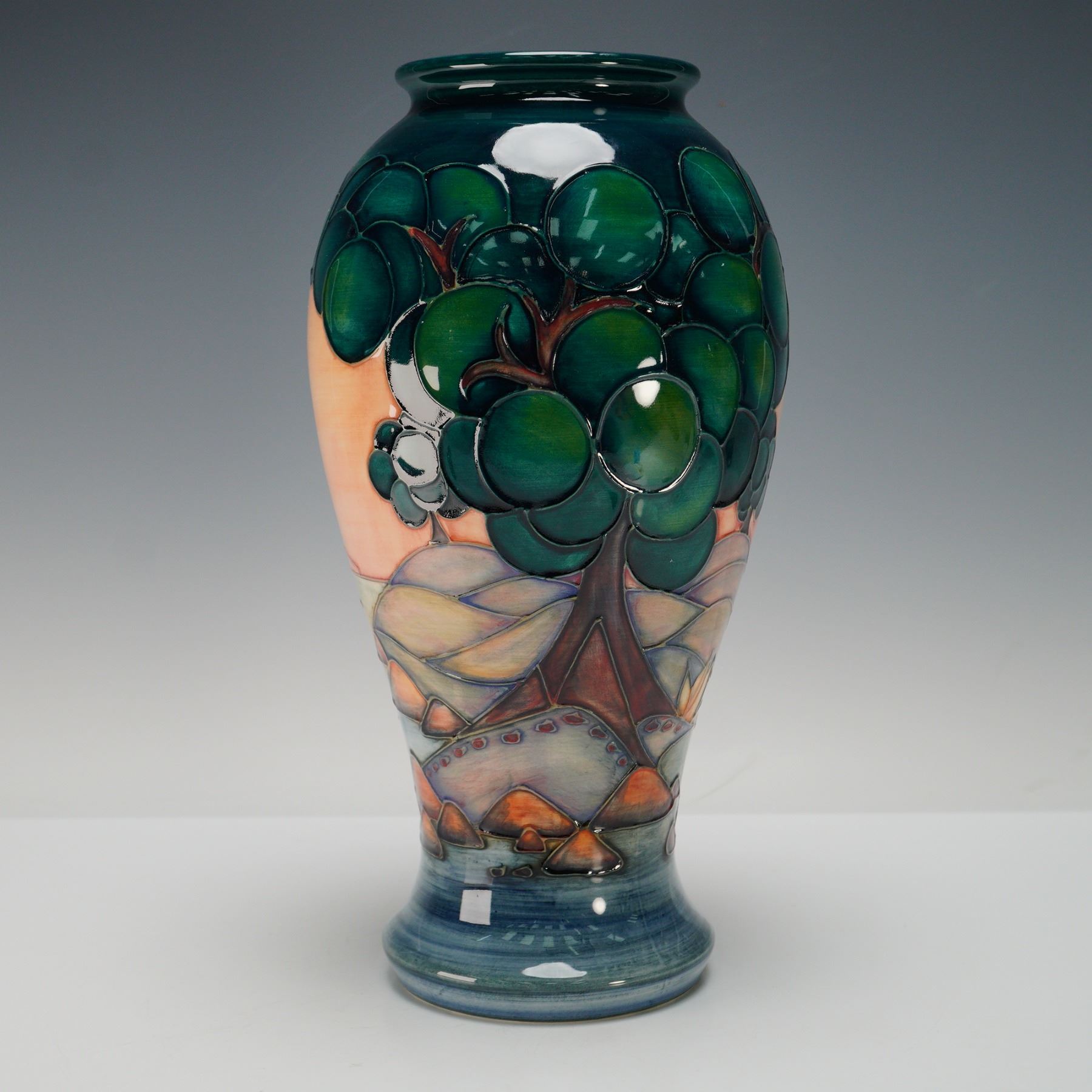A Moorcroft Pottery Mamoura vase, designed by Sally Tuffin, showcasing a stylized landscape pattern in the bold, geometric tradition of her designs. The tubelined decoration features rolling hills in terracotta and ochre tones, a flowering bloom at the base, and a large central tree with rich green foliage silhouetted against a peach sunset sky. The design is strikingly modern yet rooted in Moorcroft's heritage of vibrant glazes and craftsmanship. The underside is impressed Moorcroft Made in England and bears painted factory marks and the WM monogram.