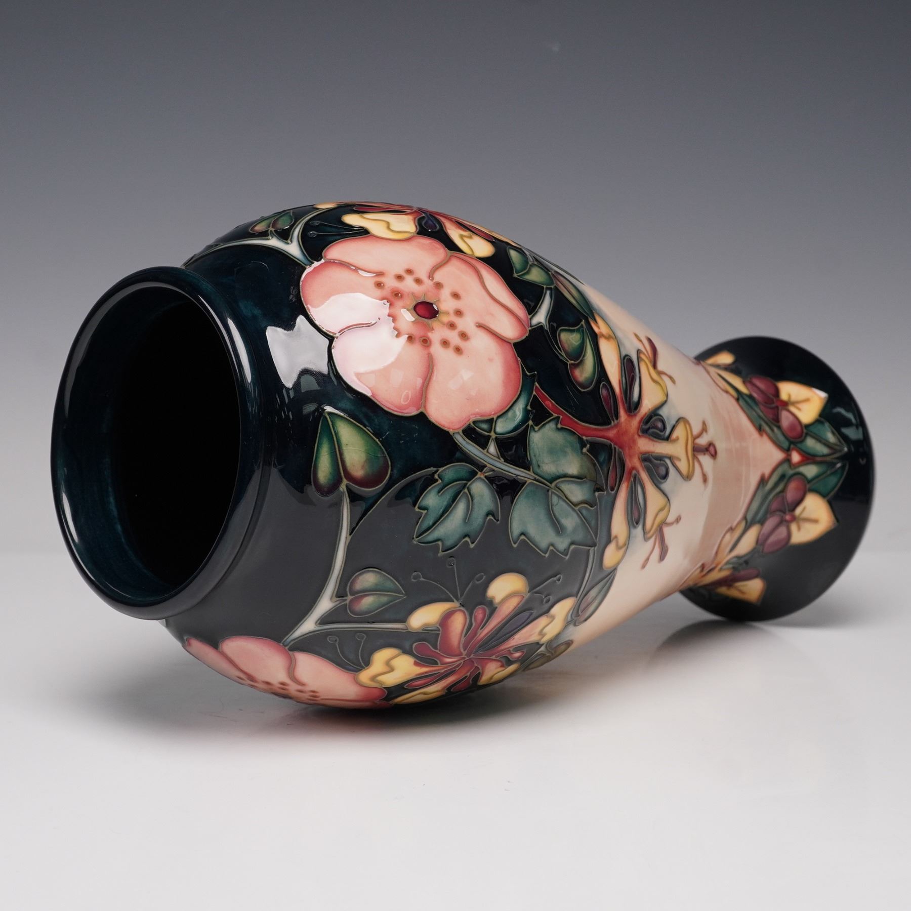 A Moorcroft Pottery Oberon Honeysuckle vase designed by Rachel Bishop. The design features vibrant, tubelined honeysuckle blossoms in tones of soft pink, yellow, and red, with leafy green foliage against a dramatic cobalt ground that fades into a cream blush base. Bishop's floral motifs pay homage to the Arts and Crafts tradition, while displaying her distinctive sense of balance and color harmony. The underside bears the impressed Moorcroft Made in Stoke-on-Trent England mark with artist's cipher.