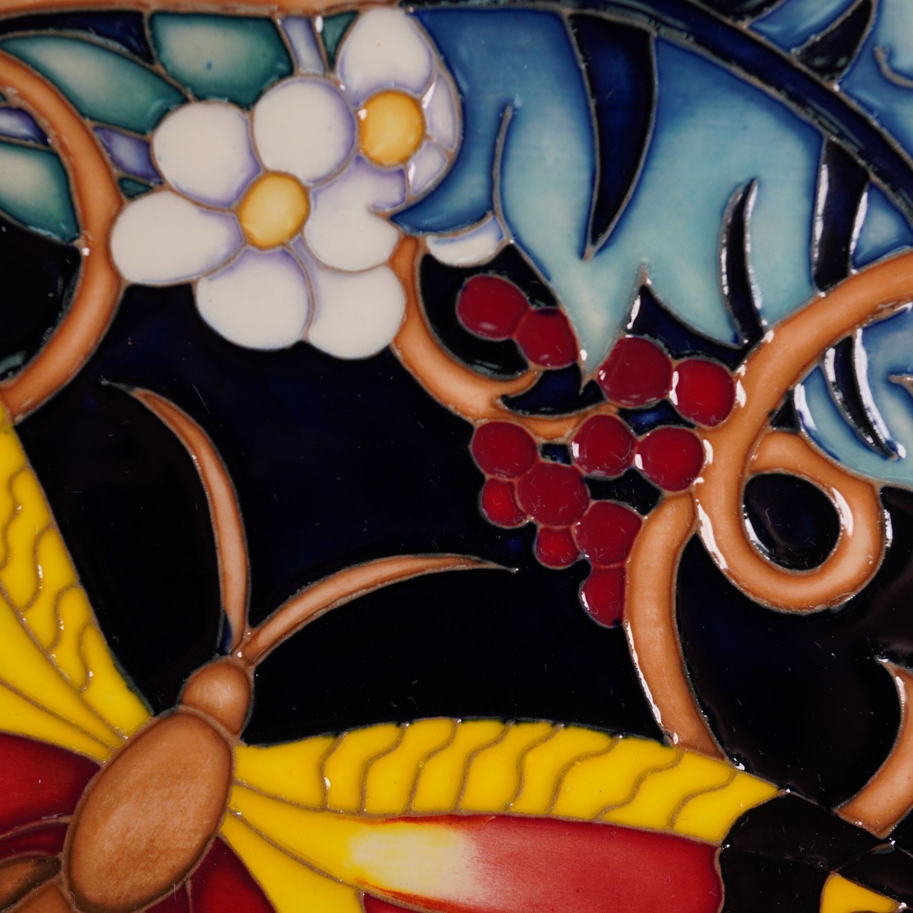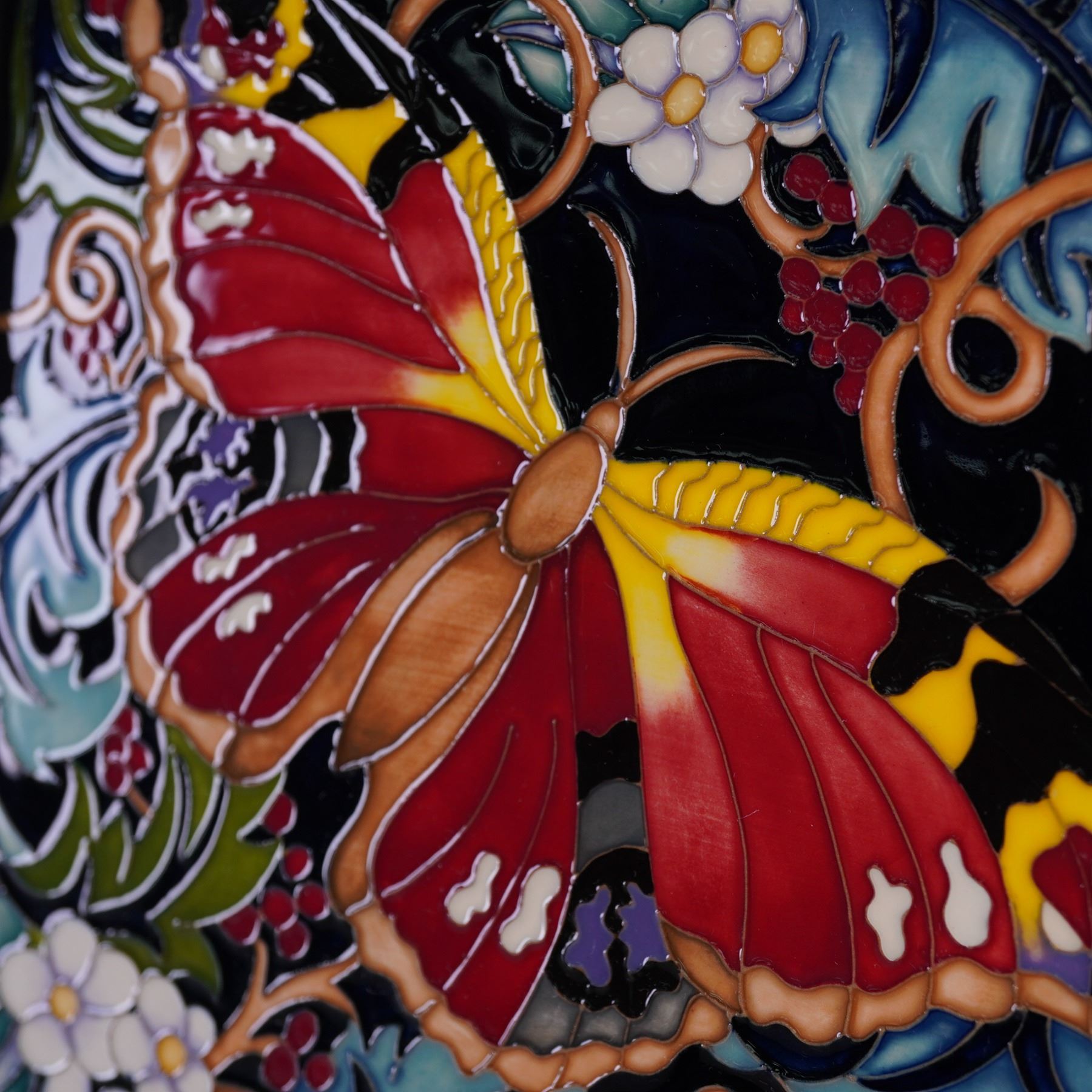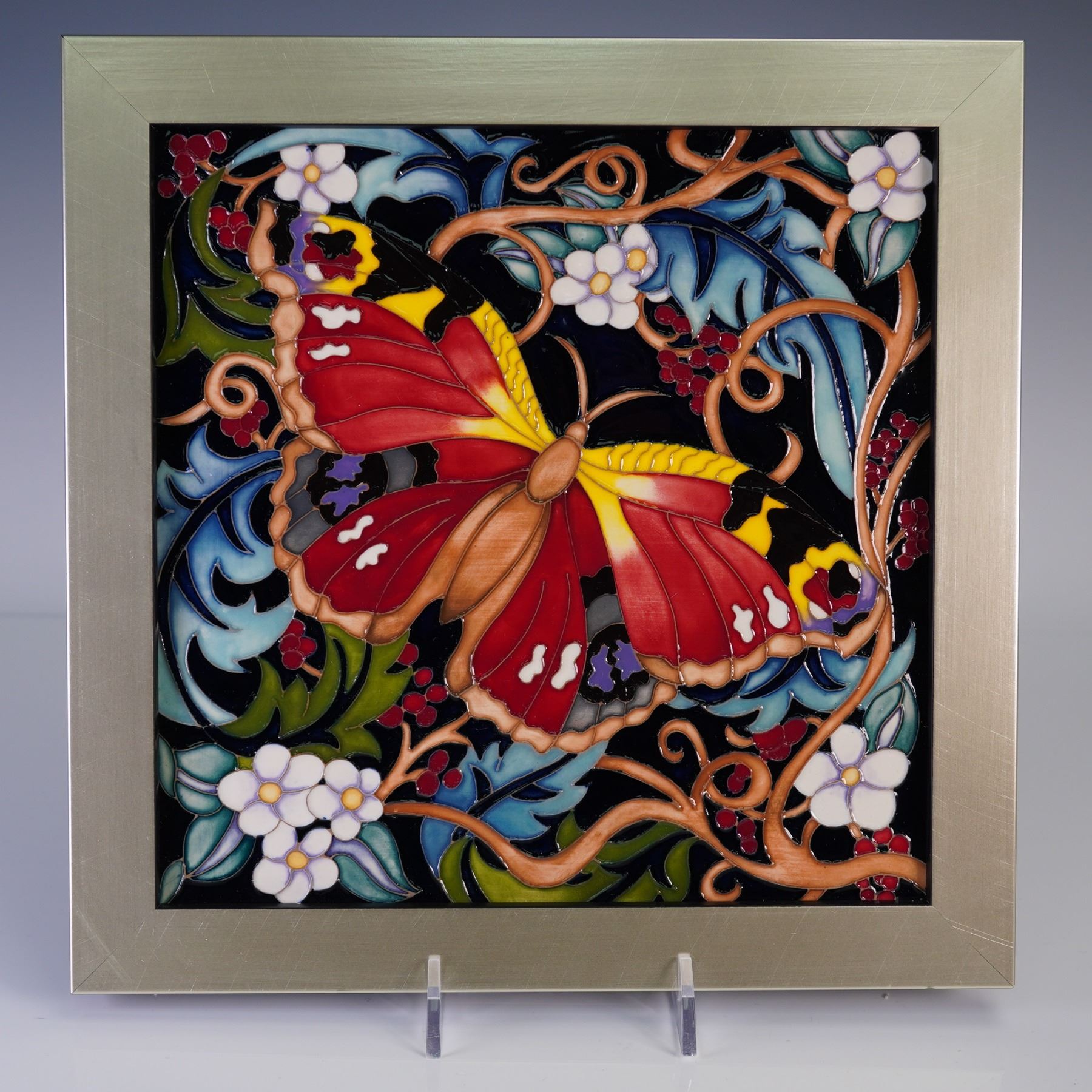 A limited edition, breathtaking piece depicting a butterfly with outstretched wings, giving an illusion of camouflage. The butterfly is surrounded by white florals on vines and foliage in tones of blue red, brown, green. Set against a navy blue ground. Housed in a soft toned gold and black frame. Signed Rachel Bishop and dated to back. Moorcroft impressed backstamp.