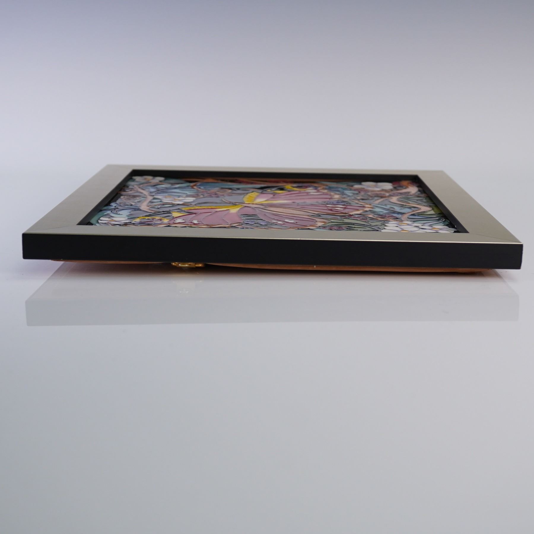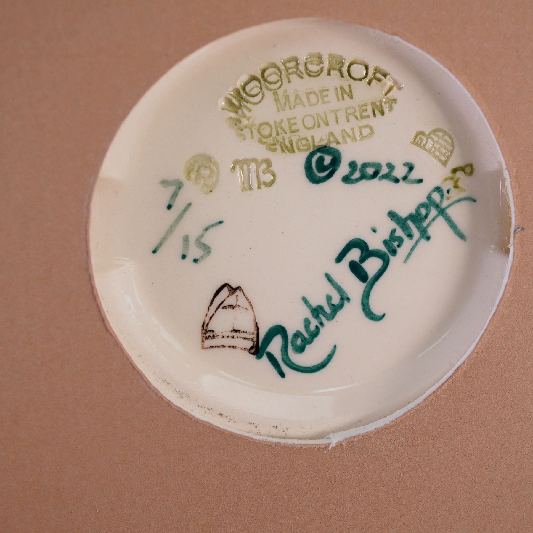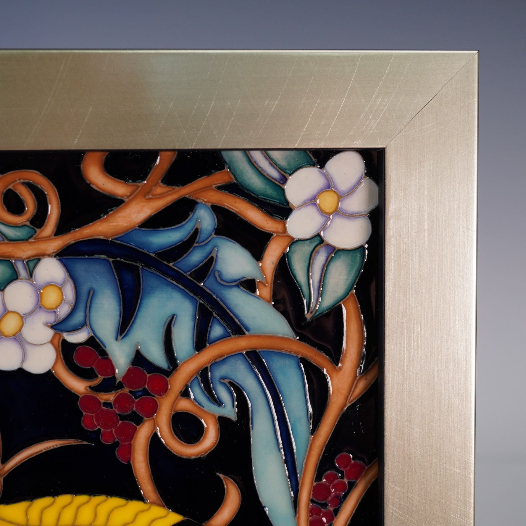 A limited edition, breathtaking piece depicting a butterfly with outstretched wings, giving an illusion of camouflage. The butterfly is surrounded by white florals on vines and foliage in tones of blue red, brown, green. Set against a navy blue ground. Housed in a soft toned gold and black frame. Signed Rachel Bishop and dated to back. Moorcroft impressed backstamp.