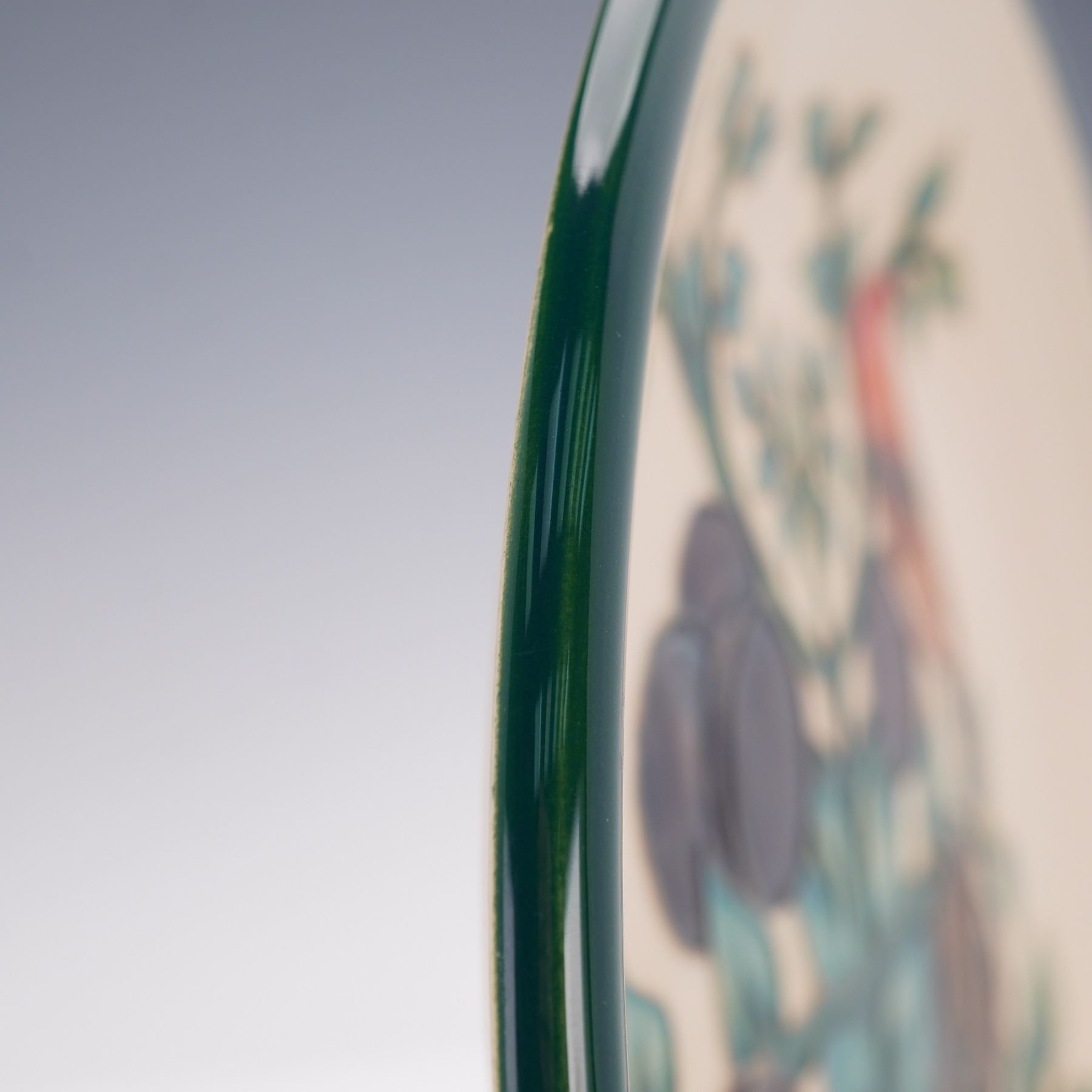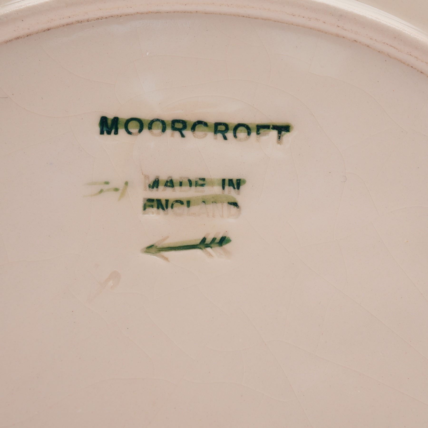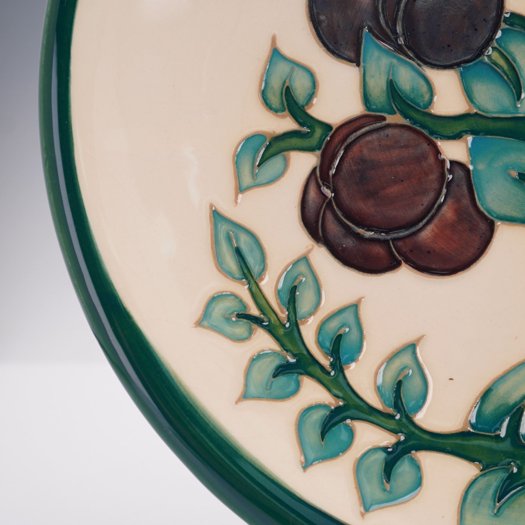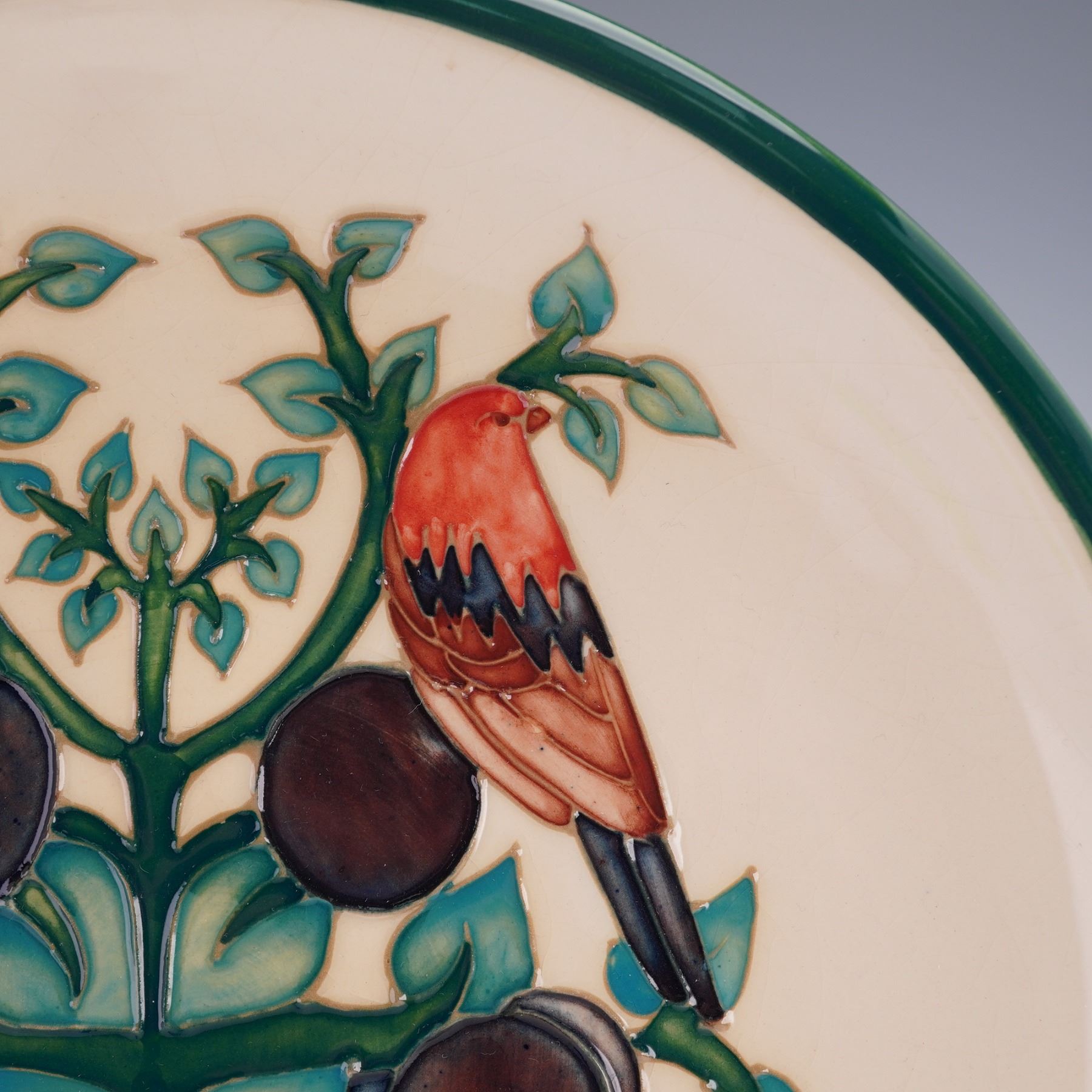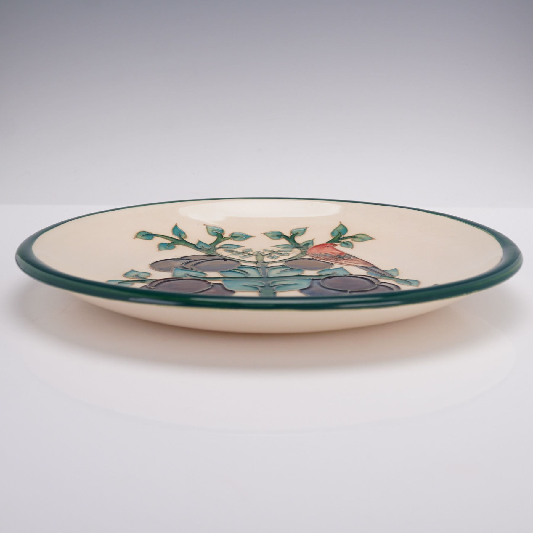 Moorcroft pottery plate featuring the Plum Trees and Bird pattern designed by Sally Tuffin circa 1995. Tuffin, a celebrated British designer and leading force in Moorcroft's late 20th century revival, introduced bold natural themes that are highly sought after by collectors. A compelling example of modern Moorcroft art from a high-demand designer era. Decorated in vivid tube-lined detail with plum clusters and a red bird against a cream ground and green border. The tube lined decoration reflects the Florian tradition established by William Moorcroft at the turn of the twentieth century, where raised slip outlines and translucent glazes created the glowing floral style that remains the hallmark of Moorcroft design. The motif carries traditional symbolism, with the plum representing vitality, renewal, and abundance, while the bird symbolizes harmony and freedom. Together they form an emblem of resilience and joy in nature. The underside is impressed Moorcroft and Made in England with painted WM monogram, confirming its studio origin.