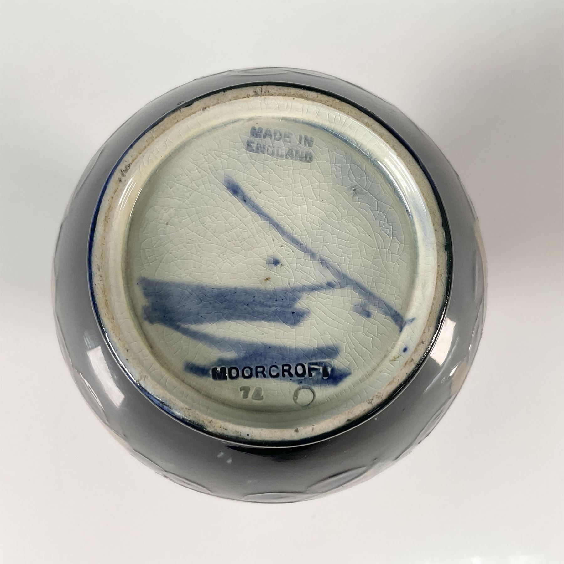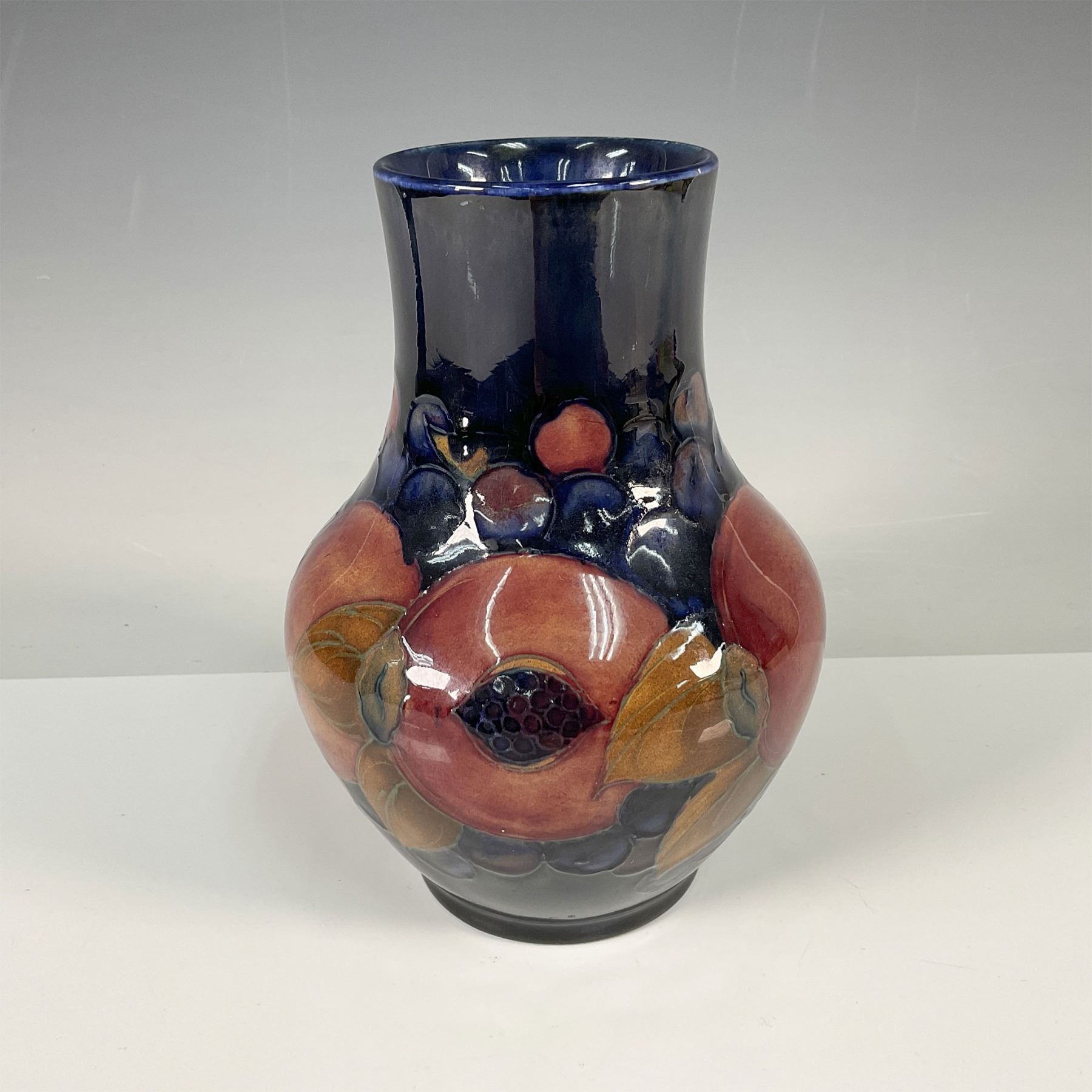 Moorcroft Pottery vase in the iconic Pomegranate pattern, featuring rich, hand-painted depictions of fruits in a vibrant palette of deep blues, reds, and oranges. This vase exemplifies Moorcroft's signature tube-lining technique, creating intricate, raised details. The base is marked "Moorcroft" and "Made in England," authenticating its origin. Measuring 6.75"H, this piece reflects the distinguished craftsmanship of early to mid-20th-century English art pottery.