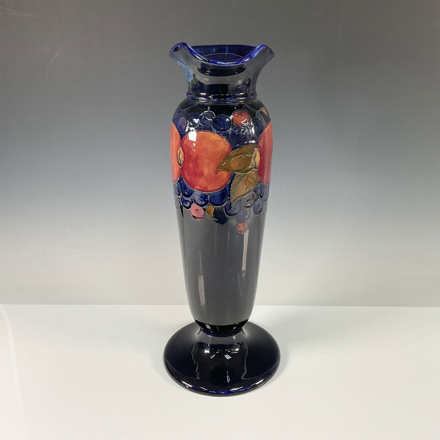 This elegant and large ewer features a vibrant hand-painted fruit motif on a rich cobalt blue ground. The design, a hallmark of Moorcroft's signature style, includes luscious pomegranate and berries in a bold color palette that contrasts beautifully with the deep blue glaze. Moorcroft marked.