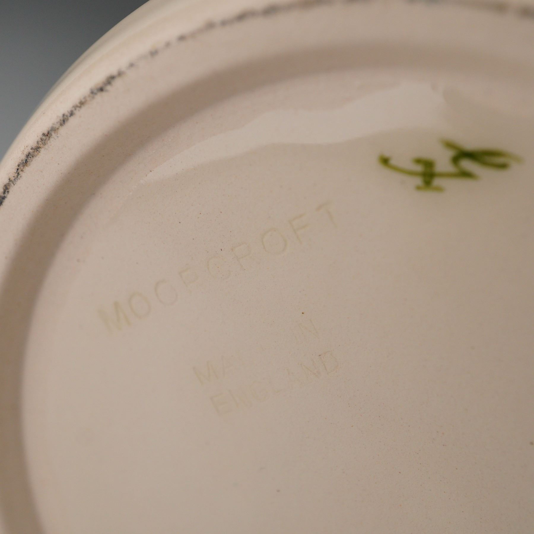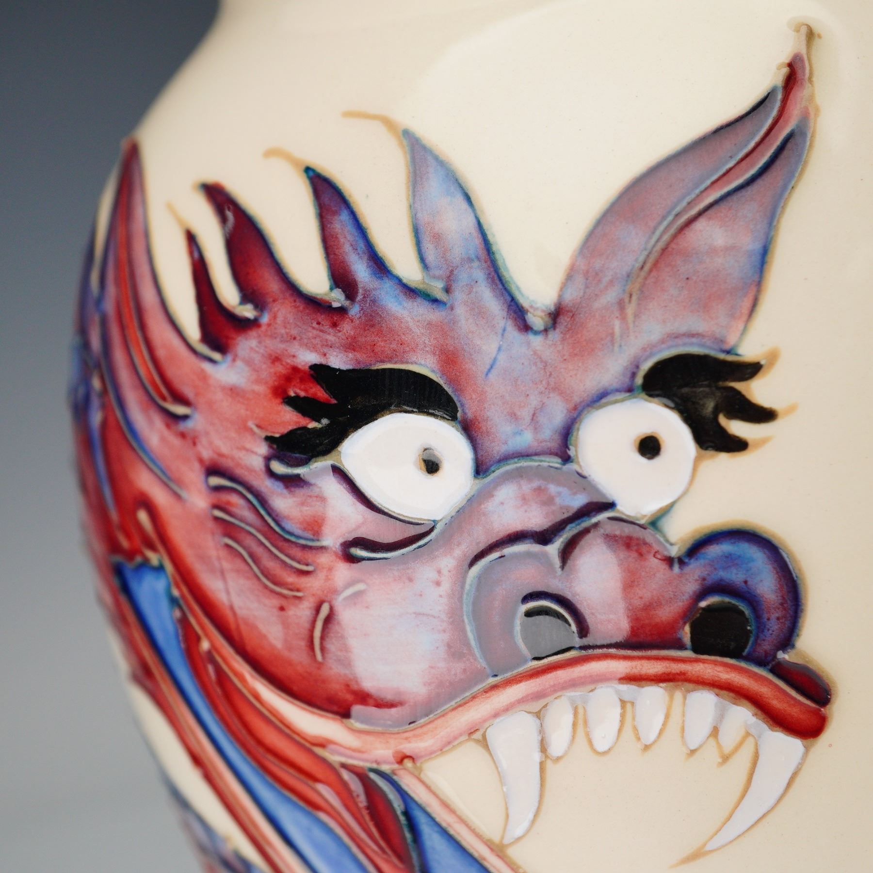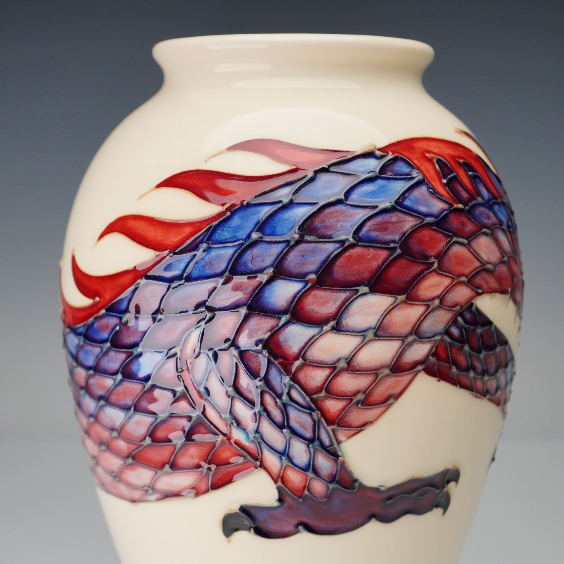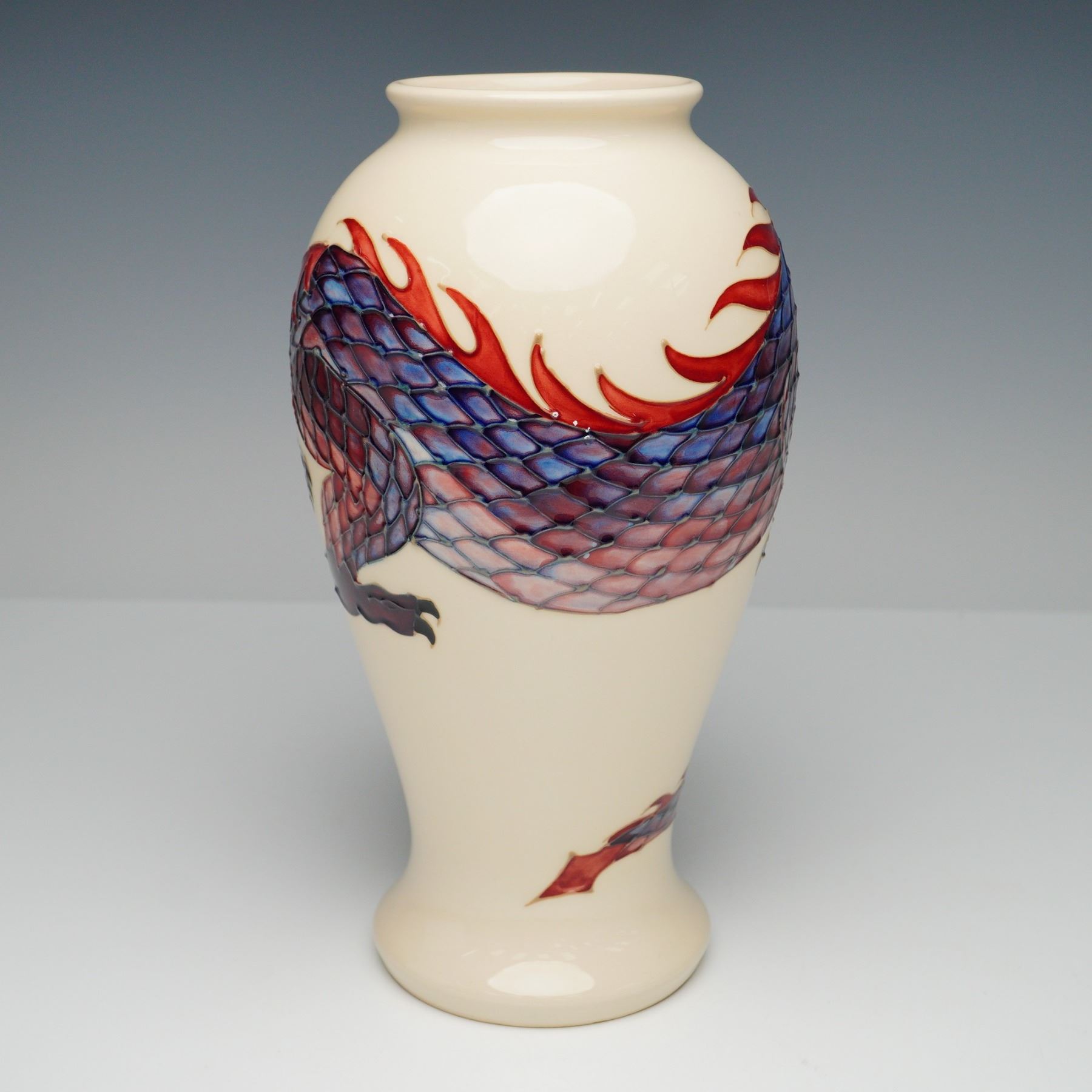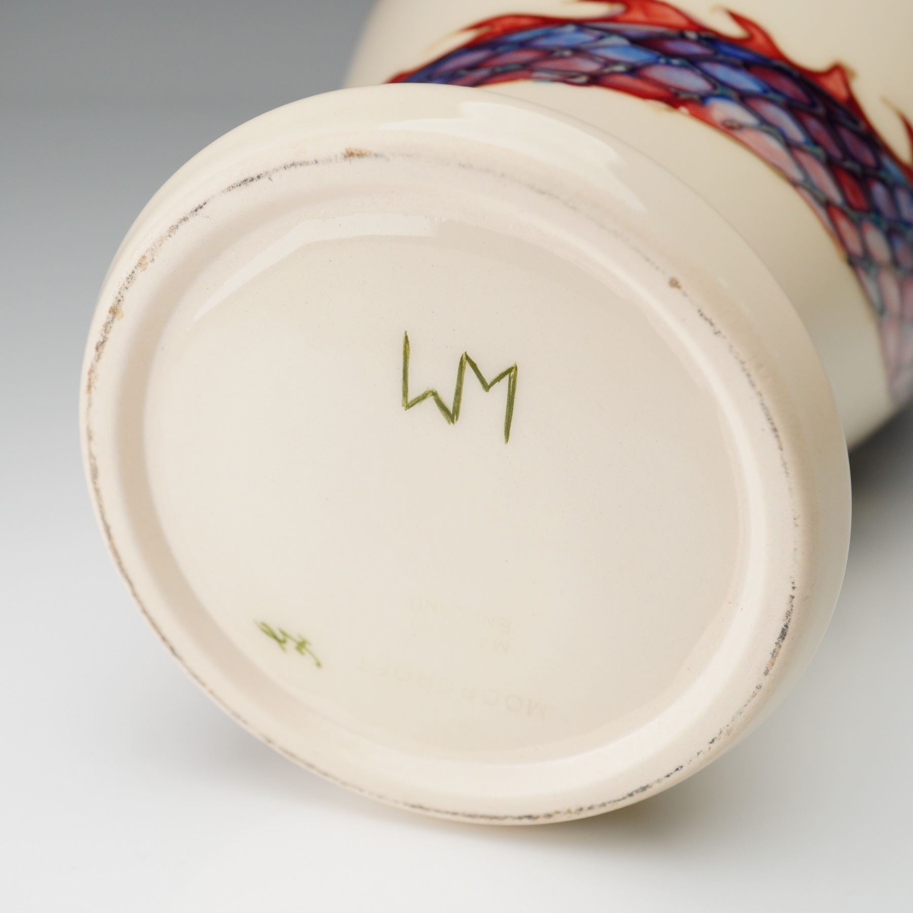 A Moorcroft Pottery vase featuring a hand-decorated dragon motif in vibrant high-gloss glazes. The design showcases a large, coiled dragon with detailed scales in blue, purple, and red. The dragon's exaggerated facial expression, complete with bold eyes and fanged mouth, exemplifies Moorcroft's signature tube-lining and deep color palette. The vase has a baluster form with a slightly flared rim and footed base. The underside is impressed with the MOORCROFT mark along with "Made in England" and features hand-painted initials "WM."