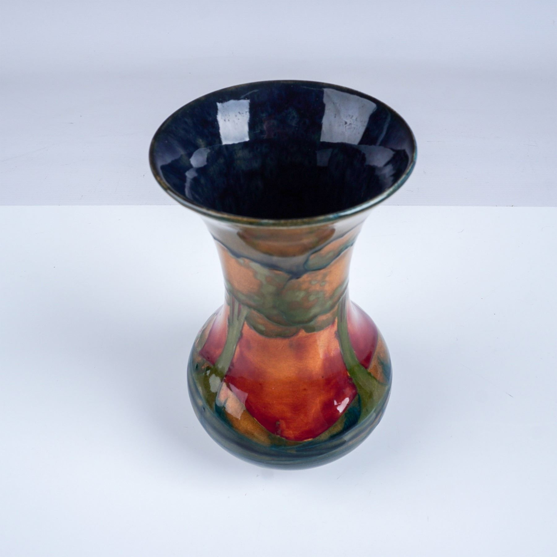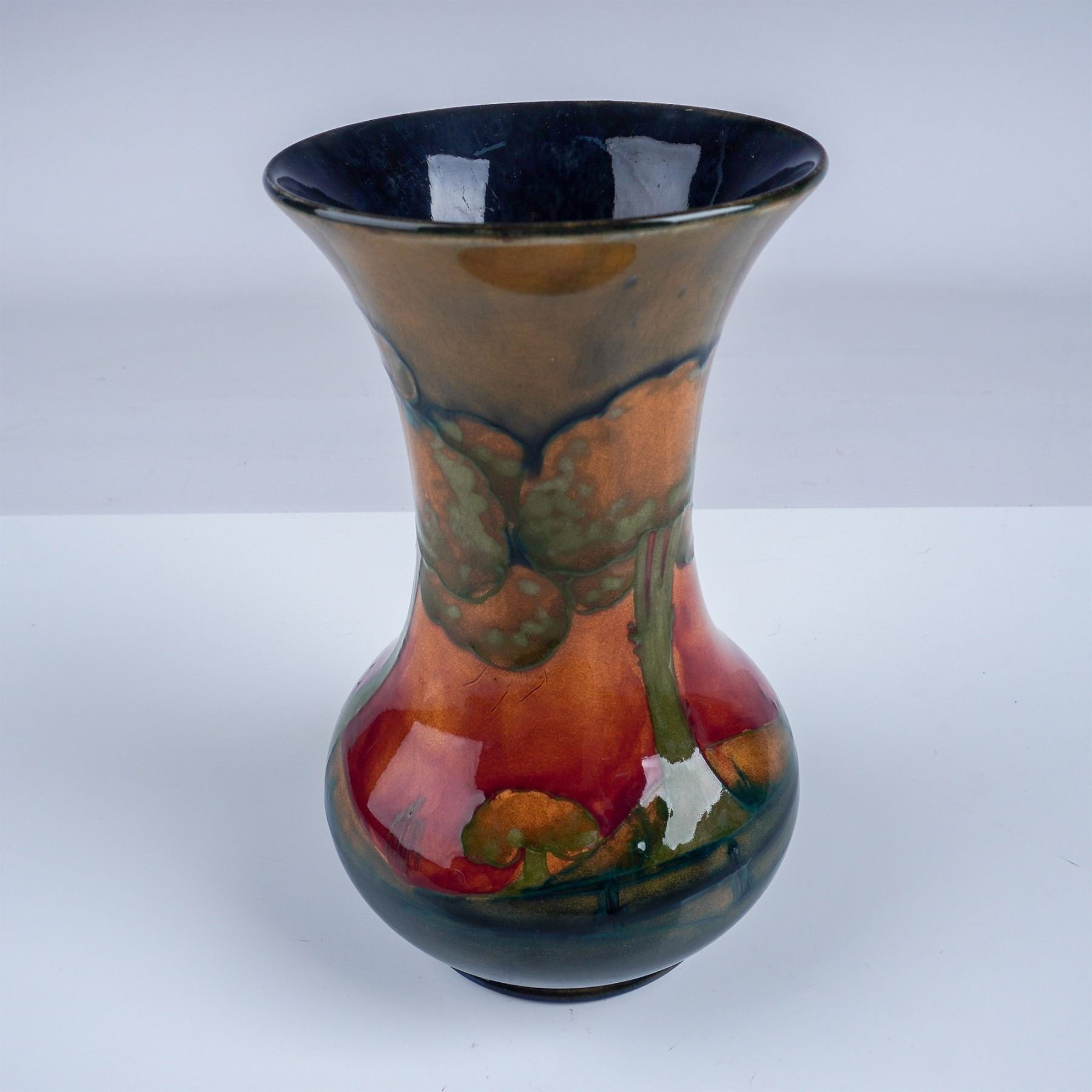 A stunning Moorcroft vase in the sought-after Eventide pattern. This hand decorated vase showcases a serene landscape of trees against a glowing sunset-inspired backdrop of deep oranges, reds, and greens. The flared rim and elegant curves emphasize the intricate detailing and gradient glazing, characteristic of Moorcroft's artistry. Moorcroft marked. Artist signed.