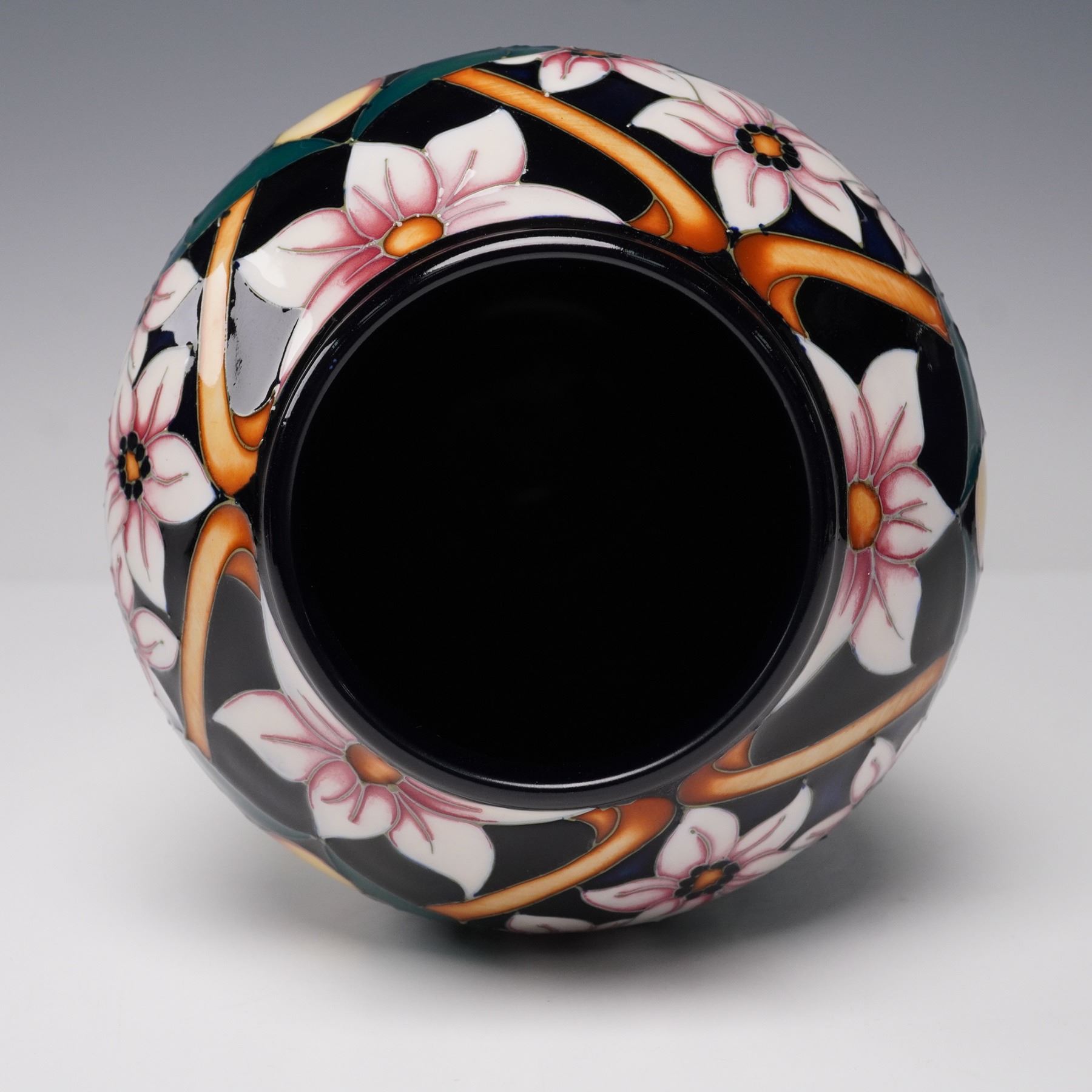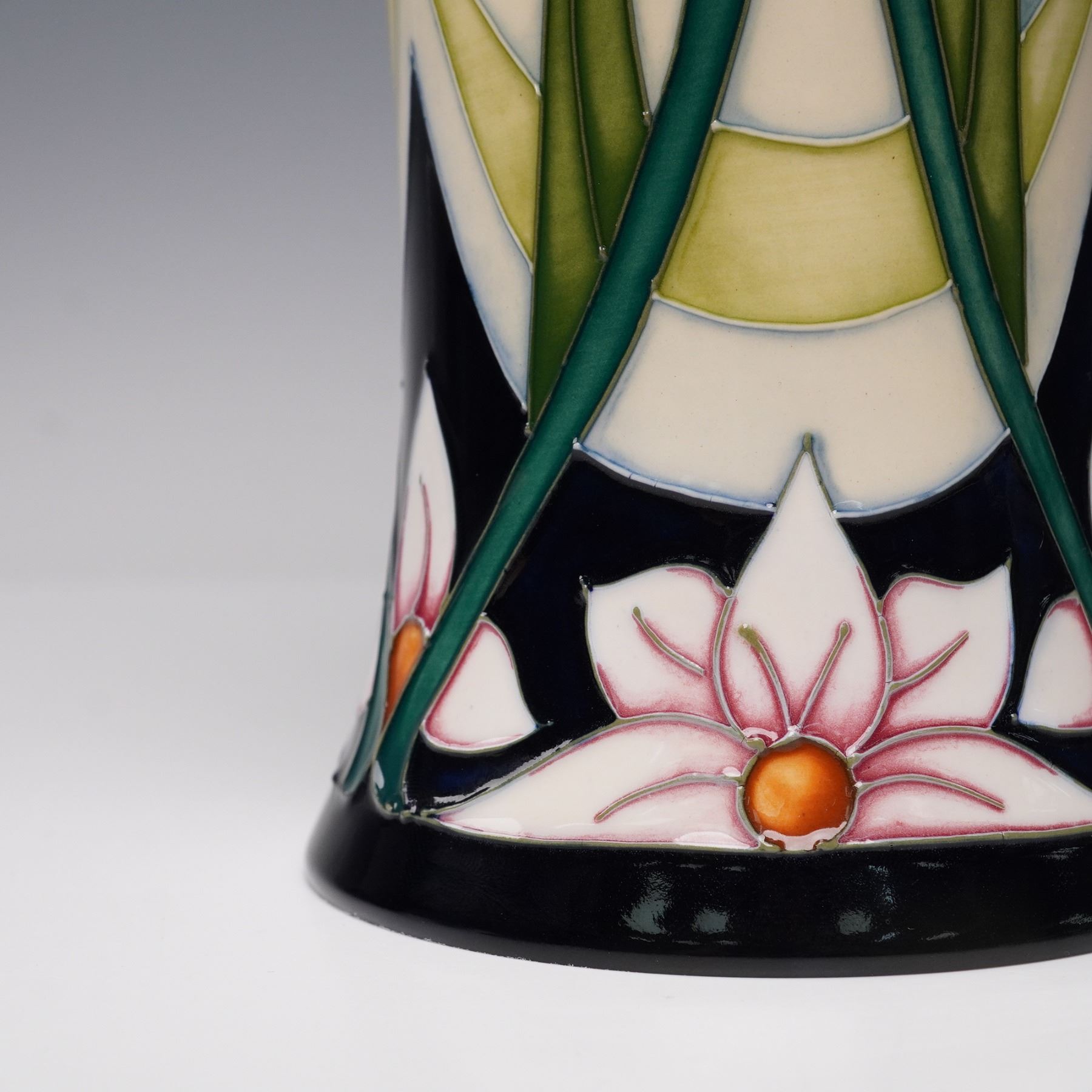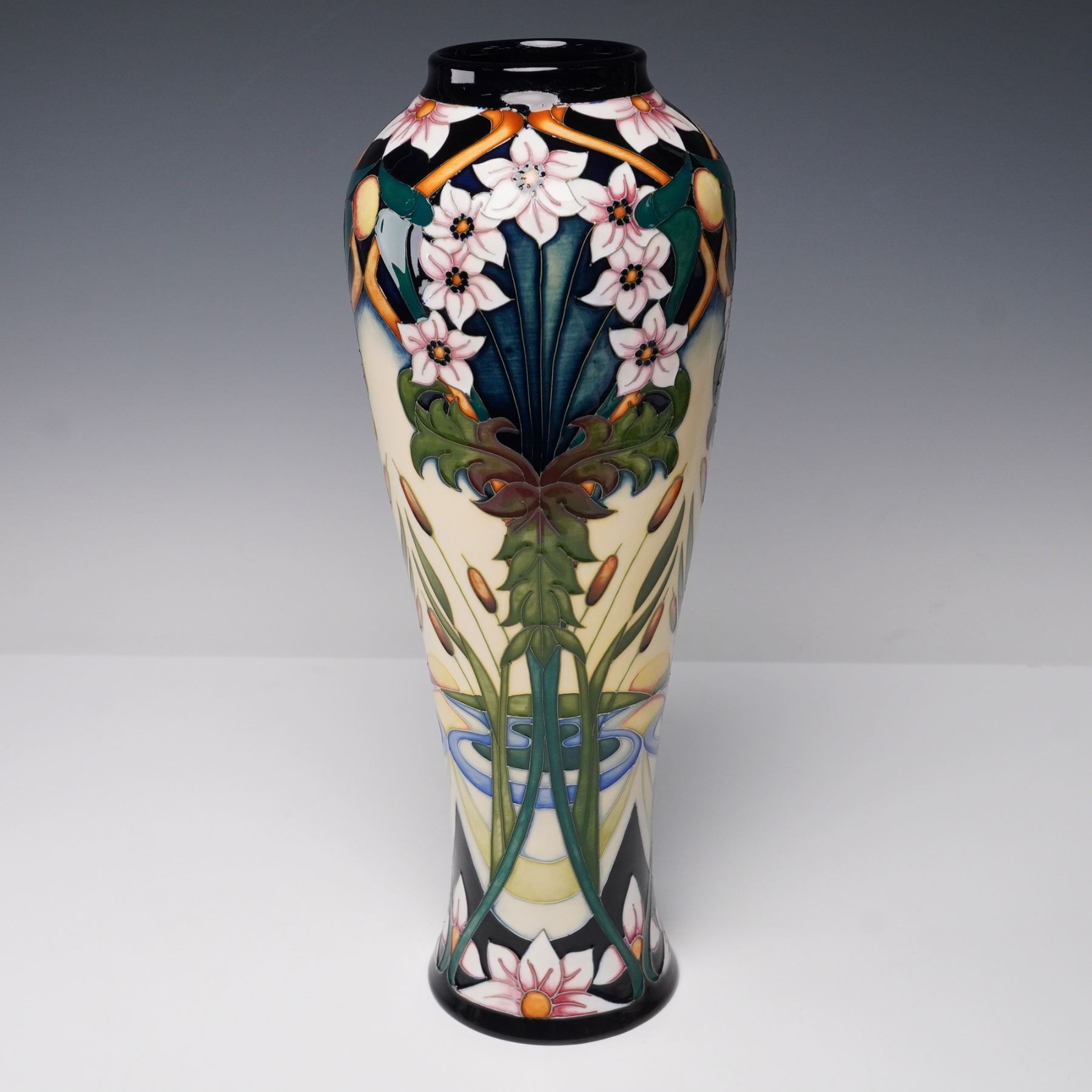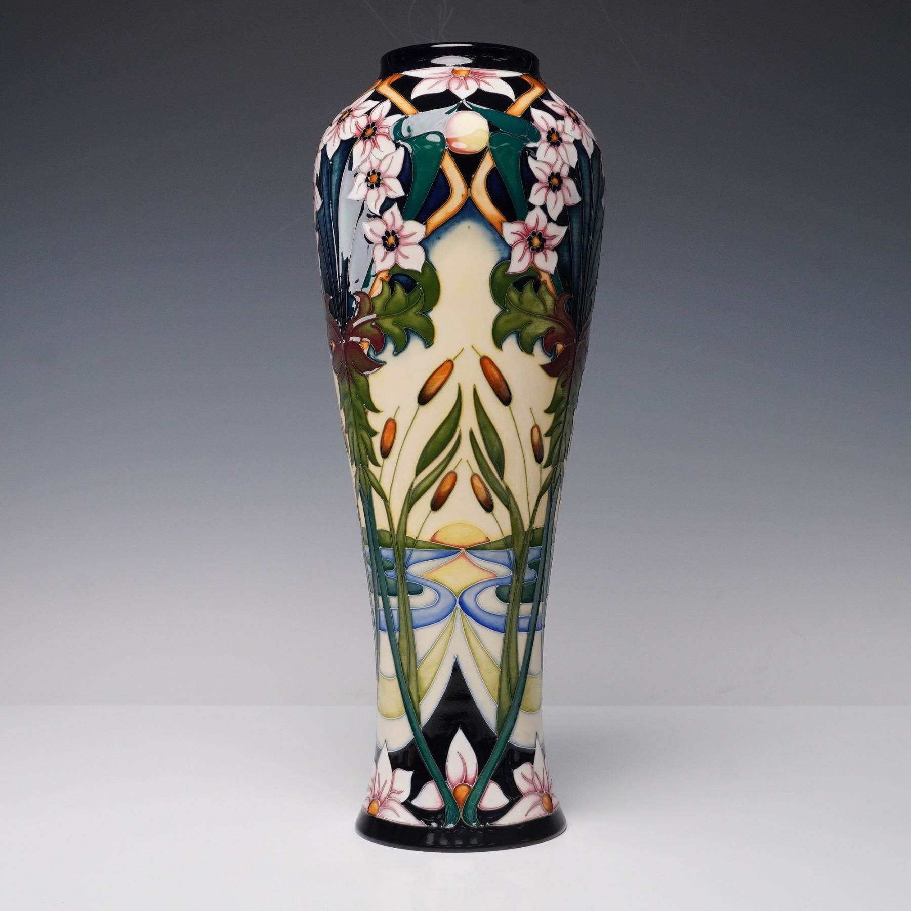 This Moorcroft Pottery Avon Water vase features a graceful elongated form decorated with an intricate floral and landscape motif. The design by Rachel Bishop incorporates delicate blossoms and reeds set against flowing water, executed in Moorcroft's signature tubelined style with vivid enamel glazes. Limited edition of 200 bears the full impressed and painted Moorcroft marks to the base along with the designer's signature. Includes original box.