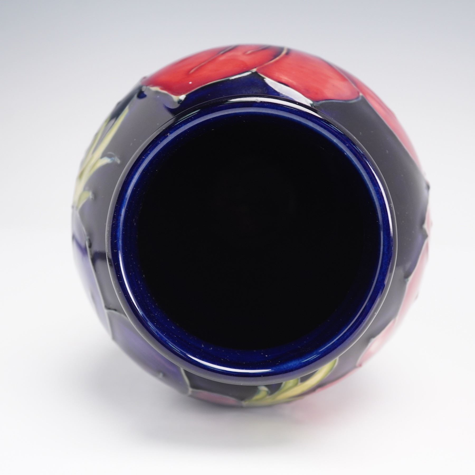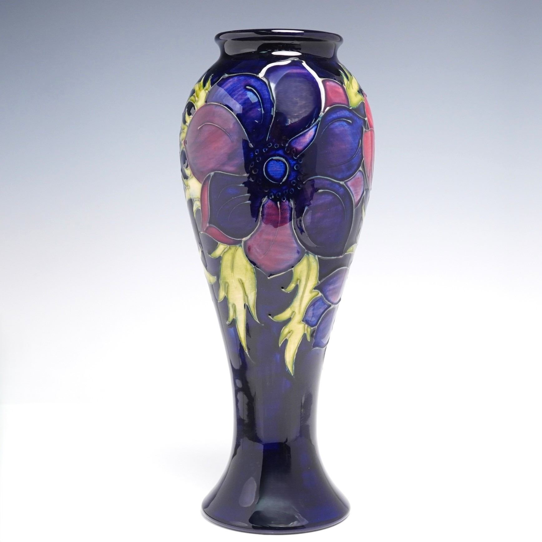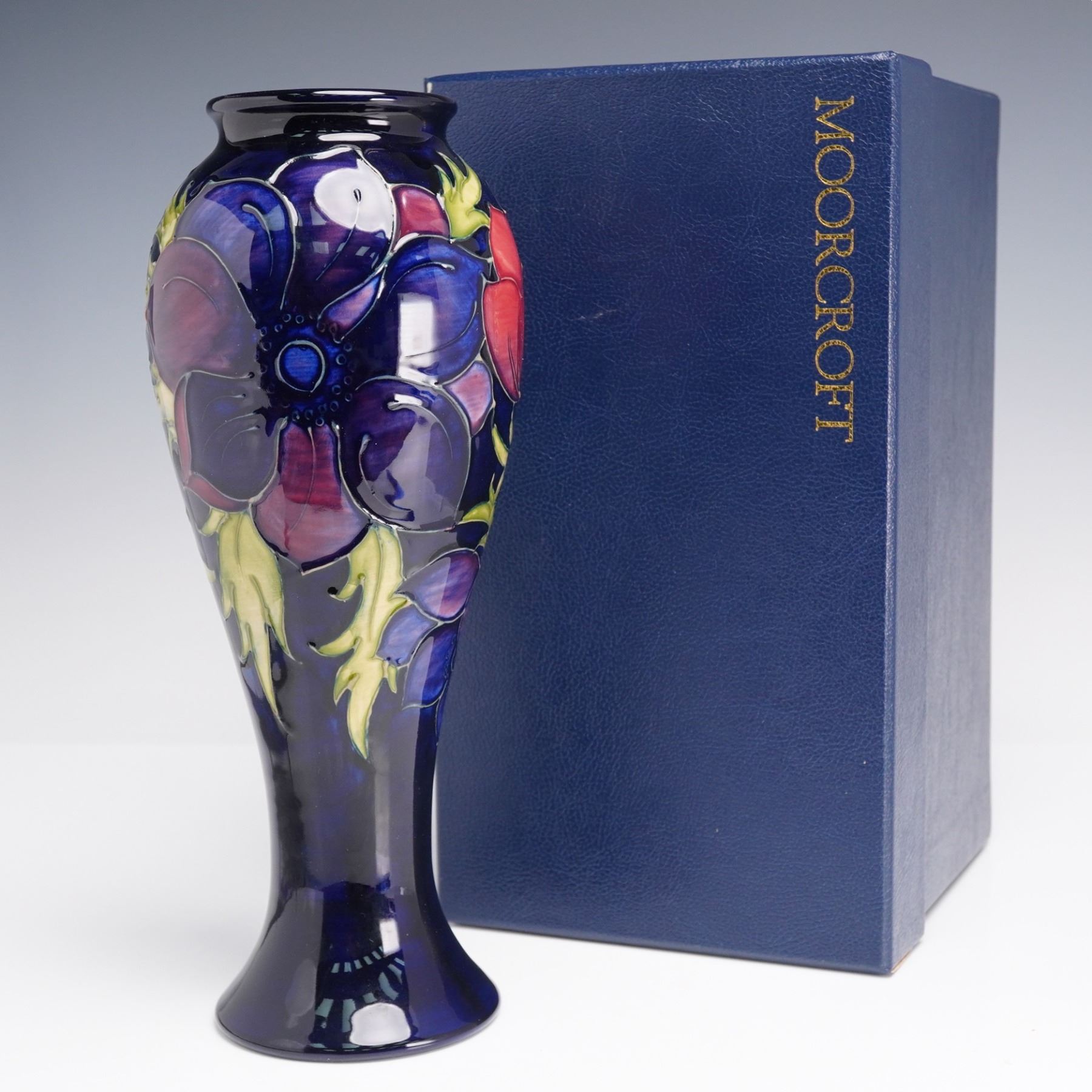 Featuring the Anemone pattern on a cobalt-blue ground with raised and tube-lined decoration in red, purple, and green glazes. The tall baluster form vase has a flared base and narrow rim. The underside bears the impressed Moorcroft stamp, along with the WM monogram. On the underside, the vase carries the Moorcroft 'eye' year cypher, indicating it was made in 1994. The piece is accompanied by its original Moorcroft presentation box.