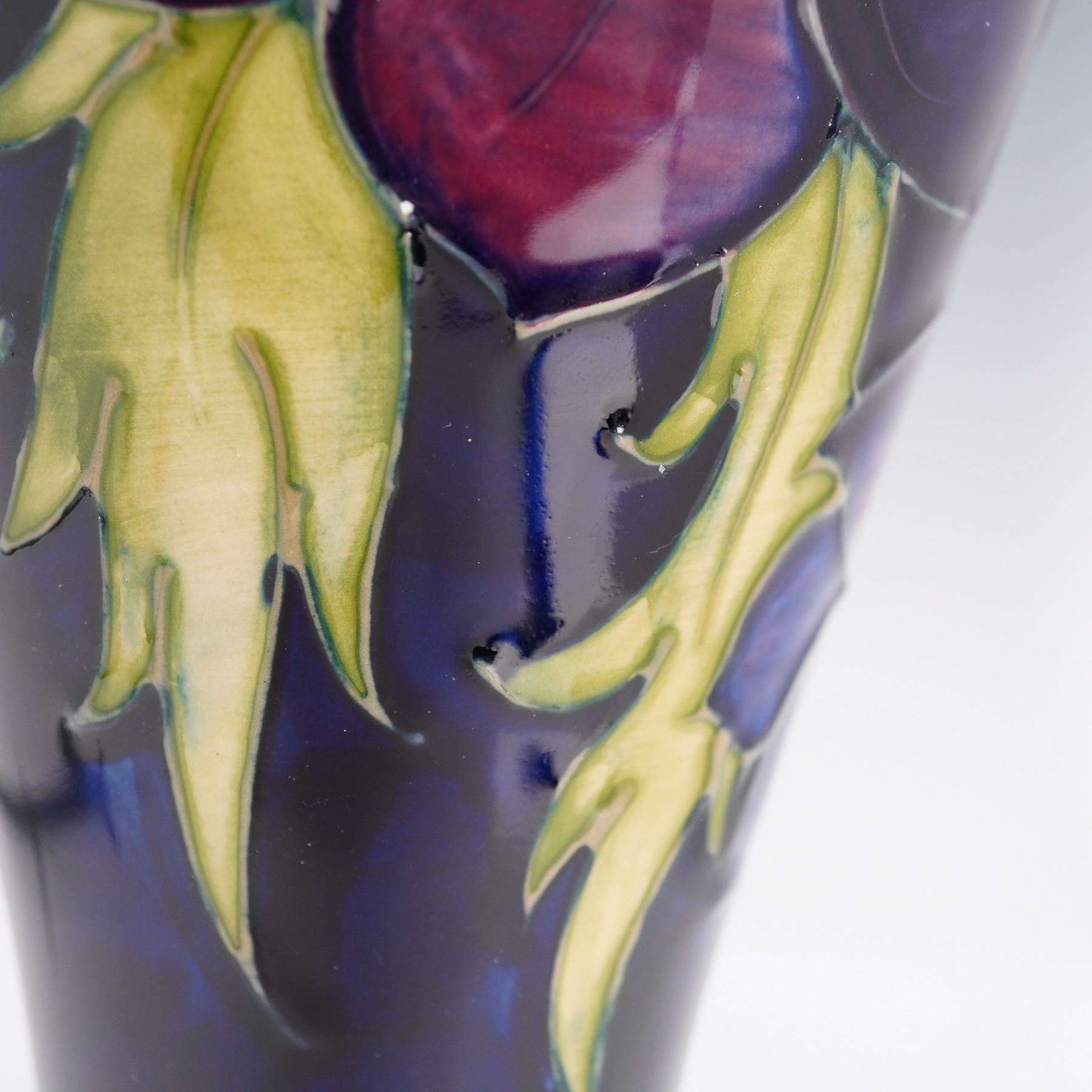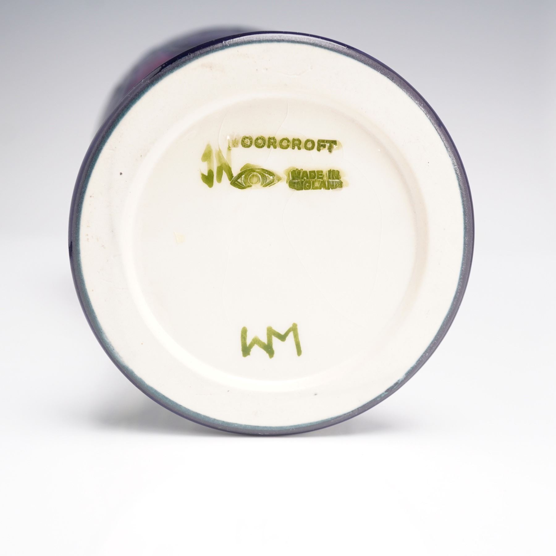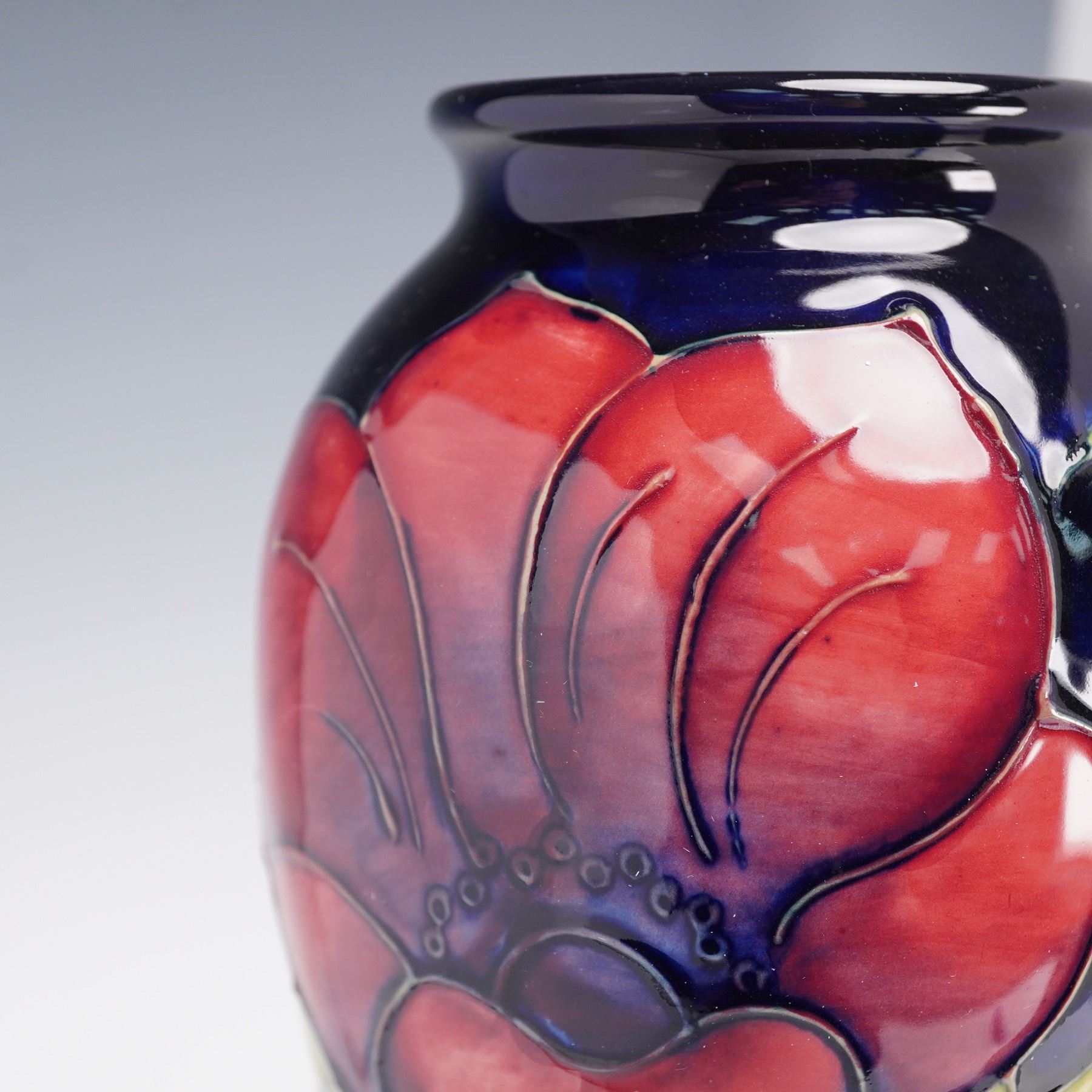 Featuring the Anemone pattern on a cobalt-blue ground with raised and tube-lined decoration in red, purple, and green glazes. The tall baluster form vase has a flared base and narrow rim. The underside bears the impressed Moorcroft stamp, along with the WM monogram. On the underside, the vase carries the Moorcroft 'eye' year cypher, indicating it was made in 1994. The piece is accompanied by its original Moorcroft presentation box.