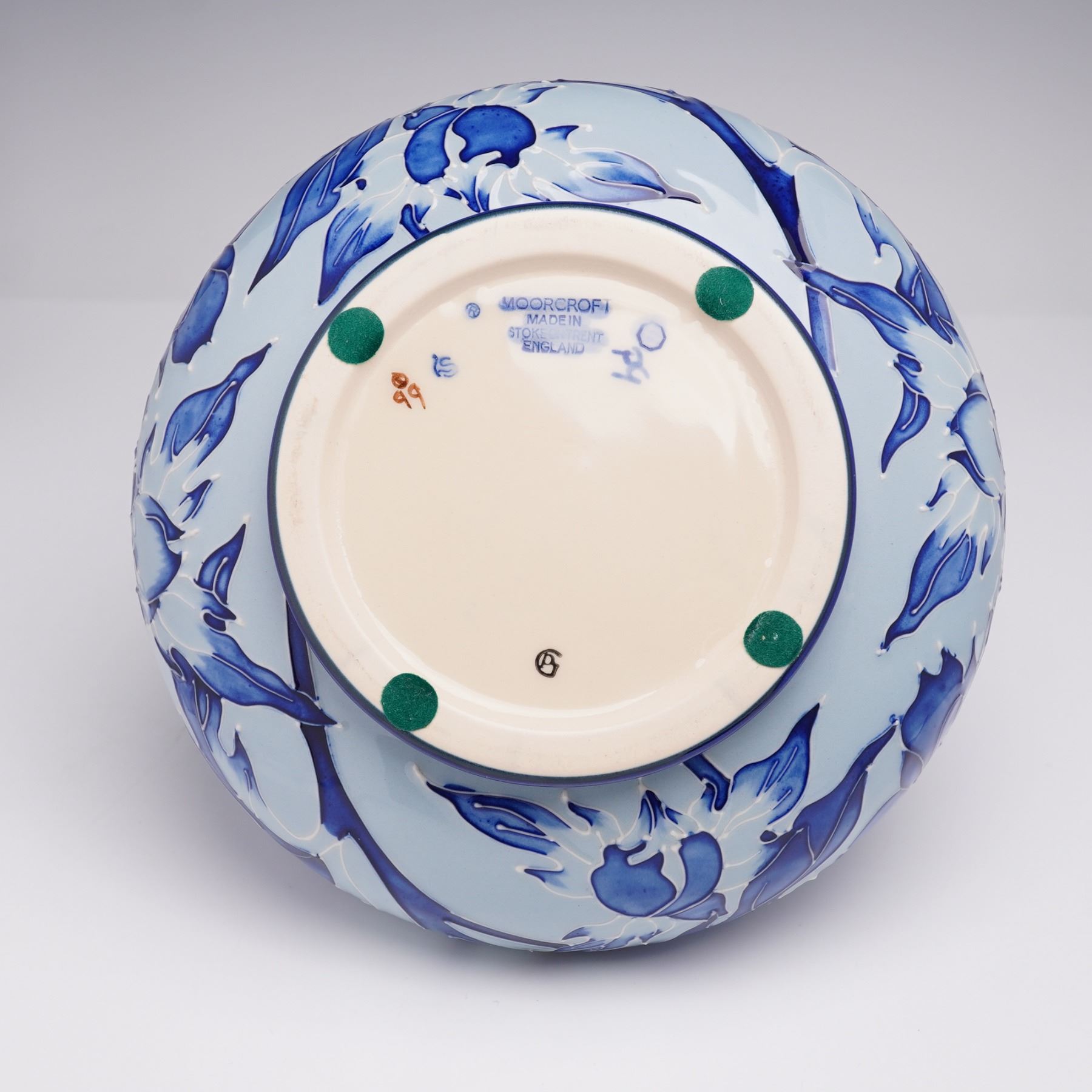 This stunning Moorcroft vase features the Blue on Blue Peony pattern, designed by Philip Gibson. The elegant design showcases beautiful peony blossoms in varying shades of blue, enhanced by the signature tube-lining technique. The vibrant blue floral patterns are set against a softer background, creating a striking contrast. The piece reflects the exquisite craftsmanship and artistry of Moorcroft, with each detail carefully hand-painted. The vase is marked with the Moorcroft backstamp, "Made in England," and "Stoke on Trent," indicative of the company's continued legacy of fine pottery design.