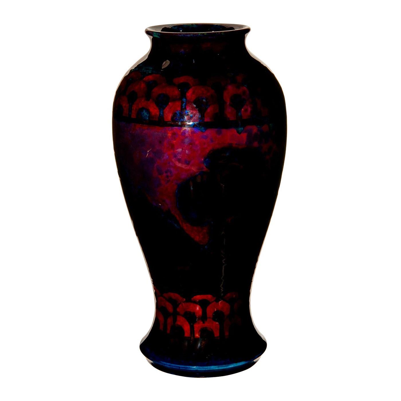 Very rare Flambe Dawn with fish scale borders. Baluster form ceramic vase decorated with tubelined trees and mountains encircling body. Moorcroft. backstamp. Minor scratches.