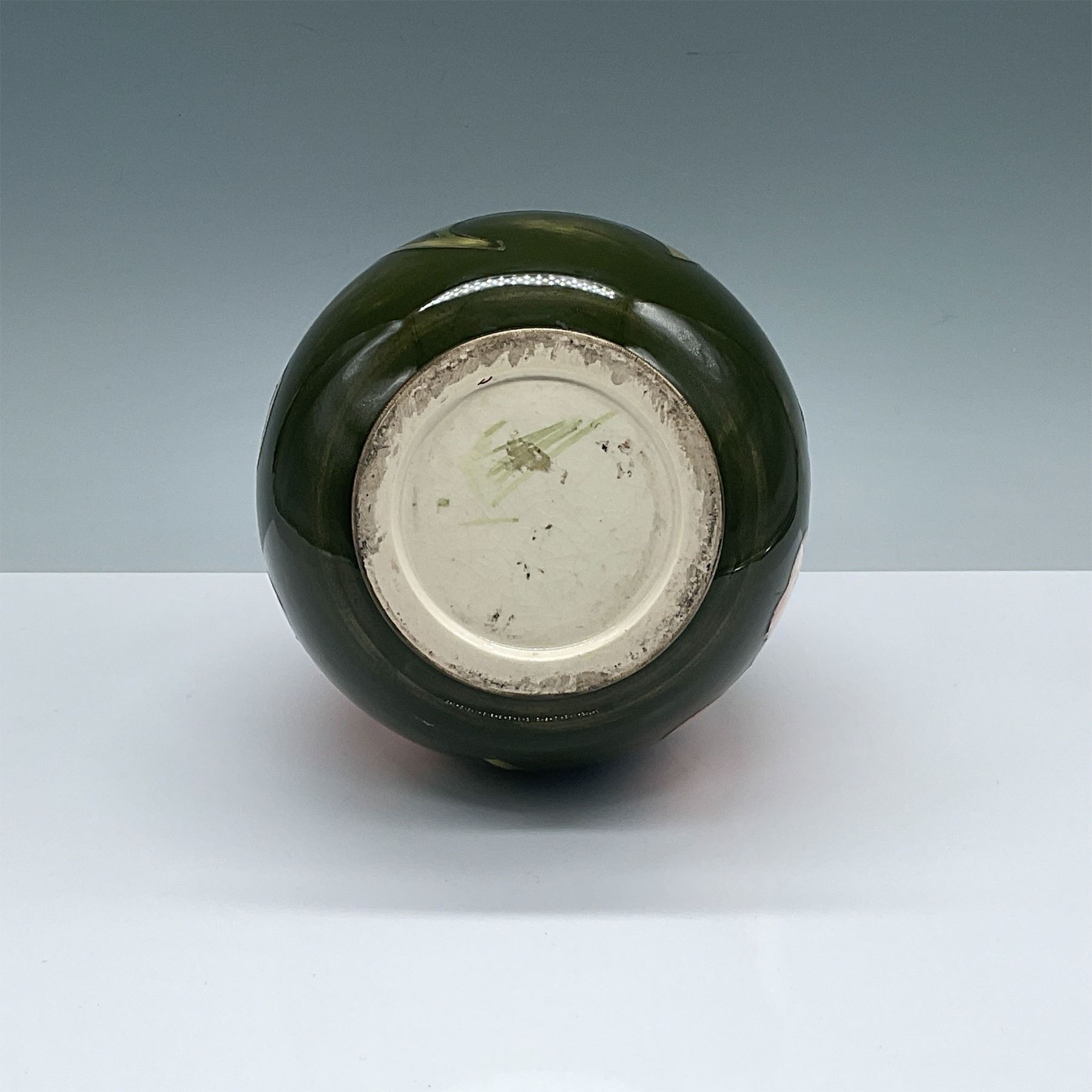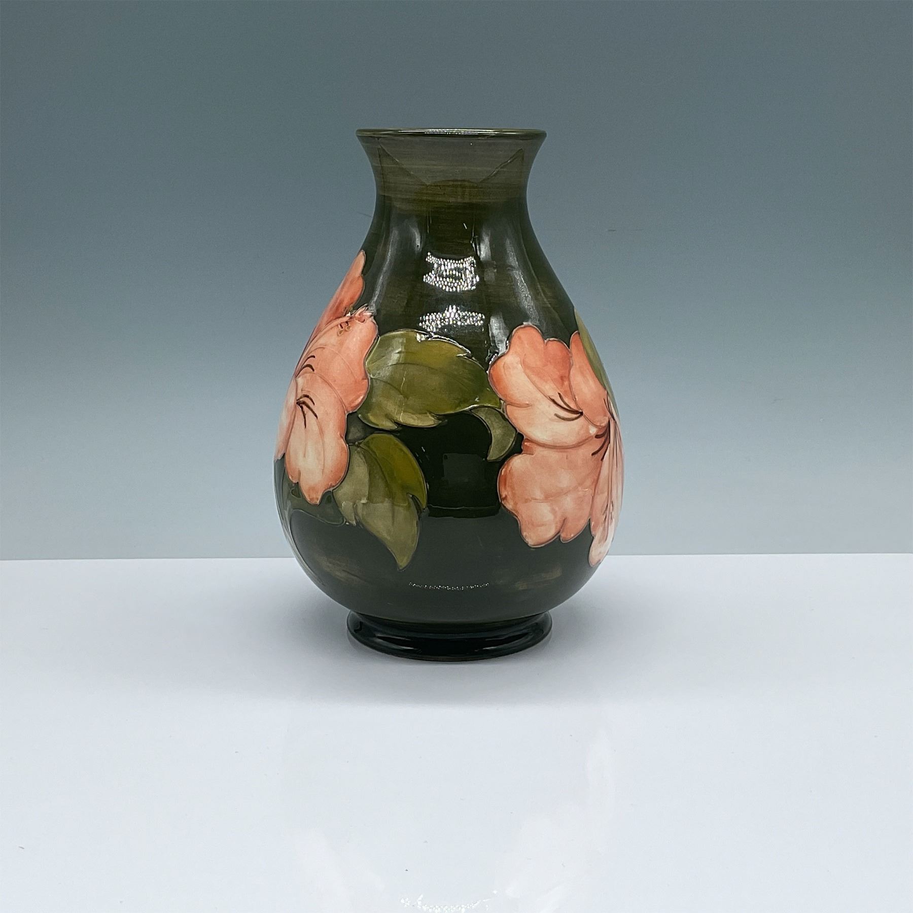 Moorcroft pottery vase featuring the iconic hibiscus design, hand-decorated with vibrant pink blossoms against a deep green glaze. Known for its impeccable craftsmanship, Moorcroft pieces are celebrated for their unique tube-lining technique and vibrant colors. This vase exhibits the signature artistry, with no visible cracks or chips. The base is marked, indicating its authenticity. Circa mid-20th century. A beautiful addition to any collection of fine art pottery.