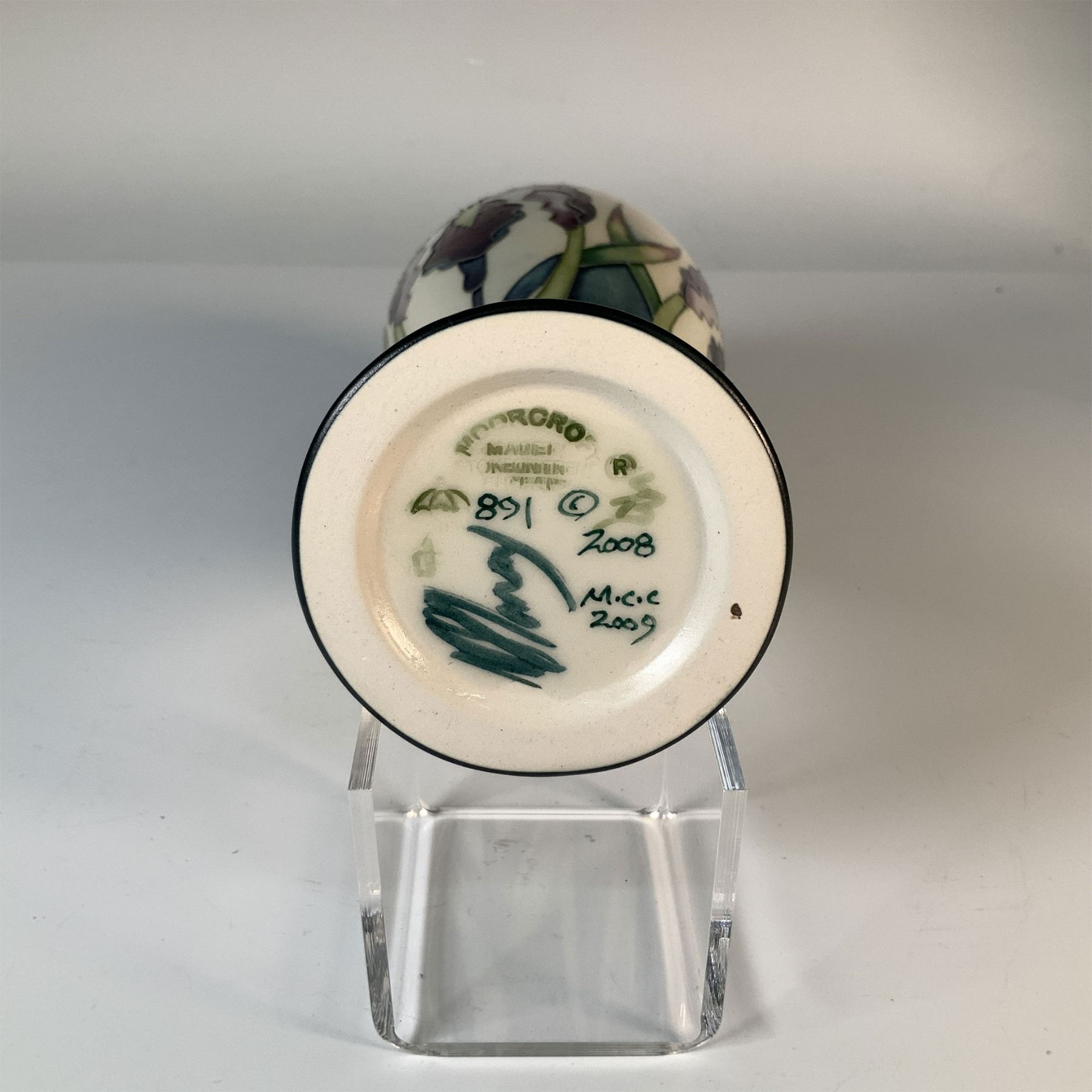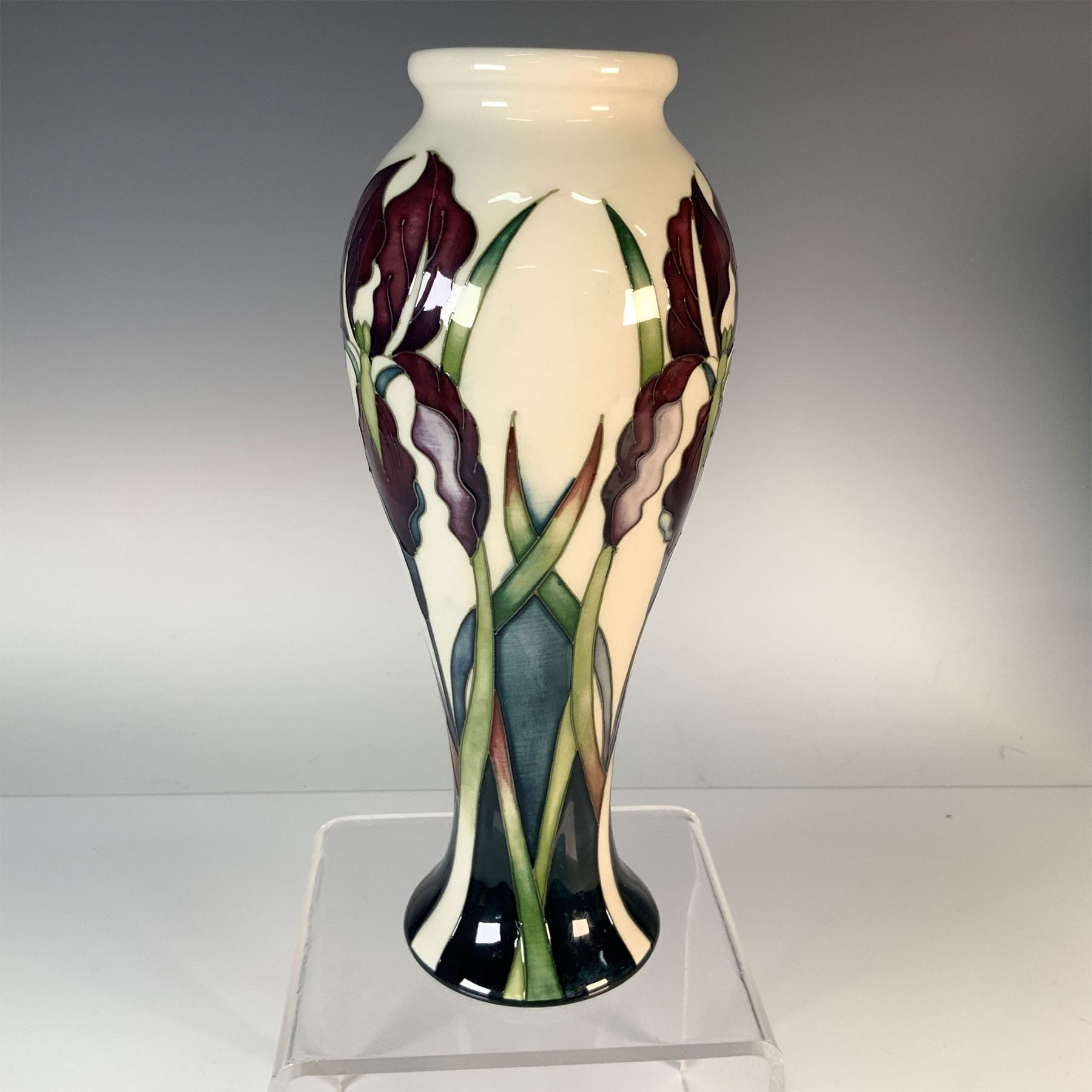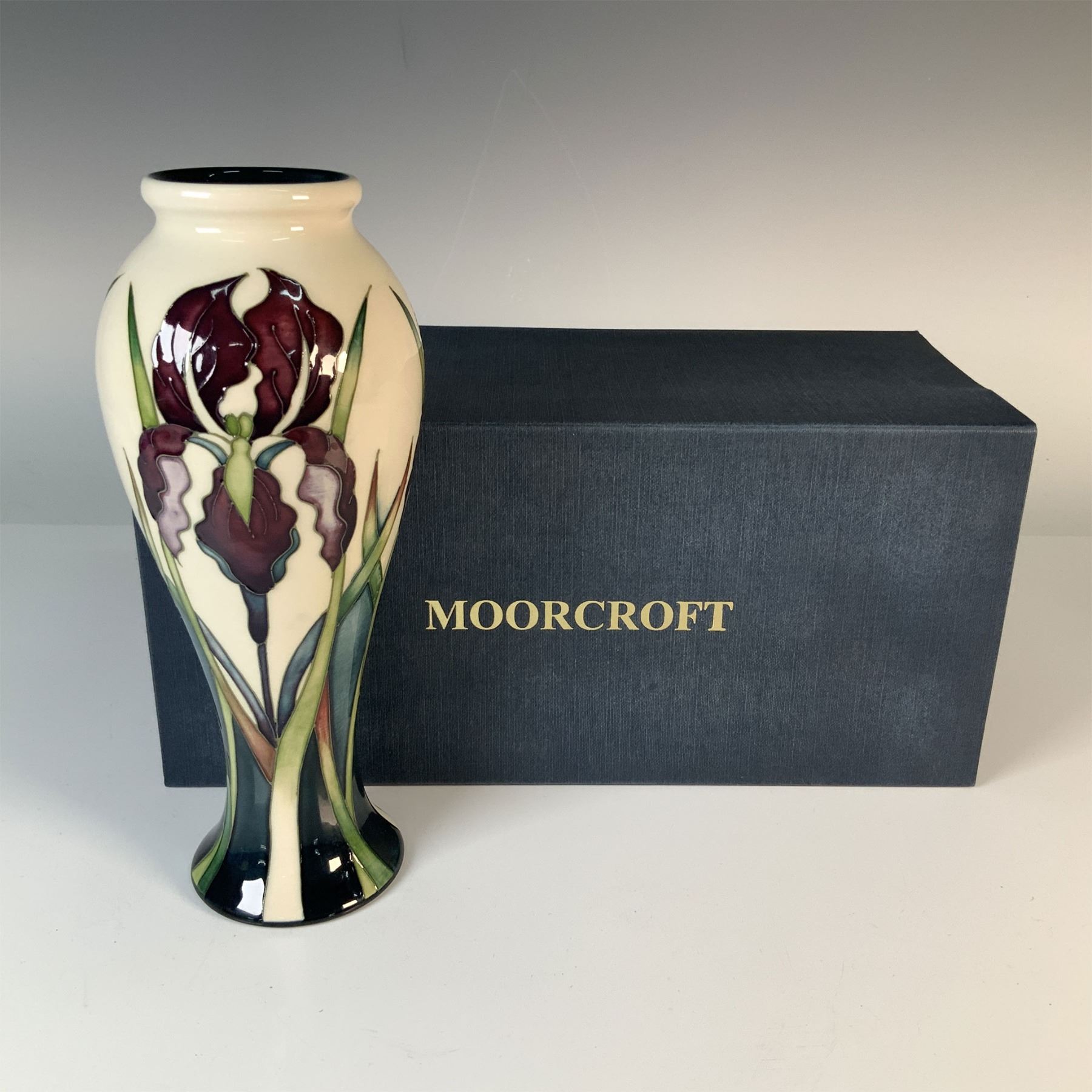 This is a Moorcroft pottery vase featuring the elegant and iconic Iris pattern in deep burgundy and green hues, accented by soft cream tones. Handcrafted and hand-painted, this vase showcases Moorcroft's distinctive tube-lining technique, celebrated for its quality and artistry since 1897. The piece measures 8.5 inches in height and bears the maker's marks and date of 2008 at the base. It comes with its original Moorcroft box, adding to its value and desirability for collectors. Moorcroft, a renowned English pottery maker known for its rich history of creating exceptional ceramic art pieces.