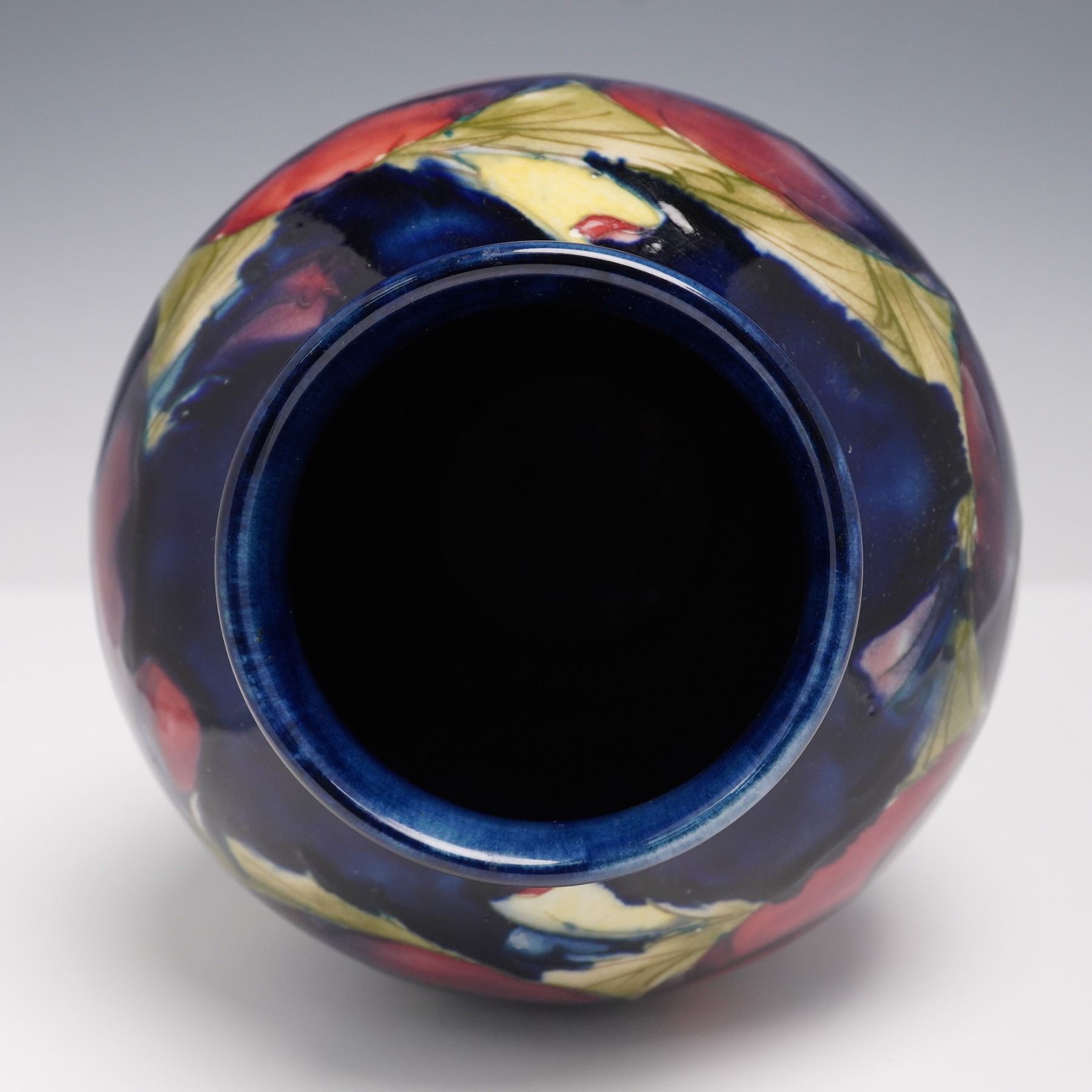 This stunning Moorcroft vase features the Pansy pattern, showcasing vibrant hand-painted blooms in rich tones of purple, red, and yellow. The deep blue background enhances the vivid florals, creating a striking contrast that highlights the beauty of each petal and leaf. The piece exemplifies the signature tube-lining technique characteristic of the Florian style, with raised slip outlines and translucent glazes that create a glowing effect. Marked with the Moorcroft backstamp and the "Made in England" mark, this vase is a fine example of Moorcroft's craftsmanship from the 1960s.