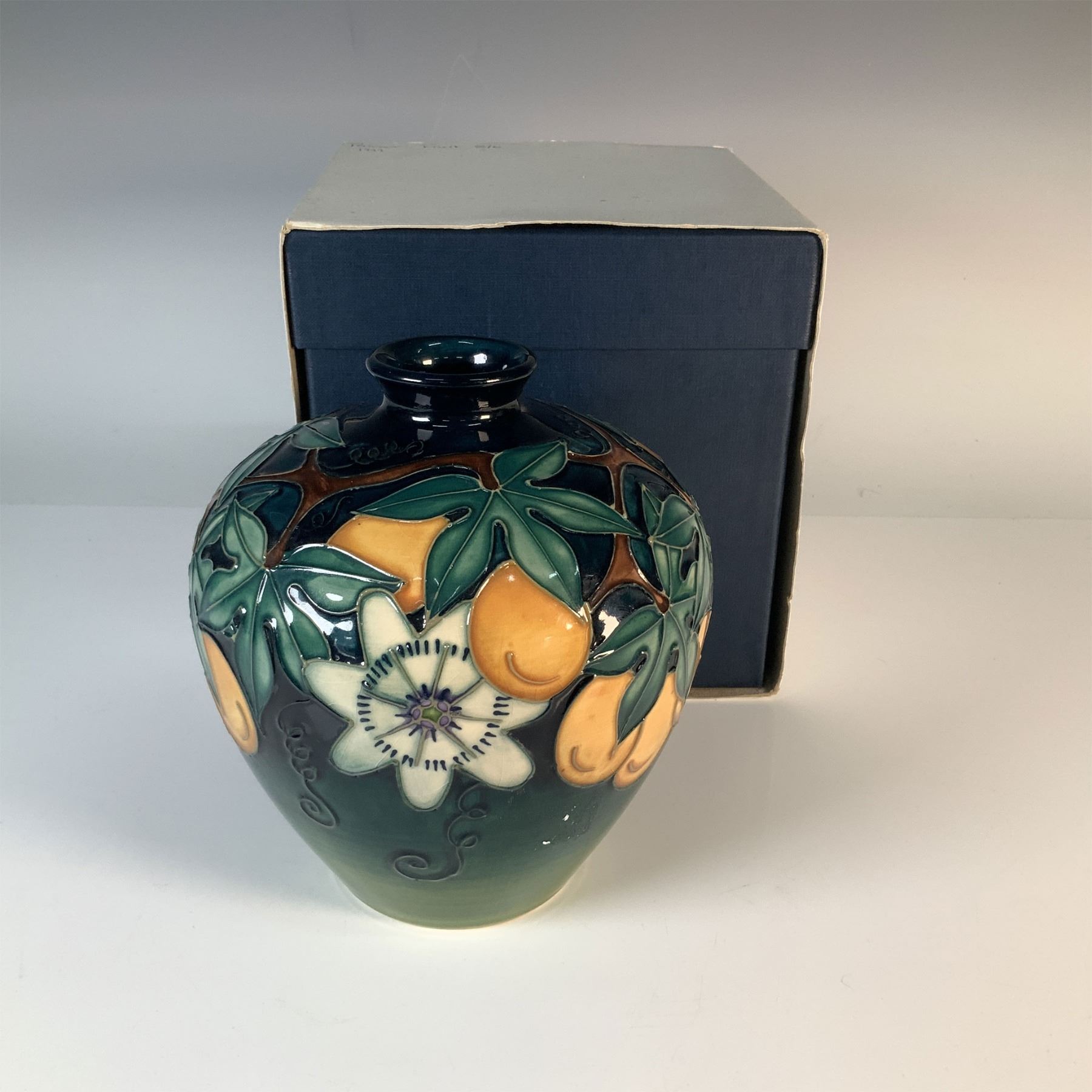 A remarkable Moorcroft pottery vase from 1999, featuring the vibrant and detailed Passion Fruit design. This hand-painted vase showcases bold tones of orange, green, and white, with intricate tube-lining highlighting the passion fruit motif. Finished with a high-gloss glaze, this piece embodies the elegance and craftsmanship of Moorcroft pottery. The base bears Moorcroft's hallmark and date stamp for authenticity. Accompanied by its original Moorcroft presentation box. Founded in 1897, Moorcroft is a renowned British pottery manufacturer celebrated for its hand-crafted and hand-painted ceramic pieces. The Passion Fruit design is a testament to Moorcroft's tradition of combining artistic excellence with innovative design.