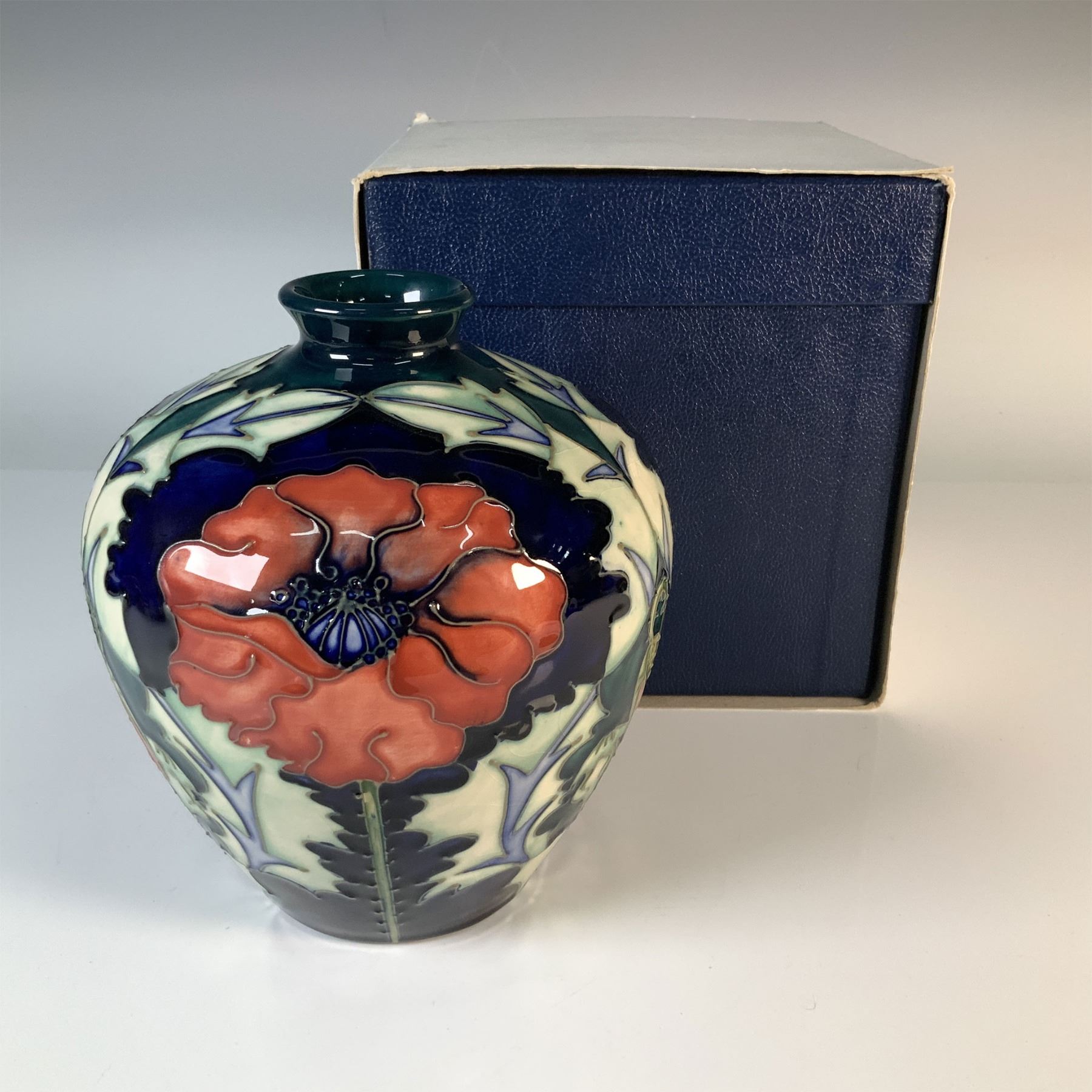 A stunning Moorcroft pottery vase featuring the vibrant poppy design, characterized by its bold red flowers and intricate detailing against a dark and light-toned background. This handcrafted and hand-painted vase showcases the exceptional artistry and quality for which Moorcroft is renowned. The vase measures 7 inches in height and bears the Moorcroft backstamp and artists monogram on the base, confirming its authenticity. Accompanied by its original presentation box, this vase is a timeless piece suitable for collectors and admirers of fine ceramics. This item has its original box.