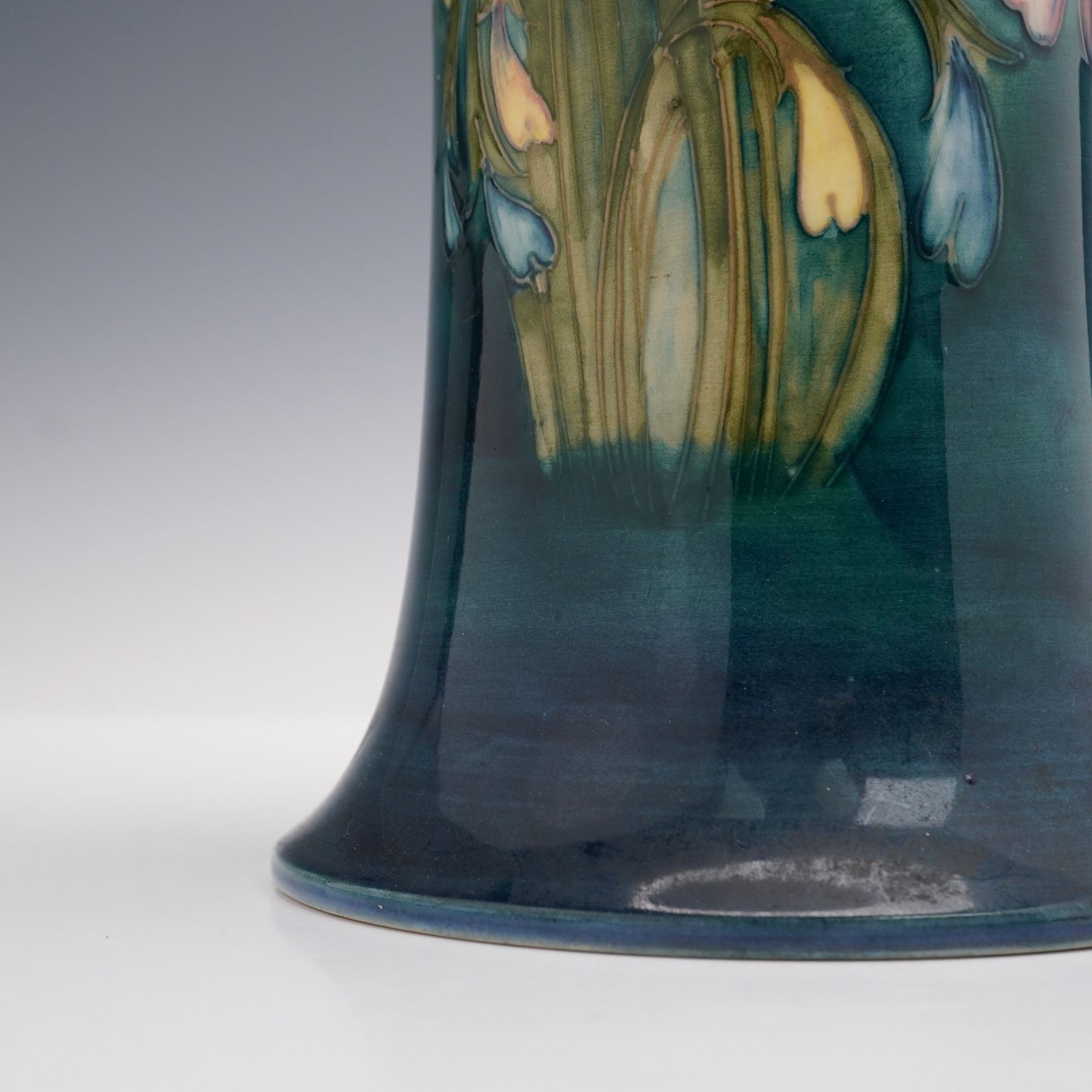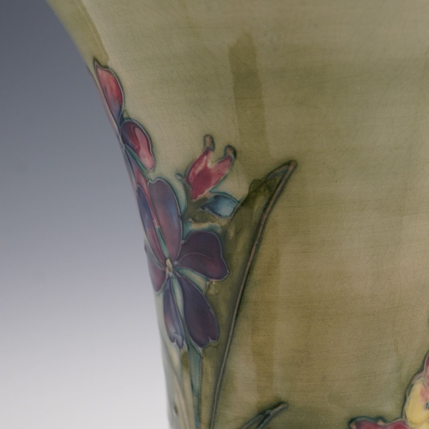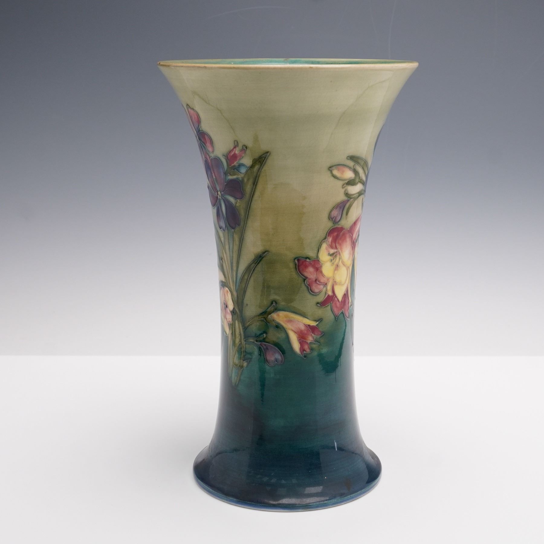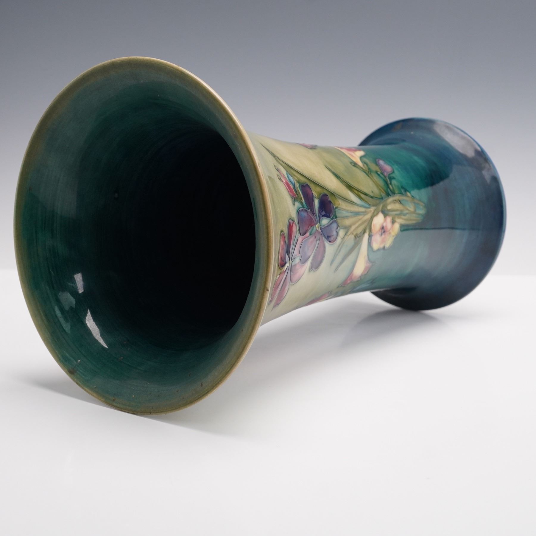 This tall vase shows blossoms in purple yellow pink and blue rising among soft green leaves against a ground that shifts from light celadon to deep teal. The flaring rim and glossy surface enhance the vivid colors and graceful shape. Marked Moorcroft. Artist signature.