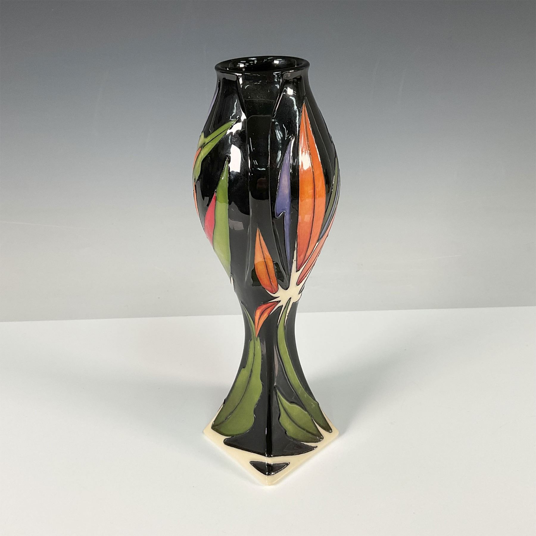 This striking double-handled vase, designed by renowned artist Anji Davenport, features the vibrant and exotic Paradise Found pattern. The design showcases a bold depiction of Bird of Paradise flowers with vivid orange, green, and purple tones, set against a glossy black ground. The elegant double handles and tapered form add a sophisticated touch, making this piece a standout example of Moorcroft's contemporary artistry. Moorcroft marked. Artist signed.