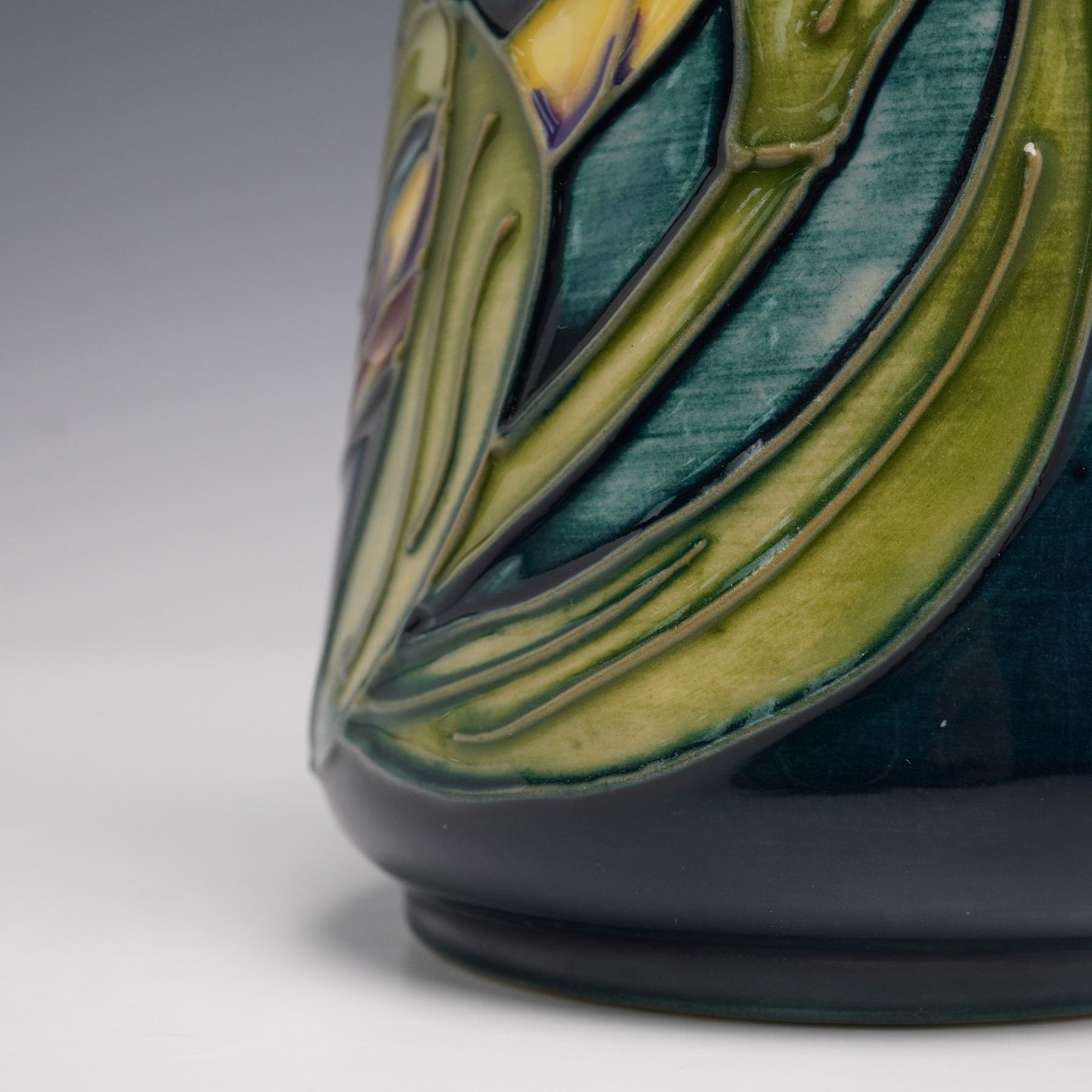 Elegantly decorated with intricately tube lined iris blossoms in shades of purple, lavender, and crimson with golden highlights, set amidst elongated green leaves that flow gracefully across the surface against a pale cream and deep teal ground. Designed for the Moorcroft Collectors Club. Marked "2101" and the year "96". Moorcroft impressed backstamp.