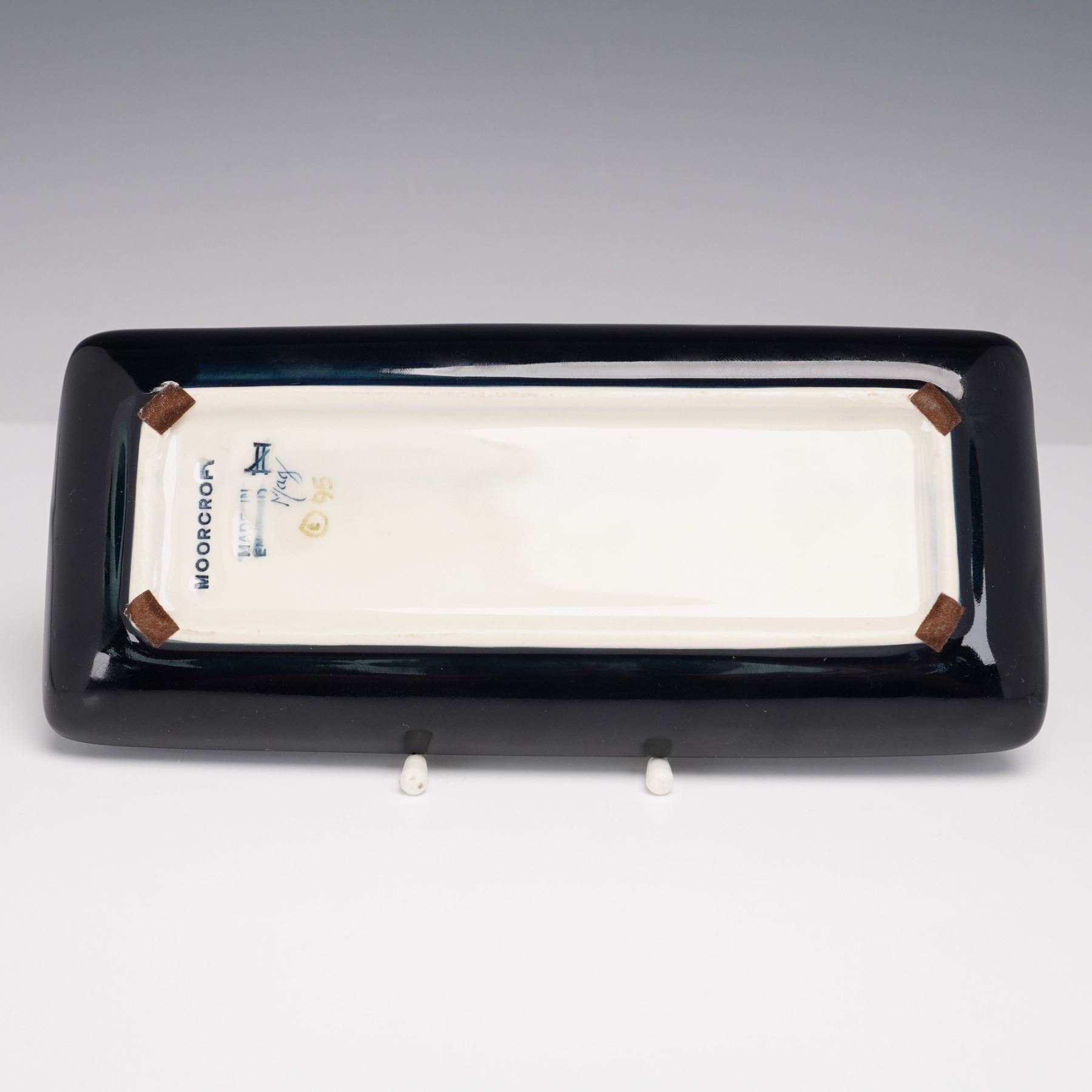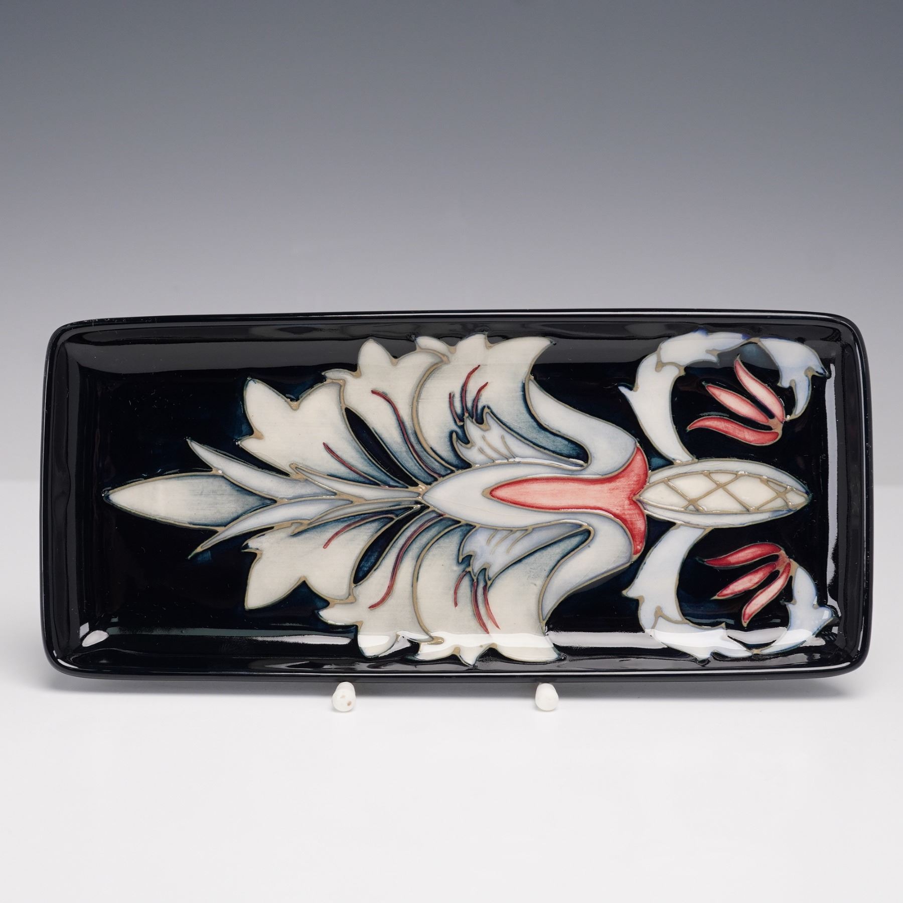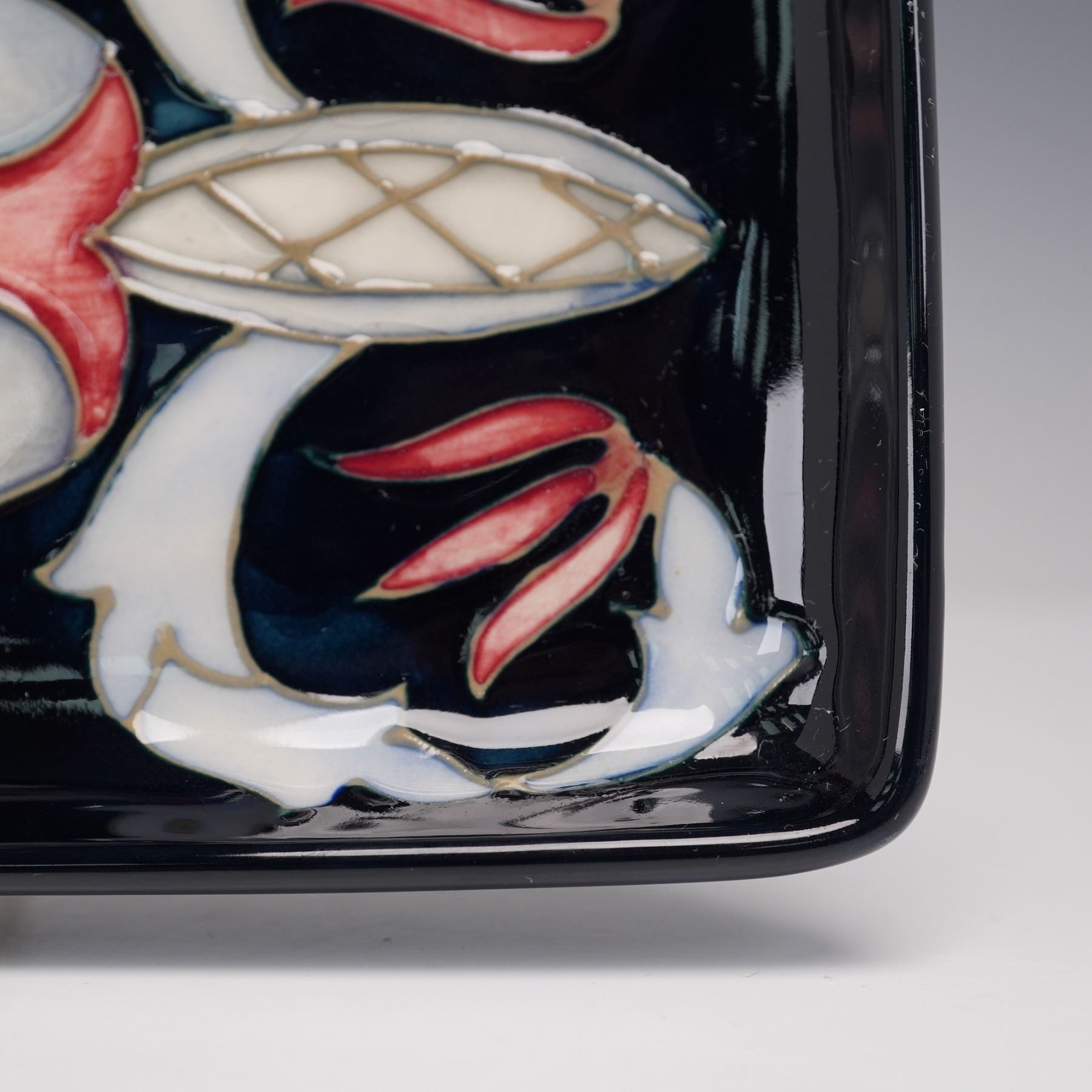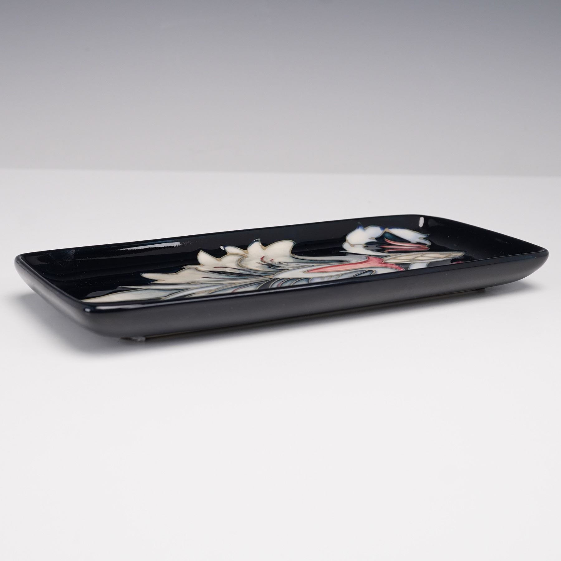 Lovely tray of rectangular shape decorated with the distinctive Snakes Head fritillary motif. The hand-tubed design features the iconic pendulous flowers with their chequered petals in soft tones of red and cream, set against a contrasting dark ground. Marked "Mag" and "95" for the year. Moorcroft impressed backstamp.