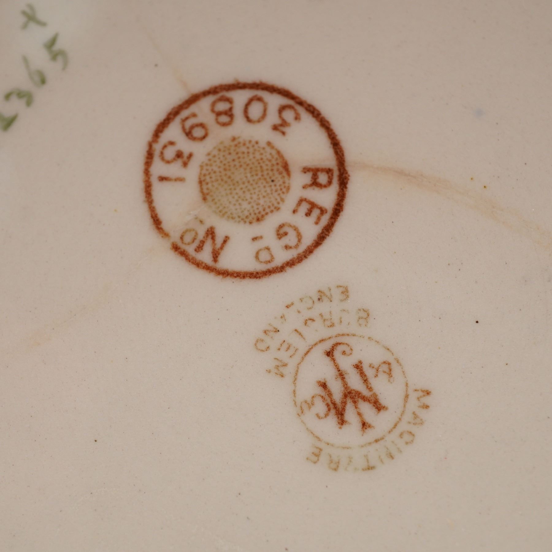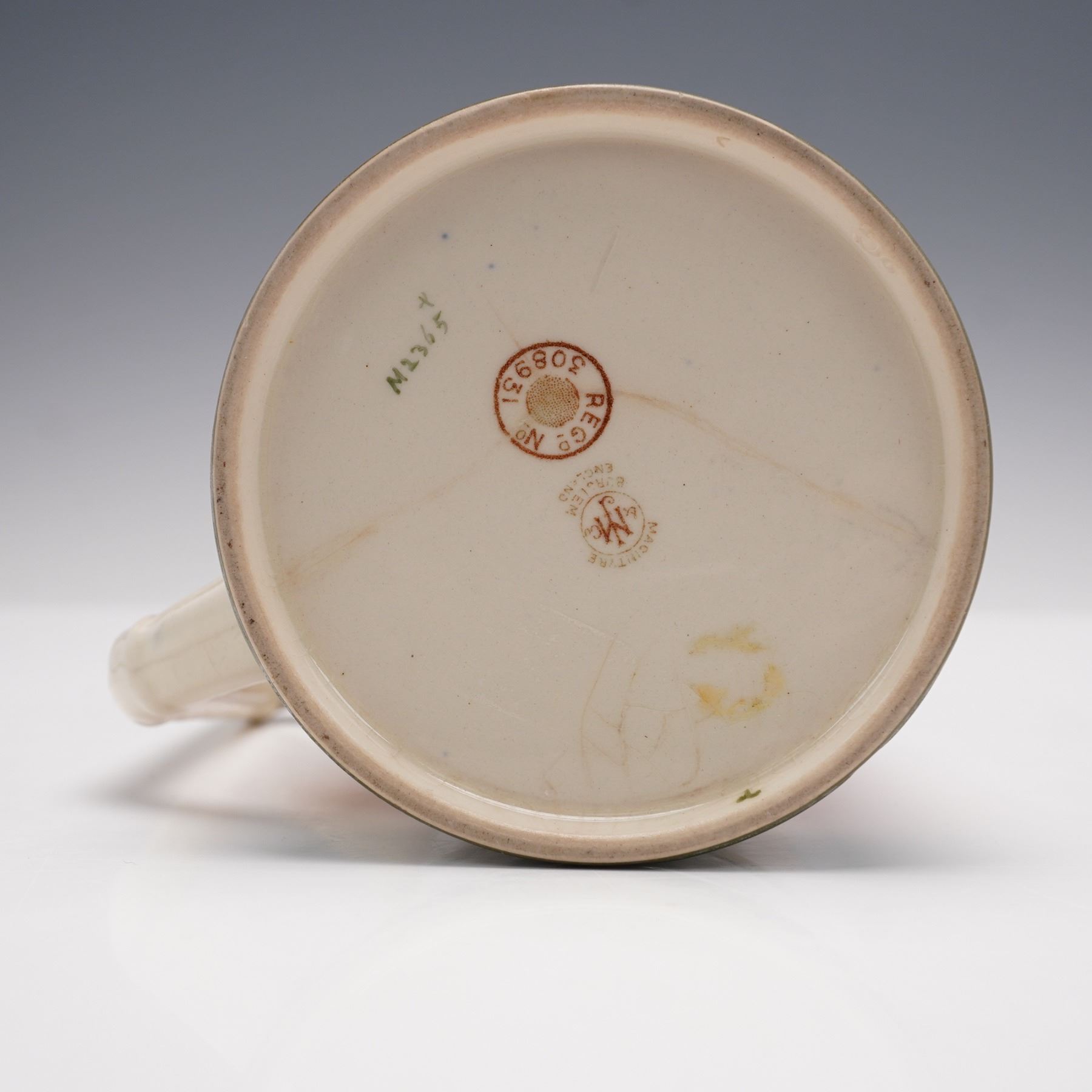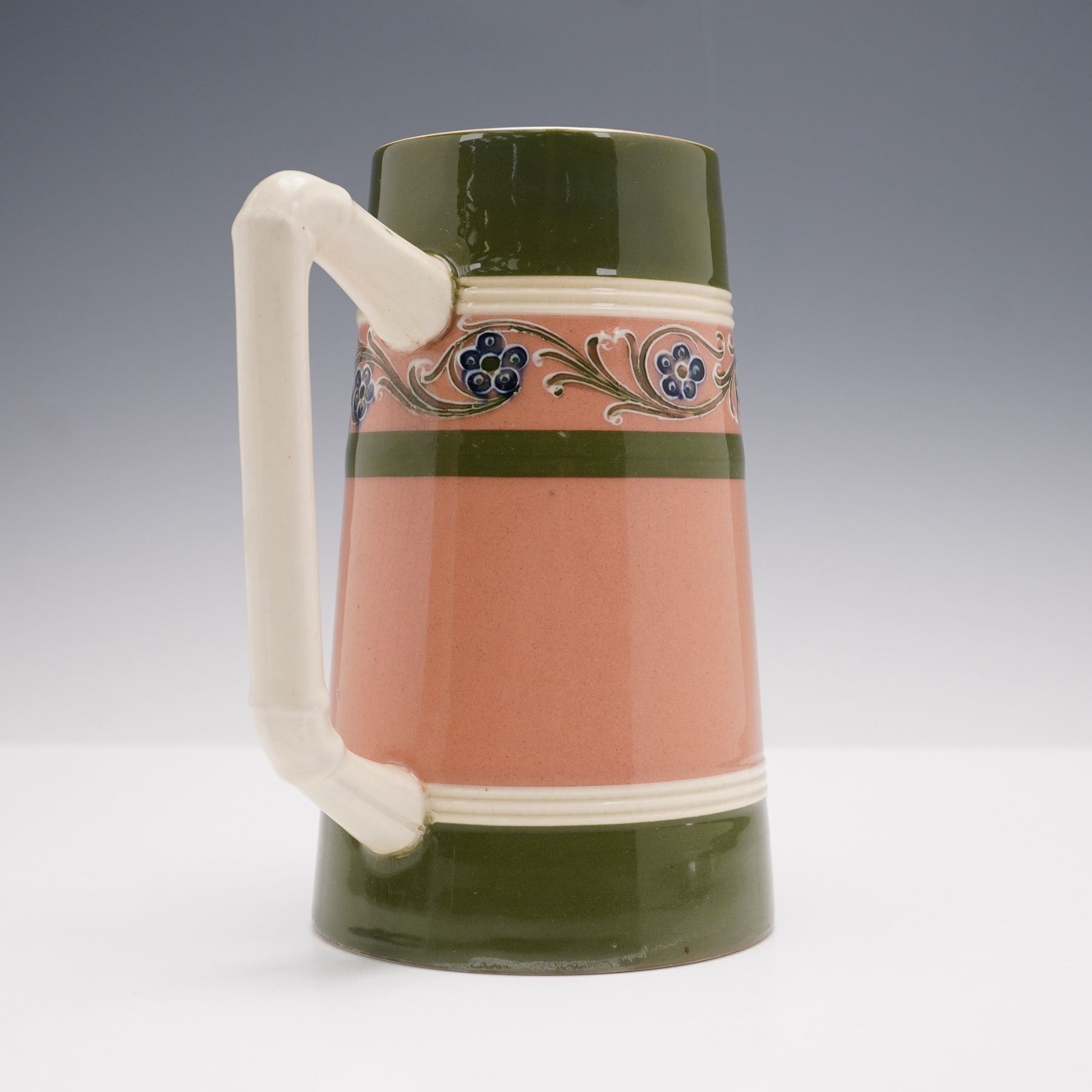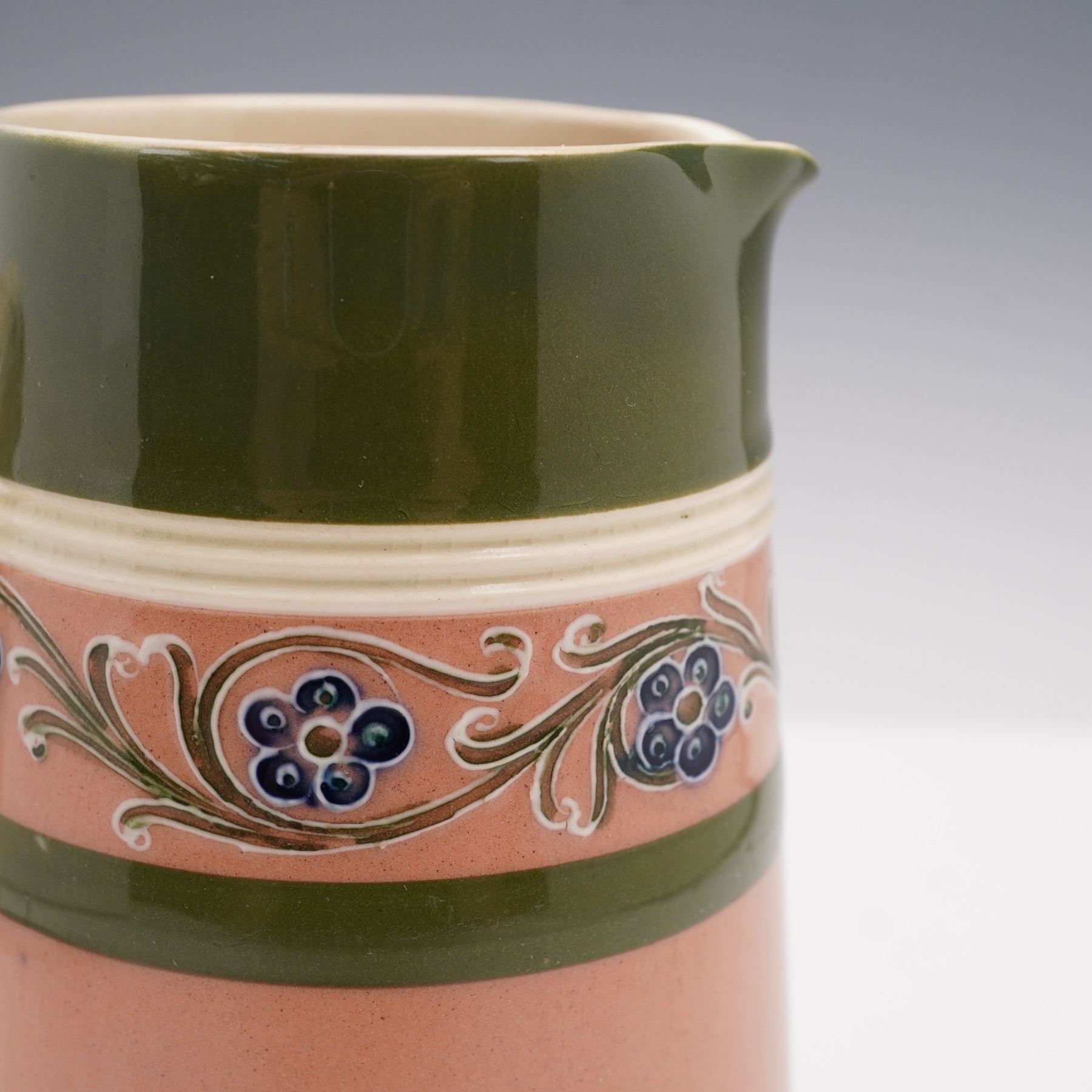 A pitcher of tapering cylindrical form with angular handle, decorated in early Florian style with a band of scrolling foliate ornament and stylized berry clusters in shades of blue and green against a blush-pink ground, bordered by olive-green panels.. James Macintyre Co backstamp.